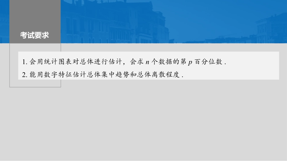§9.2用样本估计总体第九章统计与成对数据的统计分析1.会用统计图表对总体进行估计,会求n个数据的第p百分位数.2.能用数字特征估计总体集中趋势和总体离散程度.考试要求内容索引第一部分第二部分第三部分落实主干知识探究核心题型课时精练落实主干知识第一部分知识梳理1.百分位数一般地,一据的第组数p百分位是一,使得据中至数这样个值它这组数少有___的据小于或等于,且至少有数这个值(100-p)%的据数___________这个值.2.平均、中位和数数众数(1)平均:=数_________________.1n(x1+x2+…+xn)大于或等于p%x知识梳理(2)中位:一据按小到大或大到小的序排列,在最数将组数从从顺处____的一据个数(据是奇当数个数数时)或最中据的间两个数(当数据是偶个数数时).(3):一据中出次众数组数现数的据数(即最大所的频数值对应样本据数).中间平均数最多知识梳理(1)方差:s2=____________或1ni=1nx2i-x2.3.方差和准差标1ni=1n(xi-x)21ni=1nxi-x2(2)准差:标s=________________.知识梳理4.体总(本样)方差和体总(本样)准差标(1)一般式:如果体中所有体的量分总个变值别为Y1,Y2,…,YN,总体(2)加式:如果体的权总N量中,不同的共有个变值值k(k≤N),不妨个记为Y1,Y2,…,Yk,其中Yi出的现频数为fi(i=1,2,…,k),则体方差总为平均数为Y,体方差则总S2=1Ni=1N(Yi-Y)2.S2=1Ni=1kfi(Yi-Y)2.常用结论2.据数x1,x2,…,xn据与数x1′=x1+a,x2′=x2+a,…,xn′=xn+a的方差相等,即据平移后方差不数经过变.3.若x1,x2,…,xn的方差为s2,那么ax1+b,ax2+b,…,axn+b的方差为a2s2.1.若x1,x2,…,xn的平均数为x,那么mx1+a,mx2+a,…,mxn+a的平均数为mx+a.思考辨析判下列是否正确断结论(在括中打请号“√”或“×”)(1)一据,平均和中位是非常接近对组数来说数数总.()(2)方差准差具有相同的位与标单.()(3)如果一中每去同一非零常,的平均改,组数个数减个数则这组数数变方差不变.()(4)在率分布直方中,最高的小方形底中点的坐是频图长边横标众数.()√××√教材改编题1.若据数x1,x2,…,x9的方差为2,据则数2x1,2x2,…,2x9的方差为A.2B.4C.6D.8√根据方差的性可知,据质数x1,x2,…,x9的方差s2=2,那么数据2x1,2x2,…,2x9的方差为22s2=8.教材改编题2.某射击运动员7次的成分训练绩别为86,88,90,89,88,87,85,则这7次成的第绩80百分位数为A.88.5B.89C.91D.89.5√7次的成小到大排列训练绩从为85,86,87,88,88,89,90,7×80%=5.6,所以第80百分位小到大排列的据中的第数为从数6据,即个数89.教材改编题3.某校体育节10名旗手的身高(位:单cm)分别为175,178,176,180,179,175,176,179,180,179,中位则数为________.178.5把10名旗手的身高小到大排列从为175,175,176,176,178,179,179,179,180,180,则178+1792=178.5,所以所求中位数为178.5.探究核心题型第二部分据数92出了现3次,出的次最多,所以是现数众数92;据已这组数按照由小到大的序排列,算经顺计10×25%=2.5,取第三,所个数以第25百分位是数88.例1(1)某中抽取从学10名同,他的成如下:学们数学绩82,85,88,90,92,92,92,96,96,98(位:分单),则这10名同成的、第学数学绩众数25百分位分数别为A.92,85B.92,88C.95,88D.96,85√题型一样本的数字特征和百分位数的估计延伸探究本例中,第70百分位是多少?数10×70%=7,第70百分位是第数7第项与8的平均,项数为92+962=94.(2)(多选)(2023·哈尔模滨拟)下面是某城市某日在不同点粒观测对细颗物(PM2.5)的:观测值396275268225168166176173188168141157若在此据中增加一比有的最大大组数个现值25的据,下列字特征数数生改的是发变A.差极B.中位数C.众数D.平均数√√√根据意,若在此据中增加一比有的最大大题组数个现值25的据,数即最大值变为396+25=421,差最大最小的差,要极为值与值发生改;变加入据前,中位数数为12×(173+176)=174.5,加入据后,中位数数为176,生改;发变据中出次最多的,不改;众数为数现数数会变若加入据前,平均数数为x,加入据后,平均数数为12x+42113>x,生改发变.思维升华算一计组n据第个数p百分位...