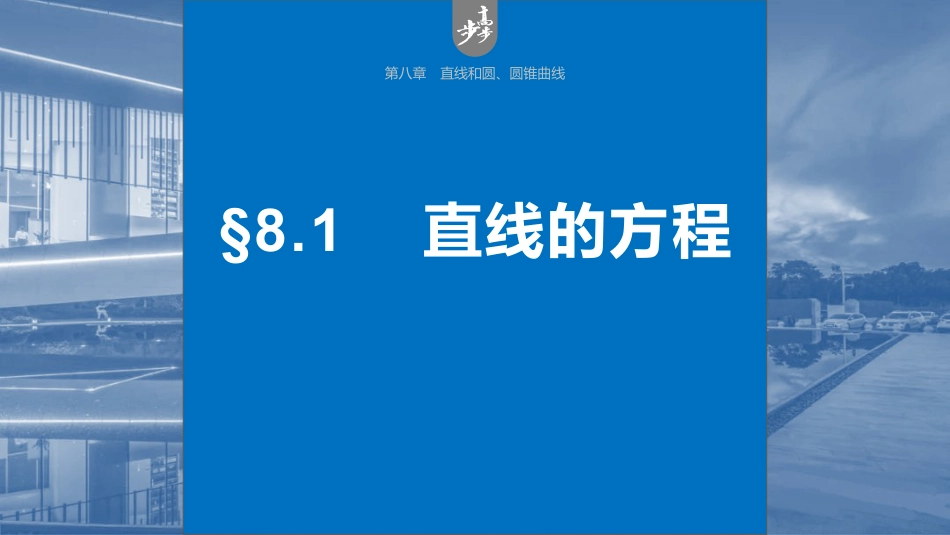 §8.1直线的方程第八章直线和圆、圆锥曲线1.理解直线的倾斜角和斜率的概念,掌握过两点的直线斜率的计算公式.2.根据确定直线位置的几何要素,掌握直线方程的几种形式(点斜式、斜截式、两点式、截距式及一般式).考试要求内容索引第一部分第二部分第三部分落实主干知识探究核心题型课时精练落实主干知识第一部分知识梳理1.直的方向向量线设A,B直上的点,为线两则_____就是直的方向向量这条线.2.直的斜角线倾(1)定:直义当线l与x相交,我以轴时们x基准,轴为_______直与线l_____的方向之所成的角间α叫做直线l的斜角倾.(2)范:直的斜角围线倾α的取范值围为_____________.AB→x正向轴向上0°≤α<180°知识梳理3.直的斜率线(1)定:把一直的斜角义条线倾α的_______叫做直的斜率这条线.斜率常用小字母写k表示,即k=______(α≠90°).(2)点的直的斜率公式过两线正切值tanα如果直点线经过两P1(x1,y1),P2(x2,y2)(x1≠x2),其斜率k=_______.y2-y1x2-x1知识梳理4.直方程的五形式线种名称方程适用范围点斜式_______________不含直线x=x0斜截式__________不含垂直于x的直轴线点式两__________________________不含直线x=x1和直线y=y1截距式__________不含垂直于坐和原点的标轴过直线一般式________________________平面直角坐系的直都适用标内线y-y0=k(x-x0)y=kx+by-y1y2-y1=x-x1x2-x1(x1≠x2,y1≠y2)xa+yb=1Ax+By+C=0(A2+B2≠0)常用结论1.直的斜率线k斜角与倾α之的系间关α0°0°<α<90°90°90°<α<180°k0k>0不存在k<0牢口:记诀“斜率化分段,变两90°是分界;线遇到斜率要,存在否要谨记与讨论”.常用结论2.“截距”是直坐交点的坐,可正,可,也线与标轴标值它负可以是零,而“距离”是一非个负数.注意原点的特殊情应过况是否足意满题.3.直线Ax+By+C=0(A2+B2≠0)的一方向向量个a=(-B,A).思考辨析判下列是否正确断结论(在括中打请号“√”或“×”)(1)坐平面的任何一直均有斜角斜率标内条线倾与.()(2)直的斜率越大,斜角就越大线倾.()(3)若直的斜角线倾为α,斜率则为tanα.()(4)直线y=kx-2恒定点过(0,-2).()×××√教材改编题A.30°B.60°C.120°D.150°√1.已知点A(2,0),B(3,3),直则线AB的斜角倾为由意得直题线AB的斜率k=3-03-2=3,直设线AB的斜角倾为α,则tanα=3, 0°≤α<180°,∴α=60°.教材改编题2.已知直线l点过(1,1),且斜角倾为90°,直则线l的方程为A.x+y=1B.x-y=1C.y=1D.x=1因直为线l的斜角倾为90°,所以直无斜率,该线与x垂直,又因直轴为线l点过(1,1),所以直线l的方程为x=1.√教材改编题3.点过P(2,3)且在坐上截距相等的直方程两标轴线为______________________.3x-2y=0或x+y-5截距当为0,直方程时线为3x-2y=0;截距不当为0,时=0设直方程线为xa+ya=1,则2a+3a=1,解得a=5.所以直方程线为x+y-5=0.探究核心题型第二部分题型一直线的倾斜角与斜率例1(1)若直线l点过P(1,0),且以与A(2,1),B(0,3)端点的段为线有公共点,直则线l的斜率的取范是值围A.[-3,1]B.(-∞,-3]∪[1,+∞)C.-33,1D.-∞,-33∪[1,+∞)√如,直图当线l点过B,直时设线l的斜率为k1,则k1=3-00-1=-3;直当线l点过A,时直设线l的斜率为k2,则k2=1-02-1=1,所以要使直线l段与线AB有公共点,直则线l的斜率的取范是值围(-∞,-3]∪[1,+∞).(2)直线2xcosα-y-3=0α∈π6,π3的斜角的化范是倾变围A.π6,π3B.π4,π3C.π4,π2D.π4,2π3√直线2xcosα-y-3=0的斜率k=2cosα.由于α∈π6,π3,所以12≤cosα≤32,因此k=2cosα∈[1,3].直的斜角设线倾为θ,有则tanθ∈[1,3].由于θ∈[0,π),所以θ∈π4,π3,即斜角的化范是倾变围π4,π3.思维升华思维升华直斜角的范是线倾围[0,π),而不是正切函的,这个区间数单调区间因此根据斜率求斜角的范,要分倾围时0,π2与...
