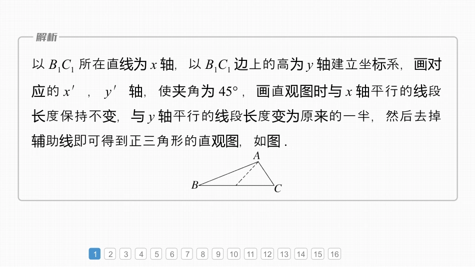 必刷小题13立体几何第七章立体几何与空间向量一、单项选择题1.如,用斜二法作水平放置的正三角形图测画A1B1C1的直,正确的形是观图则图12345678910111213141516√12345678910111213141516以B1C1所在直线为x,以轴B1C1上的高边为y建立坐系,轴标画对的应x′,y′,使角轴夹为45°,直画观图时与x平行的段轴线度保持不,长变与y平行的段度原的一半,然后去掉轴线长变为来助即可得到正三角形的直,如辅线观图图.2.下列四命中,正确的是个题A.各面都是全等四形的柱一定是正柱侧边棱棱B.角面是全等矩形的六面体一定是方体对长C.有面垂直于底面的柱一定是直柱两侧棱棱D.方体一定是直四柱长棱√1234567891011121314151612345678910111213141516于对A,底面是菱形的直平行六面体,足件但不是正柱;满条棱于对B,底面是等腰梯形的直柱,足件但不是方体;棱满条长C然;显错误方体一定是直四柱,长棱D正确.123456789101112131415163.平面外一点从P引平面相交的直,使与线P点交点的距离等于与1,足件的直可能有则满条线A.0或条1条B.0或无条数条C.1或条2条D.0或条1或无条数条点当P到平面的距离大于1,有足件的直;点时没满条线当P到平面的距离等于1,足件的直只有时满条线1;点条当P到平面的距离小于1,足件的直有无时满条线数条.√123456789101112131415164.已知m,n表示不同的直,两条线α,β表示不同的平面,下两个则列命中正确的是题A.若m∥α,n⊥β,m∥n,则α⊥βB.若m⊥n,m⊥α,n∥β,则α∥βC.若α⊥β,m⊥α,m⊥n,则n∥βD.若α⊥β,α∩β=m,n⊥m,则n⊥β√12345678910111213141516于对A,由m∥α,m∥n,得到:若n∥α,过n的平面γ∩α=l,则n∥l,又n⊥β,则l⊥β,l⊂α,则α⊥β,若n⊂α,又n⊥β,则α⊥β.上,综α⊥β,故A正确;于对B,若m⊥n,m⊥α,n∥β,则α与β相交或平行,故B错;误于对C,若α⊥β,m⊥α,m⊥n,则n与β相交、平行或n⊂β,故C;错误于对D,若α⊥β,α∩β=m,n⊥m,则n与β相交或n⊂β,故123456789101112131415165.已知直线a,b,l和平面α,β,a⊂α,b⊂β,α∩β=l,且α⊥β.于以下命,判正确的是对题断①若a,b面,异则a,b至少有一个与l相交;②若a,b垂直,则a,b至少有一个与l垂直.A.①是命,真题②是假命题B.①是假命,题②是命真题C.①是假命,题②是假命题D.①是命,真题②是命真题√12345678910111213141516于对①,若a,b都不与l相交,只有一可能,即则种a,b均平行于l,则a∥b,∴若a,b面,异则a,b至少有一个与l相交,故①正确;于对②,根据面面垂直的性定理得:质若a,b垂直,则a⊥β,或b⊥α,故a,b至少有一个与l垂直,故②正确.A.203cmB.15cmC.103cmD.20cm123456789101112131415166.(2023·徐州模拟)柱形玻璃杯中盛有高度圆为10cm的水,若放入一个玻璃球(球的半柱形玻璃杯壁的底面半相同径与圆内径)后,水恰好淹了玻璃球,玻璃球的半没则径为√12345678910111213141516根据意,玻璃球的体等于放入玻璃球后水柱的体去原水柱题积积减来的体;积玻璃球的半设径为r,即柱形玻璃杯的底面半圆径为r;放入一玻璃球后,水恰好淹玻璃球,个没则玻璃球的体积为43πr3,柱的底面面圆积为πr2,此水面的高度时为2r,所以43πr3=πr2(2r-10),解得r=15(cm).7.蹴鞠,又名蹴球,等,蹴有用脚蹴、、的含,鞠最早系外踢圆踢蹋义包皮革、米糠的球内实.因而蹴鞠就是指古人以脚蹴、、皮球的活,蹋踢动似今日的足球类.2006年5月20日,蹴鞠已作非物文化为质遗产经国务院批准列入第一批家非物文化名国质遗产录.已知某鞠的表面上有五点个P,A,B,C,D恰好成一正四构棱锥P-ABCD,若的高该棱锥为8,底面边长为,鞠的表面则该积为A.64πB.100πC.132πD.144π12345678910111213141516√4212345678910111213141516正四棱锥P-ABCD的底面是正方形,底面边长为42,高为8,如图所示,所以正四棱锥P-ABCD的底面角的对线长为42×2=8,正四外接球的半设棱锥径为R,则R2=(8-R)2+42,解得R=5,所以球的表面积为S=4π·R2=4π×25=100π,即鞠的表面该积为100π.8.某同学画“切面柱体圆”(用柱底面不平行的平面切柱,底...