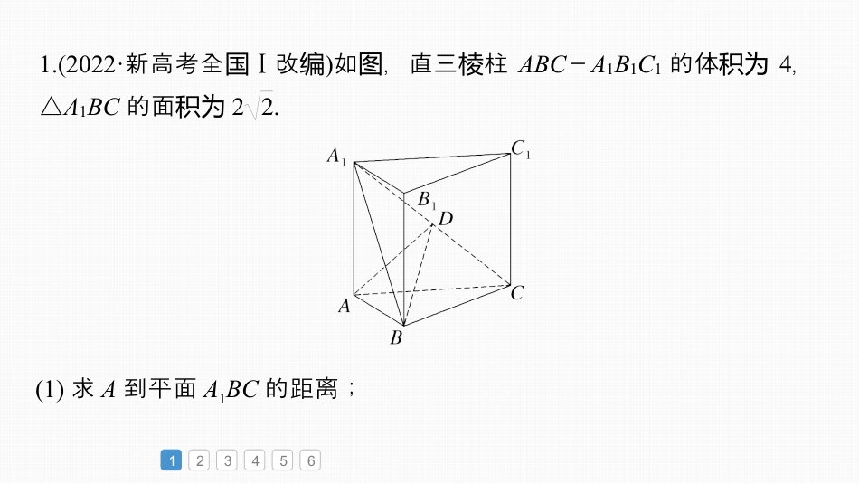 必刷大题14空间向量与立体几何第七章立体几何与空间向量1234561.(2022·新高考全国Ⅰ改编)如,直三柱图棱ABC-A1B1C1的体积为4,△A1BC的面积为22.(1)求A到平面A1BC的距离;123456点设A到平面A1BC的距离为h,因直三柱为棱ABC-A1B1C1的体积为4,所以=13S△ABC·AA11AABCV1111433ABCABCV,又△A1BC的面积为22,1113AABCABCVSh△=13×22h=43,所以h=2,即点A到平面A1BC的距离为2.123456(2)设D为A1C的中点,AA1=AB,平面A1BC⊥平面ABB1A1,求平面ABD平面与BCD角的正弦夹值.123456取A1B的中点E,接连AE,则AE⊥A1B.因平面为A1BC⊥平面ABB1A1,平面A1BC∩平面ABB1A1=A1B,AE⊂平面ABB1A1,所以AE⊥平面A1BC,又BC⊂平面A1BC,所以AE⊥BC.又AA1⊥平面ABC,BC⊂平面ABC,所以AA1⊥BC.123456因为AA1∩AE=A,AA1,AE⊂平面ABB1A1,所以BC⊥平面ABB1A1,又AB⊂平面ABB1A1,所以BC⊥AB.以B坐原点,分以为标别BC→,BA→,BB1—→的方向为x,y,z的正方向,建立如所示轴图的空直角坐系,间标由(1)知,AE=2,所以AA1=AB=2,A1B=22.123456因为△A1BC的面积为22,所以22=12·A1B·BC,所以BC=2,则BD→=(1,1,1),BA→=(0,2,0).所以A(0,2,0),B(0,0,0),C(2,0,0),A1(0,2,2),D(1,1,1),E(0,1,1),平面设ABD的法向量为n=(x,y,z),则n·BD→=0,n·BA→=0,即x+y+z=0,2y=0,123456又平面BDC的一法向量个为AE→=(0,-1,1),令x=1,得n=(1,0,-1).所以cos〈AE→,n〉=AE→·n|AE→|·|n|=-12×2=-12.平面设ABD平面与BCD的角夹为θ,则sinθ=1-cos2〈AE→,n〉=32,所以平面ABD平面与BCD角的正弦夹值为32.2.如,四图棱锥P-ABCD的底面正方形,为PA⊥平面ABCD,M是PC的中点,PA=AB.123456(1)求:证AM⊥平面PBD;123456由意知,题AB,AD,AP垂直,以两两A坐原点,为标AB,AD,AP所在直分线别为x、轴y、轴z,建立空直角坐系,轴间标如,图平面设PBD的法向量为n=(x,y,z),设PA=AB=2,则P(0,0,2),B(2,0,0),D(0,2,0),C(2,2,0),M(1,1,1),PB→=(2,0,-2),PD→=(0,2,-2),AM→=(1,1,1),则n·PB→=2x-2z=0,n·PD→=2y-2z=0,取x=1,得n=(1,1,1), AM→=n,∴AM⊥平面PBD.(2)直设线AM平面与PBD交于O,求:证AO=2OM.123456123456如,接图连AC交BD于点E,则E是AC的中点,接连PE, AM∩平面PBD=O,∴O∈AM且O∈平面PBD, AM⊂平面PAC,∴O∈平面PAC,又平面PBD∩平面PAC=PE,∴O∈PE,123456∴AM,PE的交点就是O,接连ME, M是PC的中点,∴PA∥ME,PA=2ME,∴△PAO∽△EMO,∴AO=2OM.∴PAME=AOOM=21,1234563.如,在四图棱锥P-ABCD中,PA⊥平面ABCD,AB∥CD,PA=AB=2CD=2,∠ADC=90°,E,F分别为PB,AB的中点.(1)求:证CE∥平面PAD;123456接连EF(略图), E,F分别为PB,AB的中点,∴EF∥PA, EF⊄平面PAD,PA⊂平面PAD,∴EF∥平面PAD, AB∥CD,AB=2CD,∴AF∥CD,且AF=CD.∴四形边ADCF平行四形,即为边CF∥AD, CF⊄平面PAD,AD⊂平面PAD,∴CF∥平面PAD, EF∩CF=F,EF,CF⊂平面EFC,∴平面PAD∥平面EFC,CE⊂平面EFC,则CE∥平面PAD.123456(2)求点B到平面PCF的距离.123456 ∠ADC=90°,AB∥CD,∴AB⊥AD,CF⊥AB,又PA⊥平面ABCD,∴PA⊥CF,又PA∩AB=A,∴CF⊥平面PAB,∴CF⊥PF.设CF=x,则S△AFC=12×1×x=x2,S△PFC=12×5×x=52x,点设A到平面PCF的距离为h,由VP-AFC=VA-PFC,得13×x2×2=13×5x2×h,则h=255.123456 点F为AB的中点,∴点B到平面PCF的距离等于点A到平面PCF的距离,为255.1234564.(2022·全乙卷国)如,四面体图ABCD中,AD⊥CD,AD=CD,∠ADB=∠BDC,E为AC的中点.(1)明:平面证BED⊥平面ACD;123456因为AD=CD,E为AC的中点,所以AC⊥DE.在△ADB和△CDB中,因为AD=CD,∠ADB=∠CDB,DB=DB,所以△ADB≌△CDB,所以AB=BC.因为E为AC的中点,所以AC⊥BE.又BE∩DE=E,BE,DE⊂平面BED,所以AC⊥平面BED,又AC⊂平面ACD,所以平面BED⊥平面ACD.123456(2)设AB=BD=2,∠ACB=60°,点F在BD上,当△AFC的面积最小,求时CF平面与ABD所...