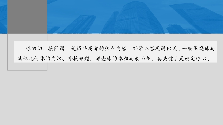 §7.2球的切、接问题[培优课]第七章立体几何与空间向量球的切、接问题,是历年高考的热点内容,经常以客观题出现.一般围绕球与其他几何体的内切、外接命题,考查球的体积与表面积,其关键点是确定球心.例1(1)(2023·宣城模拟)在三棱锥P-ABC中,PA⊥平面ABC,PA=2,AB=,AC=4,∠BAC=45°,三则棱锥P-ABC外接球的表面是积A.14πB.16πC.18πD.20π√题型一定义法22在△BAC中,∠BAC=45°,AB=22,AC=4,由余弦定理可得BC2=AB2+AC2-2AB·ACcos45°=8+16-2×4×22×22=8,则BC2+AB2=AC2,所以BC⊥AB,由PA⊥平面ABC,BC⊂平面ABC,得PA⊥BC,又PA∩AB=A,PA,AB⊂平面PAB,所以BC⊥平面PAB,所以BC⊥PB,所以△PBC直角三角形,为又△PAC直角三角形,为所以PC是三棱锥P-ABC外接球直,径设O是PC的中点,即球心,为又AC=4,PA=2,所以PC=AC2+PA2=42+22=25,所以外接球半径为5,所以所求外接球的表面积S=4π×(5)2=20π.(2)(2022·新高考全国Ⅱ)已知正三台的高棱为1,上、下底面分边长别为,其点都在同一球面上,球的表面顶则该积为A.100πB.128πC.144πD.192π33和43√由意,得正三台上、下底面的外接的半分题棱圆径别为23×32×33=3,23×32×43=4.台上、下底面的外接的心分设该棱圆圆别为O1,O2,接连O1O2(略图),则O1O2=1,其外接球的球心O在直线O1O2上.球设O的半径为R,球心当O在段线O1O2上,时R2=32+OO21=42+(1-OO1)2,解得OO1=4(舍去);球心当O不在段线O1O2上,时R2=42+OO22=32+(1+OO2)2,解得OO2=3,所以R2=25,所以球的表面该积为4πR2=100π.上,球的表面综该积为100π.思维升华到各点距离均相等的点外接球的球心,借助有特殊性底面的外个顶为接心,找其垂,球心一定在垂上,再根据到其他点距离圆圆线则线顶也是半,列系式求解即可径关.思维升华跟踪训练1已知直三柱棱ABC-A1B1C1的6点都在球个顶O的球面上,若AB=3,AC=4,AB⊥AC,AA1=12,球则O的半径为A.3172B.210C.132D.310√由意作如,球心题图图过O作平面ABC的垂,线垂足则为BC的中点M. AB=3,AC=4,AB⊥AC,∴BC=5,又AM=12BC=52,OM=12AA1=6,∴球O的半径R=OA=522+62=132.例2(1)(2023·大模庆拟)在正方形ABCD中,E,F分段别为线AB,BC的中点,接连DE,DF,EF,将△ADE,△CDF,△BEF分沿别DE,DF,EF折起,使A,B,C三点重合,得到三棱锥O-DEF,三的外接球半则该棱锥径R切球半与内径r的比值为题型二补形法√A.23B.43C.26D.6因在正方形为ABCD中,AD⊥AE,CD⊥CF,BE⊥BF,所以折起后OD,OE,OF互相垂直,两两故三的外接球,该棱锥即以OD,OE,OF的方体的外接球为棱长.正方形设ABCD的边长为2,则OD=2,OE=1,OF=1,故2R=OD2+OE2+OF2=6,则R=62.三棱锥O-DEF的表面积S=4,切球球心设内为I,由VO-DEF=13·S△OEF·OD=13,VO-DEF=VI-ODE+VI-ODF+VI-OEF+VI-DEF=13Sr,所以r=14,有则Rr=26.(2)如,在多面体中,四形图边ABCD矩形,为CE⊥平面ABCD,AB=2,BC=CE=1,通添加一三可以多面体成一直过个棱锥将该补个三柱,棱那添加的三的体么棱锥积为____,形后的直三柱的外接球的表面补棱积为_____.136π所以S△BCE=12CE×BC=12×1×1=12,如,添加的三直三图棱锥为棱锥E-ADF,可以多面体成一直三柱将该补个棱ADF-BCE,因为CE⊥平面ABCD,AB=2,BC=CE=1,直三柱棱ADF-BCE的体积V=S△BCE·AB=12×2=1,添加的三的体棱锥积为13V=13.方法一如,分取图别AF,BE的中点M,N,接连MN,与AE交于点O,因四形为边AFEB矩形,为所以O为AE,MN的中点,在直三柱棱ADF-BCE中,CE⊥平面ABCD,所以FD⊥平面ABCD,即∠ECB=∠FDA=90°,所以上、下底面等腰直角三角形,直三柱的外接球的球心即为棱为点O,AO即球的半,为径所以外接球的表面积为4π·AO2=6π.方法二因为CE,CB,CD垂直,两两故直三柱将棱ADF-BCE成方体,补长外接球的半设径为R,则4R2=12+12+22=6,所以外接球的表面积S=4πR2=6π.因为AM=12AF=22,MO=1,所以AO2=AM2+MO2=12+1=32,思维升华(1)形法的解策略补题①面直角三角形,或均相等的模型...