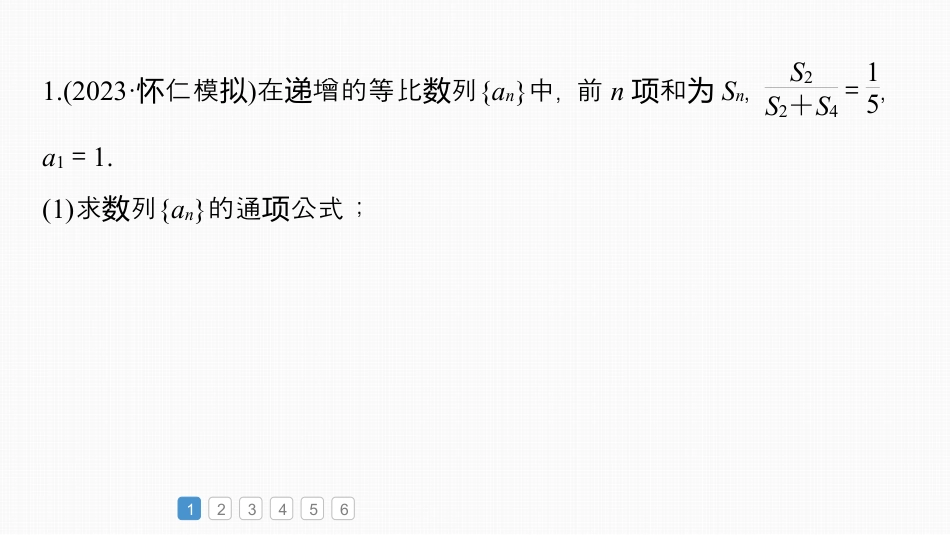 必刷大题12数列的综合问题第六章数列1234561.(2023·仁模怀拟)在增的等比列递数{an}中,前n和项为Sn,S2S2+S4=15,a1=1.(1)求列数{an}的通公式;项123456由S2S2+S4=15,得S4=4S2,等比列设数{an}的公比为q,所以a3+a4=3(a1+a2),即(a1+a2)q2=3(a1+a2),所以q2=3,因等比列为数{an}增,所以递q=3,所以an=a1qn-1=.123n123456(2)若bn=log3a2n-1,求列数{bn}的前n和项Tn.故Tn=0+1+2+…+n-1=nn-12.由(1)可得a2n-1=3n-1,所以bn=log3a2n-1=n-1,2.(2022·坊模潍拟)已知等比列数{an}的前n和项为Sn,且a1=2,S3=a3+6.(1)求列数{an}的通公式;项123456列设数{an}的公比为q,由a1=2,S3=a3+6,得a1(1+q+q2)=6+a1q2,解得q=2,所以an=2n.(2)设bn=log2an,求列数{anbn}的前n和项Tn.123456由(1)可得bn=log2an=n,所以anbn=n·2n,Tn=1×2+2×22+3×23+…+n×2n,2Tn=1×22+2×23+…+(n-1)2n+n·2n+1,所以-Tn=2+22+…+2n-n·2n+1=21-2n1-2-n·2n+1=2n+1-2-n·2n+1,所以Tn=(n-1)2n+1+2.3.已知等差列数{an}和等比列数{bn}足满a1=2,b2=4,an=2log2bn,n∈N*.(1)求列数{an},{bn}的通公式;项123456123456等差列设数{an}的公差为d,因为b2=4,所以a2=2log2b2=4,所以d=a2-a1=2,所以an=2+(n-1)×2=2n.又an=2log2bn,即2n=2log2bn,所以n=log2bn,所以bn=2n.123456(2)列设数{an}中不在列数{bn}中的按小到大的序成列项从顺构数{cn},列记数{cn}的前n和项为Sn,求S100.123456由(1)得bn=2n=2·2n-1=a2n-1,即bn是列数{an}中的第2n-1项.列设数{an}的前n和项为Pn,列数{bn}的前n和项为Qn,因为b7=a26=a64,b8=a27=a128,所以列数{cn}的前100是由列项数{an}的前107去掉列项数{bn}的前7后成的,项构所以S100=P107-Q7=107×2+2142-2-281-2=11302.4.(2023·州模荆拟)正列设项数{an}的前n和项为Sn,a1=1,且足满________.出下列三件:给个条①a3=4,2lgan=lgan-1+lgan+1(n≥2);②Sn=man-1(m∈R);③2a1+3a2+4a3+…+(n+1)an=kn·2n(k∈R).其中任一目充完整,求解以下请从选个将题补并问题.注:如果多件分解答,按第一解答分选择个条别个计.(1)求列数{an}的通公式;项123456123456整理得a2n=an-1·an+1,故正列项数{an}等比列,为数件选条①,时a3=4,2lgan=lgan-1+lgan+1(n≥2),由于a1=1,a3=4,故公比q2=a3a1=4,解得q=2,故an=a1qn-1=2n-1.件选条②,时Sn=man-1(m∈R),当n=1,整理得时a1=ma1-1,解得m=2,故Sn=2an-1,(a)当n≥2,时Sn-1=2an-1-1,(b)123456(a)-(b)得an=2an-2an-1,整理得anan-1=2(常数),所以列数{an}是以1首,为项2公比的等比列,为数所以an=2n-1.件选条③,时2a1+3a2+4a3+…+(n+1)an=kn·2n(k∈R),当n=1,整理得时2a1=k·21,解得k=1,故2a1+3a2+4a3+…+(n+1)an=n·2n(k∈R),(a)当n≥2,时2a1+3a2+4a3+…+nan-1=(n-1)·2n-1,(b)()(b)得21(首符合通项项)123456(2)若bn=1n+1log2an+1,且列数{bn}的前n和项Tn=99100,求n的值.由(1)得bn=1n+1log2an+1=1nn+1=1n-1n+1,所以Tn=1-12+12-13+…+1n-1n+1=1-1n+1=99100,解得n=99.1234565.(2023·南模济拟)已知{an}是增的等差列,递数a1+a5=18,a1,a3,a9分等比列别为数{bn}的前三项.(1)求列数{an}和{bn}的通公式;项由已知得a1+a1+4d=18,a1+2d2=a1a1+8d,解得a1=3,d=3,所以an=3n;列设数{an}的公差为d(d>0),列数{bn}的公比为q,所以b1=a1=3,q=a3a1=3,所以bn=3n.123456(2)去列删数{bn}中的第ai项(其中i=1,2,3,…),剩余的按将项从小到大的序排成新列顺数{cn},求列数{cn}的前n和项Sn.123456由意可知新列题数{cn}为b1,b2,b4,b5,…,则当n偶,为数时Sn=142532322nnbbbbbb--1+++++++2223(127)3(127)127127nn+26(271)13n==,123456则当n奇,为数时1322b...