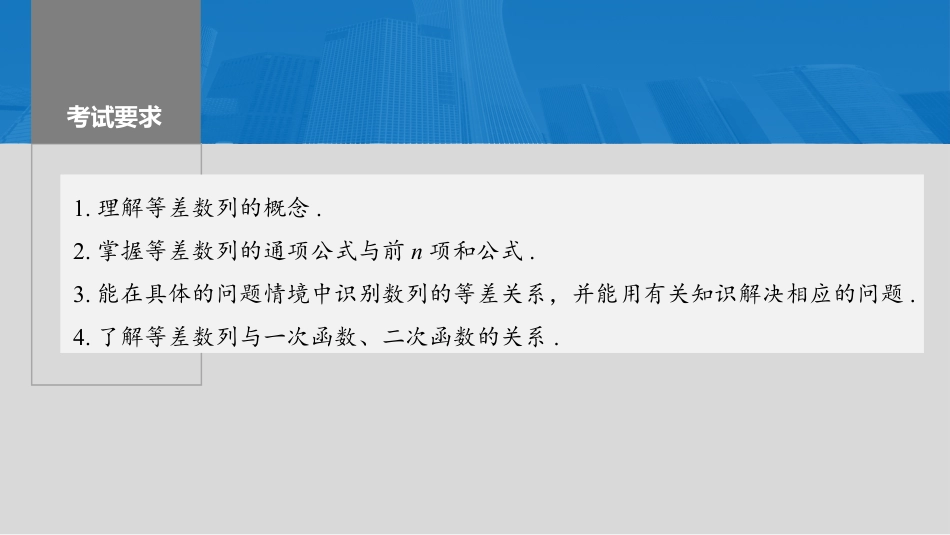 §6.2等差数列第六章数列1.理解等差数列的概念.2.掌握等差数列的通项公式与前n项和公式.3.能在具体的问题情境中识别数列的等差关系,并能用有关知识解决相应的问题.4.了解等差数列与一次函数、二次函数的关系.考试要求内容索引第一部分第二部分第三部分落实主干知识探究核心题型课时精练落实主干知识第一部分知识梳理1.等差列的有念数关概(1)等差列的定数义一般地,如果一列第个数从起,每一的前一的差都等于项项与它项____,那列就叫做等差列,常叫做等差列的么这个数数这个数数公差,公差通常用字母表示,定表式义达为_______________________.(2)等差中项由三个数a,A,b成等差列,组数则A叫做a与b的等差中,且有项同一常个数2dan-an-1=d(常数)(n≥2,n∈N*)a+b知识梳理2.等差列的有公式数关(1)通公式:项an=.a1+(n-1)d(2)前n和公式:项Sn=或Sn=.na1+nn-12na1+an2知识梳理3.等差列的常用性数质(1)通公式的推广:项an=am+(n,m∈N*).(2)若{an}等差列,且为数k+l=m+n(k,l,m,n∈N*),则.(3)若{an}是等差列,公差数为d,则ak,ak+m,ak+2m,…(k,m∈N*)是公差为的等差列数.(4)列数Sm,S2m-Sm,S3m-S2m,…也是等差列数.(5)S2n-1=(2n-1)an.(n-m)dak+al=am+anmd(6)等差列数{an}的前n和项为Sn,Snn等差列为数.常用结论1.已知列数{an}的通公式是项an=pn+q(其中p,q常为数),则数列{an}一定是等差列,且公差数为p.2.在等差列数{an}中,a1>0,d<0,则Sn存在最大;若值a1<0,d>0,则Sn存在最小值.3.等差列数{an}的性:单调当d>0,时{an}是增列;递数当d<0,时{an}是列;递减数当d=0,时{an}是常列数.4.列数{an}是等差列数⇔Sn=An2+Bn(A,B常为数).里公差这d=思考辨析判下列是否正确断结论(在括中打请号“√”或“×”)(1)若一列第个数从2起每一的前一的差都是常,项项与它项数则这个列是等差列数数.()(2)列数{an}等差列的充要件是任意为数条对n∈N*,都有2an+1=an+an+2.()(3)在等差列数{an}中,若am+an=ap+aq,则m+n=p+q.()√××√教材改编题1.在等差列数{an}中,已知a5=11,a8=5,则a10等于A.-2B.-1C.1D.2∴an=-2n+21.∴a10=-2×10+21=1.等差列设数{an}的公差为d,由意得题11=a1+4d,5=a1+7d,解得a1=19,d=-2.√教材改编题2.等差列设数{an}的前n和项为Sn,若S4=8,S8=20,则a9+a10+a11+a12等于A.12B.8C.20D.16等差列数{an}中,S4,S8-S4,S12-S8仍等差为列,数即8,20-8,a9+a10+a11+a12等差列,为数所以a9+a10+a11+a12=16.√教材改编题所以Sn=na1+nn-12d=-n2+11n.3.等差列设数{an}的前n和项为Sn.若a1=10,S4=28,则Sn的最大值为___.30由a1=10,S4=4a1+6d=28,解得d=-2,当n=5或6,时Sn最大,最大值为30.探究核心题型第二部分例1(1)(2023·封模开拟)已知公差为1的等差列数{an}中,=a3a6,若列的前该数n和项Sn=0,则n等于A.10B.11C.12D.13题型一等差数列基本量的运算√a25由意知题(a1+4)2=(a1+2)(a1+5),na1+nn-12=0,解得a1=-6,n=13.(2)(2020·全国Ⅱ)北京天的圜丘古代祭天的所,分上、中、下坛坛为场三层.上中心有一形石板层块圆(天心石称为),天心石砌环绕9扇面块形石板成第一,向外每依次增加构环环9块.下一的第一比上一层环层的最后一多环9,向外每依次也增加块环9,已知每块层环相同,且下比中多数层层729,三共有扇面块则层形石板(不含天心石)A.3699块B.3474块C.3402块D.3339块√三共有扇面形石板则层S3n=S27=27×9+27×262×9=3402(块).每一有设层n,由意可知到外每之成环题从内环间构d=9,a1=9的等差列数.由等差列的性知数质Sn,S2n-Sn,S3n-S2n成等差列,数且(S3n-S2n)-(S2n-Sn)=n2d,则9n2=729,得n=9,思维升华(1)等差列的通公式及前数项n和公式共涉及五量项个a1,n,d,an,Sn,知道其中三就能求出另外个两个(简称“知三求二”).(2)确定等差列的是求出最基本的量,即首数关键两个项a1和公差d.思维升华跟踪训练1(1)《周髀算》有一:冬至日起,依次经这样个问题从为小寒、大寒、立春、雨...
