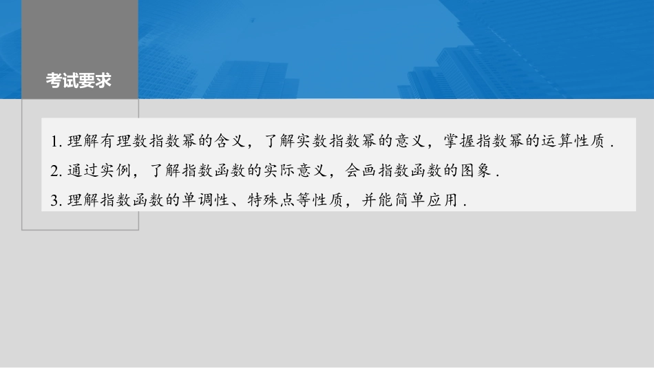 §2.7指数与指数函数第二章函数1.理解有理数指数幂的含义,了解实数指数幂的意义,掌握指数幂的运算性质.2.通过实例,了解指数函数的实际意义,会画指数函数的图象.3.理解指数函数的单调性、特殊点等性质,并能简单应用.考试要求内容索引第一部分第二部分第三部分落实主干知识探究核心题型课时精练落实主干知识第一部分知识梳理1.根式(1)一般地,如果xn=a,那么叫做a的n次方根,其中n>1,且n∈N*.(2)式子na叫做,里这n叫做根指,数a叫做被方开数.(3)(na)n=.当n奇,为数时nan=,当n偶,为数时nan=|a|=a,a≥0,-a,a<0.x根式aa知识梳理2.分指数数幂正的正分指:数数数幂=______(a>0,m,n∈N*,n>1).正的分指:数负数数幂=____=(a>0,m,n∈N*,n>1).0的正分指等于数数幂,0的分指有意负数数幂没义.mnanammna-1mna1nam0知识梳理3.指的算性数幂运质aras=;(ar)s=;(ab)r=(a>0,b>0,r,s∈Q).4.指函及其性数数质(1)念:一般地,函概数y=ax(a>0,且a≠1)叫做指函,其中指数数数x是自量,定域是变义___.ar+sarsarbrR知识梳理a>10<a<1象图定域义___域值__________(2)指函的象性数数图与质R(0,+∞)知识梳理性质定点过,即x=0,时y=1当x>0,时;当x<0,时_______当x<0,时;当x>0,时_______在(-∞,+∞)上是_______在(-∞,+∞)上是_______(0,1)y>10<y<1y>10<y<1增函数函减数常用结论1.指函象的点数数图关键(0,1),(1,a),2.如所示是指函图数数(1)y=ax,(2)y=bx,(3)y=cx,(4)y=dx的象,图则c>d>1>a>b>0,即在第一象限,指函内数数y=ax(a>0,且a≠1)的象越高,底越大图数.-1,1a.思考辨析判下列是否正确断结论(在括中打请号“√”或“×”)(1)=-4.()(2)2a·2b=2ab.()(3)函数y=的域是值(0,+∞).()(4)若am<an(a>0,且a≠1),则m<n.()13x-1××××4-44教材改编题1.已知函数y=a·2x和y=2x+b都是指函,数数则a+b等于A.不确定B.0C.1D.2√由函数y=a·2x是指函,得数数a=1,由y=2x+b是指函,得数数b=0,所以a+b=1.教材改编题2.算:计=_____.原式=+1-3-2=3-2+1-3-2=1.22232713--+--12333-教材改编题3.若指函数数f(x)=ax(a>0,且a≠1)在[-1,1]上的最大值为2,则a=________.若a>1,则f(x)max=f(1)=a=2;2或12若0<a<1,则f(x)max=f(-1)=a-1=2,得a=12.探究核心题型第二部分例1算:计题型一指数幂的运算(1)(-1.8)0+32-2·33382-10.01+93;=1+(-1.8)0+32-2·33382-10.01+932233222710938=1+232·322-10+33=1+1-10+27=19.(2)(a>0,b>0).3112123324140.1abab3112123324140.1abab331322223322240.1abab==2×1100×8=425.思维升华(1)指的算首先根式、分指一分指,以便数幂运将数数幂统为数数幂利用法算,注意:则计还应①必同底相乘,指才能相加须数幂数.②算的先后序运顺.(2)算果不能同含有根和分指,也不能有分母又含有运结时号数数既指负数.思维升华跟踪训练1算:计(1);933713332÷·aaaa因为a-3有意,所以义a>0,所以原式==3a3÷a2=a÷a=1.7139333322aaaa(2)013633470.001+16+2.38原式==10-1+8+23·32=89.61113343234101+2+23-例2(1)(多选)已知非零实数a,b足满3a=2b,下列不等系中则关正确的是A.a<bB.若a<0,则b<a<0C.|a|<|b|D.若0<a<log32,则ab<ba题型二指数函数的图象及应用√√√如,由指函的象可知,图数数图0<a<b或者b<a<0,所以A,错误B,C正确;D中,选项0<a<log32⇒0<a<b<1,有则ab<aa<ba,所以D正确.(2)若函数f(x)=|2x-2|-b有零点,两个则实数b的取范是值围_______.(0,2)在同一平面直角坐系中出标画y=|2x-2|与y=b的象,如所图图示.∴当0<b<2,函象有交点,而函时两数图两个从数f(x)=|2x-2|-b有零...