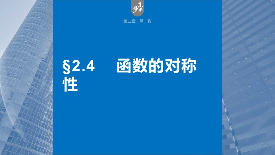 §2.4函数的对称性第二章函数1.能通过平移,分析得出一般的轴对称和中心对称公式和推论.2.会利用对称公式解决问题.考试要求内容索引第一部分第二部分第三部分落实主干知识探究核心题型课时精练落实主干知识第一部分知识梳理1.奇函、偶函的性数数对称(1)奇函于数关______,偶函于对称数关_____对称.(2)若f(x-2)是偶函,函数则数f(x)象的图对称轴为_______;若f(x-2)是奇函,函数则数f(x)象的中心图对称为_______.2.若函数y=f(x)的象于直图关线x=a,对称则f(a-x)=f(a+x);若函数y=f(x)足满f(a-x)=-f(a+x),函的象于点则数图关_____对称.原点y轴x=-2(-2,0)(a,0)知识梳理3.函象的两个数图对称(1)函数y=f(x)与y=f(-x)于关_____;对称(2)函数y=f(x)与y=-f(x)于关_____;对称(3)函数y=f(x)与y=-f(-x)于关_____对称.y轴x轴原点思考辨析判下列是否正确断结论(在括中打请号“√”或“×”)(1)函数y=f(x+1)是偶函,函数则数y=f(x)的象于直图关线x=1对称.()(2)函数y=f(x-1)是奇函,函数则数y=f(x)的象于点图关(1,0)对称.()(3)若函数f(x)足满f(x-1)+f(x+1)=0,则f(x)的象于图关y轴对称.()(4)若函数f()足满f(2+)f(2)则f()的象于直图关线2√××√教材改编题A.(0,0)B.(0,1)C.(1,0)D.(1,1)√1.函数f(x)=x+1x象的中心图对称为因为f(x)=x+1x=1+1x,由y=1x向上平移一位度得到个单长y=1+1x,又y=1x于关(0,0),对称所以f(x)=1+1x的象于图关(0,1)对称.教材改编题2.已知定在义R上的函数f(x)在[-2,+∞)上,且单调递减f(-2-x)=f(-2+x),则f(-4)与f(1)的大小系关为___________.f(-4)>f(1) f(-2-x)=f(-2+x),∴f(x)于直关线x=-2,对称又f(x)在[-2,+∞)上,单调递减∴f(-4)=f(0)>f(1),故f(-4)>f(1).教材改编题3.偶函数y=f(x)的象于直图关线x=2,且对称当x∈[2,3],时f(x)=2x-1,则f(-1)=___.5 f(x)偶函,为数∴f(-1)=f(1),由f(x)的象于图关x=2,对称可得f(1)=f(3)=2×3-1=5.探究核心题型第二部分例1(1)已知定在义R上的函数f(x)是奇函,数对x∈R都有f(x+1)=f(1-x),当f(-3)=-2,时则f(2023)等于A.-2B.2C.0D.-4√题型一轴对称问题定在义R上的函数f(x)是奇函,且数对x∈R都有f(x+1)=f(1-x),故函数f(x)的象于直图关线x=1,对称∴f(x)=f(2-x),故f(-x)=f(2+x)=-f(x),∴f(x)=-f(2+x)=f(4+x),∴f(x)是周期为4的周期函数.则f(2023)=f(505×4+3)=f(3)=-f(-3)=2.(2)已知函数f(x)的定域义为R,且f(x+2)偶函,为数f(x)在[2,+∞)上,不等式单调递减则f(x-1)>f(1)的解集为________.(2,4) f(x+2)是偶函,数∴f(x+2)的象于直图关线x=0,对称∴f(x)的象于直图关线x=2,对称又f(x)在[2,+∞)上,单调递减∴f(x)在(-∞,2]上增单调递.又f(x-1)>f(1),∴|x-1-2|<|1-2|,即|x-3|<1,解得2<x<4,∴原不等式的解集为(2,4).思维升华函数y=f(x)的象于直图关线x=a对称⇔f(x)=f(2a-x)⇔f(a-x)=f(a+x);若函数y=f(x)足满f(a+x)=f(b-x),则y=f(x)的象图关于直线x=成轴对称.思维升华a+b2跟踪训练1(1)已知函数f(x)=-x2+bx+c,且f(x+1)是偶函,数则f(-1),f(1),f(2)的大小系是关A.f(-1)<f(1)<f(2)B.f(1)<f(2)<f(-1)C.f(2)<f(-1)<f(1)D.f(-1)<f(2)<f(1)√因为f(x+1)是偶函,所以其数对称轴为x=0,所以f(x)的对称轴为x=1,又二次函数f(x)=-x2+bx+c的口向下,根据自量离开变对称轴的距离可得f(-1)<f(2)<f(1).(2)如果函数f(x)任意的对实数x,都有f(1+x)=f(-x),且当x≥,时f(x)=log2(3x-1),那函么数f(x)在[-2,0]上的最大最小值与值之和为A.2B.3C.4D.-1√12根据f(1+x)=f(-x)可知,f(x)的象于图关x=12,对称那求函么数f(x)在[-2,0]上的最大最小之和,即求函值与值数f(x)在[1,3]上的最大最小之和,值与值因为f(x)=log2(3x-1)在12,+∞上增,所以最小最大分单调递值与值别为f(1)=1,f(3)=3,f(1)+f(3)=4.例2(1)(多选)若定在义R上的偶函数f(x)的象于点图关(2,0),对称下列法正确的是则说A.f(x)=f(-x)B.f(2+x)+f(2-x)=0C.f(-x...