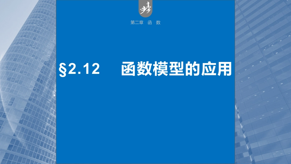 §2.12函数模型的应用第二章函数考试要求1.了解指函、函一次函增速度的差数数对数数与数长异.2.理解“指爆炸数”“增对数长”“直上升线”等的含术语义.3.能合适的函模型刻的化律,了解函模型在社生活中选择数画现实问题变规数会的广泛用应.第一部分第二部分第三部分落实主干知识探究核心题型课时精练内容索引落实主干知识第一部分知识梳理1.三函模型的性种数质函数性质y=ax(a>1)y=logax(a>1)y=xn(n>0)在(0,+∞)上的增性减增单调递增单调递增单调递增速度长越越快来越越慢来相平对稳象的化图变随x的增大逐表渐现为与平行随x的增大逐表渐现为与平行随n的化而值变各有不同y轴x轴知识梳理2.常的函模型见数函模型数函解析式数一次函模型数f(x)=ax+b(a,b常,为数a≠0)二次函模型数f(x)=ax2+bx+c(a,b,c常,为数a≠0)反比例函模型数f(x)=+b(k,b常,为数k≠0)指函模型数数f(x)=bax+c(a,b,c常,为数a>0且a≠1,b≠0)函模型对数数f(x)=blogax+c(a,b,c常,为数a>0且a≠1,b≠0)kx思考辨析判下列是否正确断结论(在括中打请号“√”或“×”)(1)函数y=2x的函比数值y=x2的函大数值.()(2)某商品价每件进为100元,按价增加进10%出售,后因存降库积压价,若九折出售,每件能利则还获.()(3)在(0,+∞)上,着随x的增大,y=ax(a>1)的增速度超长会过并大于远远y=xa(a>0)和y=logax(a>1)的增速度长.()(4)在函模型解,必使所有的据完全符合函选择数决实际问题时须数该模型数.()××√×教材改编题1.当x越越大,下列函中增速度最快的是来时数长A.y=5xB.y=log5xC.y=x5D.y=5x√合函的性可知,几函模型中,指函的增速度最快结数质种数数数长.教材改编题2.在某物理中,量得到量个实验测变x和量变y的几据,如下表:组数则对x,y最适合的函模型是数A.y=2xB.y=x2-1C.y=2x-2D.y=log2xx0.500.992.013.98y-0.99-0.010.982.00√教材改编题根据x=0.50,y=-0.99,代入算,可以排除计A;根据x=2.01,y=0.98,代入算,可以排除计B,C;各据代入函将数数y=log2x,可知足意,故满题选D.x0.500.992.013.98y-0.99-0.010.982.00教材改编题3.某超市的某商品的日利种润y(位:元单)商品的日售价与该当x(单位:元)之的系间关为y=+12x-210,那商品的日利最么该润大,日售价时当为________元.-x225150因为y=-x225+12x-210=-125(x-150)2+690,所以当x=150,时y取最大,即商品的利最大,日售价值该润时当为150元.探究核心题型第二部分例1(1)(多选)血度是指物吸收后在血的度药浓药浆内总浓.物在人体药内治作用,物的血度介于最低有效度和最低中毒度之发挥疗时该药药浓应浓浓间.已知成人次服用单1位某物后,体血度及相信息如所示:单药内药浓关图根据中提供的信息,下列于成人使用物的法中,正确的是图关该药说A.首次服用物该药1位单约10分后,物钟药治作用发挥疗B.每次服用物该药1位,次服隔小于单两药间2小,一定生物中毒时会产药C.每隔间5.5小服用物时该药1位,可使物持治作用单药续发挥疗D.首次服用物该药1位单3小后,再次服用物时该药1位,不生物单会发药中毒题型一用函数图象刻画变化过程√√√象中可以看出,首次服用物从图该药1位单约10分后物治钟药发挥作用,疗A正确;根据象可知,首次服用物图该药1位单约1小后的血度到时药浓达最大,由象可知,次服隔小于值图当两药间2小,一定生时时会产物中毒,药B正确;服药5.5小,血度等于最低有效度,此再服,血时时药浓浓时药药度增加,可使物持治作用,浓药续发挥疗C正确;第一次服用物该药1位单4小后第时与2次服用物该药1位单1小后,时血度之和大于最低中毒度,因此一定生物中毒,药浓浓会发药D错误.(2)根据一据出的散点如所示组试验数画图图.有如下现5函模型:个数①y=0.6x-0.12;②y=2x-2.02;③y=2x-5.4x+6;④y=log2x;⑤y=+1.84.中一函模型,使能近请从选择个数它似地反映些据的律,这数规应选______.(序填号)12x④由可知上述点大体分布在函图数y=log2x的象上,图故选择y=log2x可以近似地反映些据的律这数规.思维升华判函象化程相吻合的方法断数图与实际问题变过两种(1)建函模型法:...