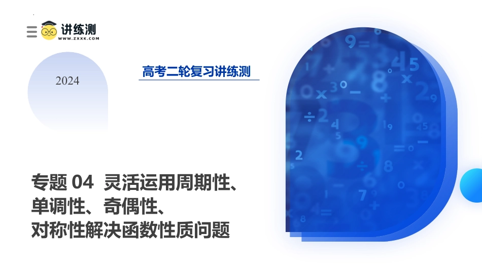 专题04灵活运用周期性、单调性、奇偶性、对称性解决函数性质问题2024高考二轮复习讲练测01020304目录CONTENTS考情分析知识建构核心考点方法技巧真题研析01PARTONE考情分析稿定PPT02从近五年的高考情况来看,本节是高考的一个重点,函数的单调性、奇偶性、周期性是高考的必考内容,考试形式多以一道选择题为主,分值5分.重点关注单调性、奇偶性结合在一起,与函数图像、函数零点和不等式相结合进行考查,解题时要充分运用转化思想和数形结合思想.稿定PPT稿定PPT,海量素材持续更新,上千款模板有选择总一款适合你考点要求考题统计考情分析函数的性质2023年新高考II卷第4题,5分2023年新高考I卷第4题,5分2022年乙卷第12题,5分2022年新高考II卷第8题,5分2021年甲卷第12题,5分2021年新高考II卷第8题,5分【命题预测】预测2024年高考,多以小题形式出现,也有可能会将其渗透在解答题的表达之中,相对独立.具体估计为:(1)以选择题或填空题形式出现,考查学生的综合推理能力.(2)热点是单调性、奇偶性、对称性结合在一起.02PARTTWO知识建构03PARTTHREE方法技巧真题研析3、周期性技巧BDDDAD04PARTFOUR核心考点考点题型一:函数单调性的综合应用考点题型一:函数单调性的综合应用考点题型一:函数单调性的综合应用考点题型二:函数的奇偶性的综合应用考点题型二:函数的奇偶性的综合应用考点题型二:函数的奇偶性的综合应用考点题型三:已知f(x)=奇函数+M考点题型三:已知f(x)=奇函数+M考点题型三:已知f(x)=奇函数+M考点题型四:利用轴对称解决函数问题考点题型四:利用轴对称解决函数问题考点题型四:利用轴对称解决函数问题考点题型五:利用中心对称解决函数问题考点题型五:利用中心对称解决函数问题考点题型五:利用中心对称解决函数问题考点题型六:利用周期性和对称性解决函数问题考点题型六:利用周期性和对称性解决函数问题考点题型六:利用周期性和对称性解决函数问题考点题型七:类周期函数考点题型七:类周期函数考点题型七:类周期函数考点题型八:抽象函数的单调性、奇偶性、周期性、对称性考点题型八:抽象函数的单调性、奇偶性、周期性、对称性考点题型八:抽象函数的单调性、奇偶性、周期性、对称性考点题型九:函数性质的综合考点题型九:函数性质的综合考点题型九:函数性质的综合感看谢观THANKYOU