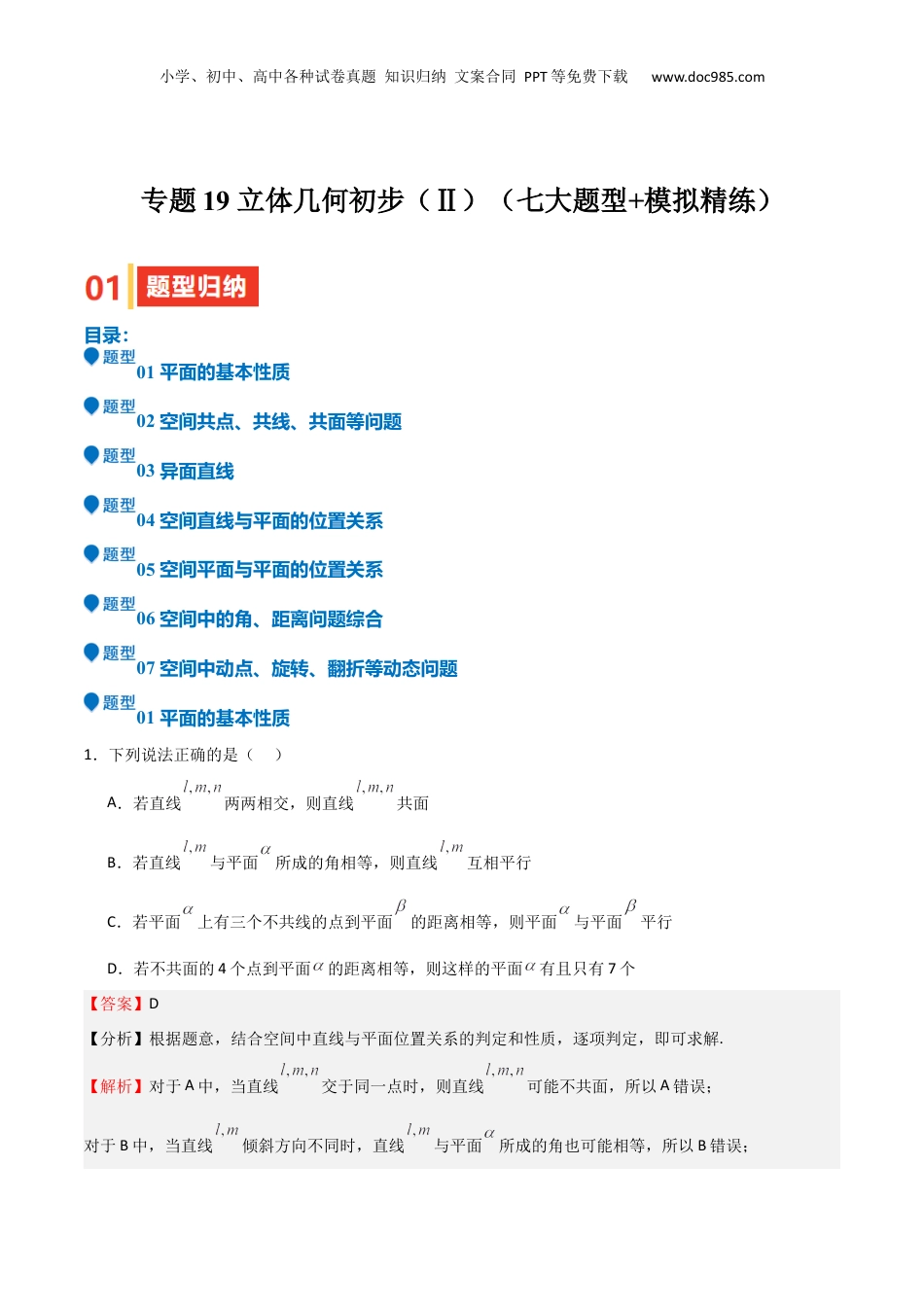 小学、初中、高中各种试卷真题知识归纳文案合同PPT等免费下载www.doc985.com专题19立体几何初步(Ⅱ)(七大题型+模拟精练)目录:01平面的基本性质02空间共点、共线、共面等问题03异面直线04空间直线与平面的位置关系05空间平面与平面的位置关系06空间中的角、距离问题综合07空间中动点、旋转、翻折等动态问题01平面的基本性质1.下列说法正确的是()A.若直线两两相交,则直线共面B.若直线与平面所成的角相等,则直线互相平行C.若平面上有三个不共线的点到平面的距离相等,则平面与平面平行D.若不共面的4个点到平面的距离相等,则这样的平面有且只有7个【答案】D【分析】根据题意,结合空间中直线与平面位置关系的判定和性质,逐项判定,即可求解.【解析】对于A中,当直线交于同一点时,则直线可能不共面,所以A错误;对于B中,当直线倾斜方向不同时,直线与平面所成的角也可能相等,所以B错误;小学、初中、高中各种试卷真题知识归纳文案合同PPT等免费下载www.doc985.com对于C中,当这3个点不在平面的同侧时,平面与平面相交,所以C错误;对于D中,根据题意,显然这4个点不可能在平面的同侧,当这4个点在平面两侧1,3分布时,这样的平面有4个,当这4个点在平面两侧2,2分布时,这样的平面有3个,所以这样的平面有且只有7个,所以D正确.故选:D.2.下列说法正确的是()A.四边形确定一个平面B.如果一条直线上的两个点在一个平面内,那么这条直线在这个平面内C.经过三点确定一个平面D.经过一条直线和一个点确定一个平面【答案】B【解析】略3.已知是两个不同的平面,则下列命题错误的是()A.若且,则B.若是平面内不共线三点,,则C.若直线,直线,则与为异面直线D.若且,则直线【答案】C【分析】根据基本事实3(公理2)可判断A;根据基本事实1(公理3)可判断B;根据异面直线的定义可判断C;根据基本事实2(公理1)可判断D.【解析】对于A,由根据且,则是平面和平面的公共点,又,由基本事实3(公理2)可得,故A正确;对于B,由基本事实1(公理3):过不在一条直线上的三个点,有且只有一个平面,小学、初中、高中各种试卷真题知识归纳文案合同PPT等免费下载www.doc985.com又,且,则,故B正确;对于C,由于平面和平面位置不确定,则直线与直线位置亦不确定,可能异面、相交、平行、重合,故C错误;对于D,由基本事实2(公理1):如果一条直线上的两个点在一个平面内,那么这条直线在这个平面内,故D正确.故选:C.4.下列结论正确的是()A.两个平面α,β有一个公共点A,就说α,β相交于过A点的任意一条直线.B.两两相交的三条直线最多可以确定三个平面.C.如果两个平面有三个公共点,则这两个平面重合.D.若直线a不平行于平面α,且a⊄α,则α内的所有直线与a异面.【答案】B【分析】利用推论可判断B正确;对A项,由基本事实3可知;对C项,两个相交的平面有无数个公共点;对D项,平面内可找到无数条直线与相交.【解析】对选项A,由基本事实3,两个平面有一个公共点,那么它们有且只有一条过A点的公共直线,而不是任意一条过点的直线都是两平面的交线,故A项错误;对于B,若两两相交的三条直线交于一点,则三条直线最多可以确定三个平面,故B正确;对选项C,若这三个公共点共线,两平面可能相交,不一定重合,故C项错误;对选项D,若直线不平行于平面,且,则直线与平面相交,设交点为,则平面内所有过点的直线都与相交于点,而不是异面,故D项错误.故选:B.02空间共点、共线、共面等问题5.已知互不重合的三个平面α、β、γ,其中,,,且,则下列结论一定成立的是()A.b与c是异面直线B.a与c没有公共点C.D.小学、初中、高中各种试卷真题知识归纳文案合同PPT等免费下载www.doc985.com【答案】D【分析】根据题设条件可得相应的空间图形,从而可得正确的选项.【解析】 ,∴,, ,,∴,,, ,∴,∴,∴,如图所示:故A,B,C错误;故选:D.6.如图,在三棱柱中,分别为的中点,则下列说法错误的是()A.四点共面B.C.三线共点D.【答案】D【分析】对于AB,利用线线平行的传递性与平面公理的推论即可判断;对于C,利用平面公理判断得,的交点在,从...