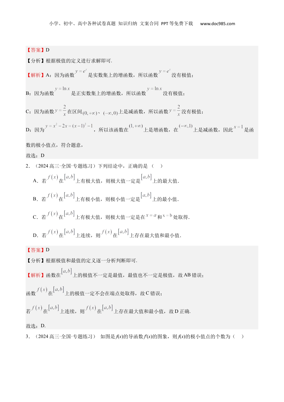 小学、初中、高中各种试卷真题知识归纳文案合同PPT等免费下载www.doc985.com专题15导数与函数的极值、最值(十一大题型+模拟精练)目录:01函数极值的辨析02求已知函数的极值03根据极值求参数04函数(导函数)图像与极值的关系05由导数求函数的最值06已知函数最值求参数07根据极值点求参数08由导数求函数的最大值(含参)09恒成立问题10零点问题11导数的综合应用01函数极值的辨析1.(2024高三·全国·专题练习)下列函数中,存在极值的函数为()A.B.C.D.小学、初中、高中各种试卷真题知识归纳文案合同PPT等免费下载www.doc985.com【答案】D【分析】根据极值的定义进行求解即可.【解析】A:因为函数是实数集上的增函数,所以函数没有极值;B:因为函数是正实数集上的增函数,所以函数没有极值;C:因为函数在区间、上是减函数,所以函数没有极值;D:因为,所以该函数在上是增函数,在上是减函数,因此是函数的极小值点,符合题意,故选:D2.(2024高三·全国·专题练习)下列结论中,正确的是()A.若在上有极大值,则极大值一定是上的最大值.B.若在上有极小值,则极小值一定是上的最小值.C.若在上有极大值,则极大值一定是在和处取得.D.若在上连续,则在上存在最大值和最小值.【答案】D【分析】根据极值和最值的定义逐一分析判断即可.【解析】函数在上的极值不一定是最值,最值也不一定是极值,故AB错误;函数在上的极值一定不会在端点处取得,故C错误;若在上连续,则在上存在最大值和最小值,故D正确.故选:D.3.(2024高三·全国·专题练习)如图是f(x)的导函数f′(x)的图象,则f(x)的极小值点的个数为()小学、初中、高中各种试卷真题知识归纳文案合同PPT等免费下载www.doc985.comA.1B.2C.3D.4【答案】A【分析】根据极值点的定义,结合导函数的图象判断即可.【解析】由导函数f′(x)的图象知在x=-2处f′(-2)=0,且其两侧导数符号为左正右负,x=-2是极大值;在x=-1处f′(-1)=0,且其两侧导数符号为左负右正,x=-1是极小值;在x=-3处f′(2)=0,且其两侧导数符号为左正右负,x=2是极大值;所以f(x)的极小值点的个数为1,故选:A【点睛】本题主要考查极值点的定义以及数形结合思想的应用,属于基础题.4.(22-23高二上·河南许昌·期末)函数的导函数的图象如图所示,则()A.为函数的零点B.是函数的最小值C.函数在上单调递减D.为函数的极大值点小学、初中、高中各种试卷真题知识归纳文案合同PPT等免费下载www.doc985.com【答案】C【分析】根据的图象,得到函数的单调区间,结合函数的单调性,极值点和极值,以及零点的概念,逐项判定,即可求解.【解析】由的图象,可得:当时,,单调递减;当时,,单调递增;当时,,单调递减;当时,,单调递增,A中,是函数的一个极大值点,不一定是函数的零点,所以A不正确;B中,是函数一个极小值,不一定是函数的最小值,所以B错误;C中,函数在上单调递减,所以C正确;D中,为函数的极小值点,所以D错误.故选:C.02求已知函数的极值5.(2024·黑龙江·模拟预测)已知函数.(1)当时,求在点处的切线方程;(2)讨论的单调性,并求出的极小值.【答案】(1)小学、初中、高中各种试卷真题知识归纳文案合同PPT等免费下载www.doc985.com(2)在单调递减,在和单调递增;0.【分析】(1)欲求曲线在点处的切线方程,只需求出斜率和的值,利用直线的点斜式方程求解切线的方程;(2)利用函数的导数,求出函数的单调区间,从而求出函数的极值即可.【解析】(1)当时,,则,所以,又知,所以在点处的切线方程为.(2)因为,令,则或,所以当时,,当或时,.综上,在上单调递减,在和上单调递增;所以.小学、初中、高中各种试卷真题知识归纳文案合同PPT等免费下载www.doc985.com6.(23-24高二下·湖南·期中)已知函数为奇函数.(1)求的值;(2)当时,求的单调区间和极值.【答案】(1)(2)答案见解析【分析】(1)由已知结合奇函数的定义即可求解;(2)先化简的解析式,对其求导,结合导函数与单调性及极值的关系即可求解.【解析】(1)定义域:.由已知:函数为奇函数,所以,即,解得.(2)由(1)得:,...