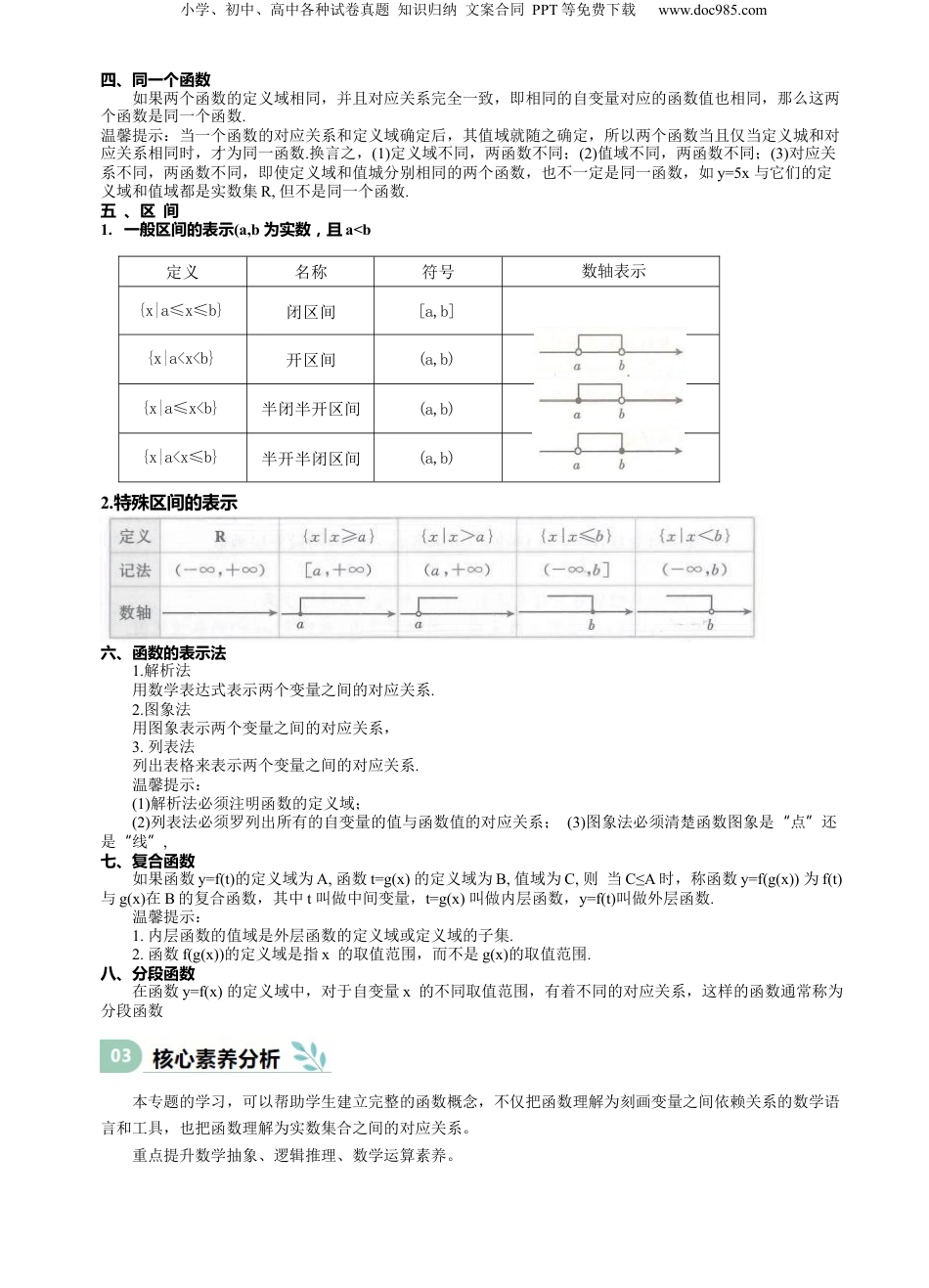 小学、初中、高中各种试卷真题知识归纳文案合同PPT等免费下载www.doc985.com专题06函数及其表示目录01思维导图02知识清单03核心素养分析04方法归纳一、函数的概念1.函数的定义设A,B是非空的数集,如果按照某种确定的对应关系f,使对于集合A中的任意一个数x,在集合B中都有唯一确定的数f(x)和它对应,那么就称f:A→B为从集合A到集合B的一个函数,记作y=f(x),xA.∈其中,x叫做自变量,x的取值范围A叫做函数的定义域.显然,值域是集合B的子集.2.函数的构成要素函数的构成要素为:定义域、对应关系和值域.三者缺一不可,其中对应关系是核心,定义域是根本,当定义域和对应关系确定了,值域也就确定了.二、函数的定义域1.函数的定义域是自变量x的取值集合,它是函数的重要组成部分.2.求函数定义域的注意事项(1)分式的分母不为0;(2)偶次根式的被开方数大于等于0;(3)零次幂的底数不为0;(4)实际问题中自变量的范围;(5)多个式子构成的函数,其定义域要满足每个式子都有意义.三、函数的值域1.函数的值域是在对应关系f的作用下,自变量x在定义域内取值时相应的函数值组成的集合小学、初中、高中各种试卷真题知识归纳文案合同PPT等免费下载www.doc985.com四、同一个函数如果两个函数的定义域相同,并且对应关系完全一致,即相同的自变量对应的函数值也相同,那么这两个函数是同一个函数.温馨提示:当一个函数的对应关系和定义域确定后,其值域就随之确定,所以两个函数当且仅当定义城和对应关系相同时,才为同一函数.换言之,(1)定义域不同,两函数不同;(2)值域不同,两函数不同;(3)对应关系不同,两函数不同,即使定义域和值城分别相同的两个函数,也不一定是同一函数,如y=5x与它们的定义域和值域都是实数集R,但不是同一个函数.五、区间1.一般区间的表示(a,b为实数,且a<b定义名称符号数轴表示{x|a≤x≤b}闭区间[a,b]{x|a<x<b}开区间(a,b){x|a≤x<b}半闭半开区间(a,b){x|a<x≤b}半开半闭区间(a,b)2.特殊区间的表示六、函数的表示法1.解析法用数学表达式表示两个变量之间的对应关系.2.图象法用图象表示两个变量之间的对应关系,3.列表法列出表格来表示两个变量之间的对应关系.温馨提示:(1)解析法必须注明函数的定义域;(2)列表法必须罗列出所有的自变量的值与函数值的对应关系;(3)图象法必须清楚函数图象是点还“”是线“”,七、复合函数如果函数y=f(t)的定义域为A,函数t=g(x)的定义域为B,值域为C,则当C≤A时,称函数y=f(g(x))为f(t)与g(x)在B的复合函数,其中t叫做中间变量,t=g(x)叫做内层函数,y=f(t)叫做外层函数.温馨提示:1.内层函数的值域是外层函数的定义域或定义域的子集.2.函数f(g(x))的定义域是指x的取值范围,而不是g(x)的取值范围.八、分段函数在函数y=f(x)的定义域中,对于自变量x的不同取值范围,有着不同的对应关系,这样的函数通常称为分段函数本专题的学习,可以帮助学生建立完整的函数概念,不仅把函数理解为刻画变量之间依赖关系的数学语言和工具,也把函数理解为实数集合之间的对应关系。重点提升数学抽象、逻辑推理、数学运算素养。小学、初中、高中各种试卷真题知识归纳文案合同PPT等免费下载www.doc985.com一、函数的定义域例1(1)(2022·武汉模拟)函数f(x)=+的定义域为()A.[-2,0)(0,2]∪B.(-1,0)(0,2]∪C.[-2,2]D.(-1,2]答案B解析要使函数有意义,则需解得-1<x≤2且x≠0,所以x(∈-1,0)(0,2]∪.所以函数的定义域为(-1,0)(0,2]∪.(2)若函数f(x)的定义域为[0,2],则函数f(x-1)的定义域为________.答案[1,3]解析 f(x)的定义域为[0,2],∴0≤x-1≤2,即1≤x≤3,函数∴f(x-1)的定义域为[1,3].延伸探究将本例(2)改成若函数“f(x+1)的定义域为[0,2]”,则函数f(x-1)的定义域为________.答案[2,4]解析 f(x+1)的定义域为[0,2],∴0≤x≤2,∴1≤x+1≤3,∴1≤x-1≤3,∴2≤x≤4,∴f(x-1)的定义域为[2,4].拓展1.(2022·西北师大附中月考)函数y=lg(x2-4)+的定义域是()A.(-,-∞2)[0∪,+∞)B.(-,-∞6](2∪,+∞)C.(-,-∞2][0∪,+∞)D.(-,-∞6)[2∪,+∞)答案B解析由题意,得解得x>2或x≤-6.因此函数的定义域为(-,...