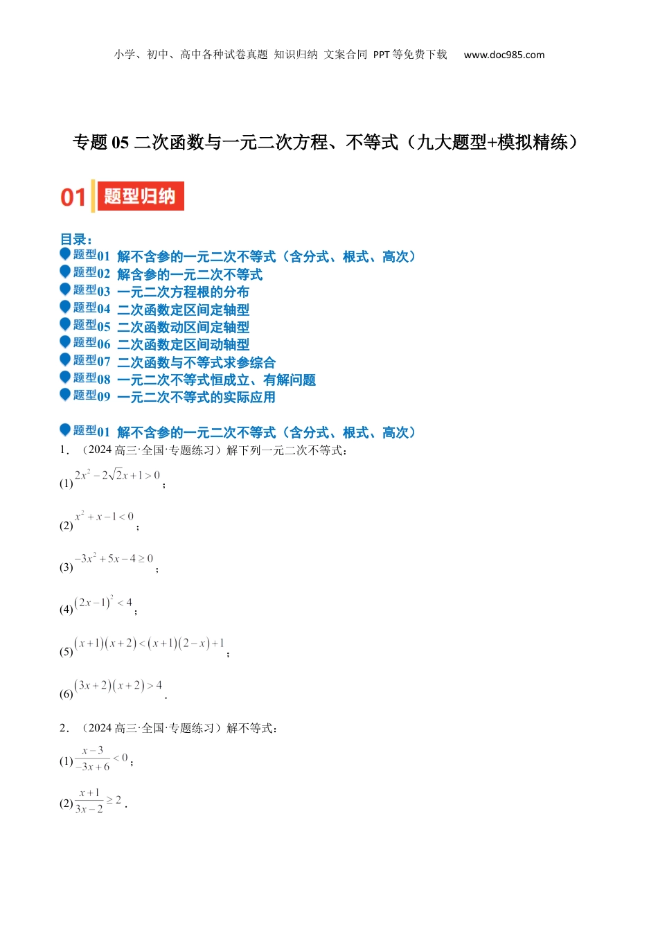 小学、初中、高中各种试卷真题知识归纳文案合同PPT等免费下载www.doc985.com专题05二次函数与一元二次方程、不等式(九大题型+模拟精练)目录:01解不含参的一元二次不等式(含分式、根式、高次)02解含参的一元二次不等式03一元二次方程根的分布04二次函数定区间定轴型05二次函数动区间定轴型06二次函数定区间动轴型07二次函数与不等式求参综合08一元二次不等式恒成立、有解问题09一元二次不等式的实际应用01解不含参的一元二次不等式(含分式、根式、高次)1.(2024高三·全国·专题练习)解下列一元二次不等式:(1);(2);(3);(4);(5);(6).2.(2024高三·全国·专题练习)解不等式:(1);(2).小学、初中、高中各种试卷真题知识归纳文案合同PPT等免费下载www.doc985.com3.(2021高一·上海·专题练习)关于x的不等式的解集是.4.(2022秋-陕西宝鸡-高二统考期中)不等式解集为()A.或B.或C.或D.或或02解含参的一元二次不等式5.(23-24高三上·江苏扬州·阶段练习)若关于的不等式的解集中恰有个整数,则实数m的取值范围为()A.B.C.D.6.(23-24高三上·山东潍坊·期末)已知甲:,乙:关于的不等式,若甲是乙的必要不充分条件,则的取值范围是()A.B.C.D.7.(23-24高三上·云南德宏·期末)已知关于的不等式的解集为,则关于的不等式的解集为()A.B.C.D.8.(21-22高三上·重庆黔江·阶段练习)已知的解集为,则不等式的解集为()小学、初中、高中各种试卷真题知识归纳文案合同PPT等免费下载www.doc985.comA.B.C.或D.9.(23-24高三上·福建·期中)已知关于的不等式的解集为,若,则的最小值是()A.B.C.D.03一元二次方程根的分布10.(2024高三·全国·专题练习)关于的方程有两个不相等的实数根,且,那么的取值范围是()A.B.C.D.11.(23-24高三上·四川·阶段练习)若关于的方程在区间上有两个不相等的实数解,则的取值范围是()A.B.C.D.12.(21-22高三上·山东菏泽·期中)已知不等式组的解集是关于的不等式的解集的子集,则实数a的取值范围为()A.a≤0B.a<0C.a≤-1D.a<-204二次函数定区间定轴型小学、初中、高中各种试卷真题知识归纳文案合同PPT等免费下载www.doc985.com13.(22-23高一上·全国·课后作业)已知一元二次函数y=x2-2x+2,x(0∈,3),则下列有关该函数的最值说法正确的为()A.最小值为2,最大值为5B.最小值为1,最大值为5C.最小值为1,无最大值D.无最值14.(22-23高一上·全国·课后作业)函数的最大值为()A.B.0C.D.105二次函数动区间定轴型15.(22-23高一·全国·课后作业)已知函数的表达式,若,求函数的最值.16.(23-24高一·江苏·假期作业)如果函数定义在区间上,求的值域.06二次函数定区间动轴型17.(22-23高一上·云南昆明·期末)已知二次函数的图像过点和原点,对于任意,都有.(1)求函数的表达式;(2)设,求函数在区间上的最小值.18.(22-23高一上·全国·单元测试)设函数.(1)当时,求函数在区间中的最大值和最小值;(2)若时,恒成立,求的取值范围.07二次函数与不等式求参综合19.(20-21高三上·陕西渭南·阶段练习)若二次函数在上为减函数,则的取值范围为()小学、初中、高中各种试卷真题知识归纳文案合同PPT等免费下载www.doc985.comA.B.C.D.20.(2023高三·全国·专题练习)设二次函数在上有最大值,最大值为,当取最小值时,()A.0B.1C.D.08一元二次不等式恒成立、有解问题21.(23-24高三上·山东滨州·期末)若不等式对任意恒成立,则实数的取值范围是()A.B.C.D.22.(21-22高一上·江苏徐州·阶段练习)若对于任意,都有成立,则实数的取值范围是()A.B.C.D.23.(2023高三·全国·专题练习)若关于x的不等式在区间上有解,则实数m的取值范围为()A.B.C.D.24.(2022·甘肃张掖·模拟预测)若关于的不等式在区间内有解,则实数的取值范围是().小学、初中、高中各种试卷真题知识归纳文案合同PPT等免费下载www.doc985.comA.B.C.D.09一元二次不等式的实际应用25.(23-24高三上·山西吕梁·阶段练习)第19届亚运会于...