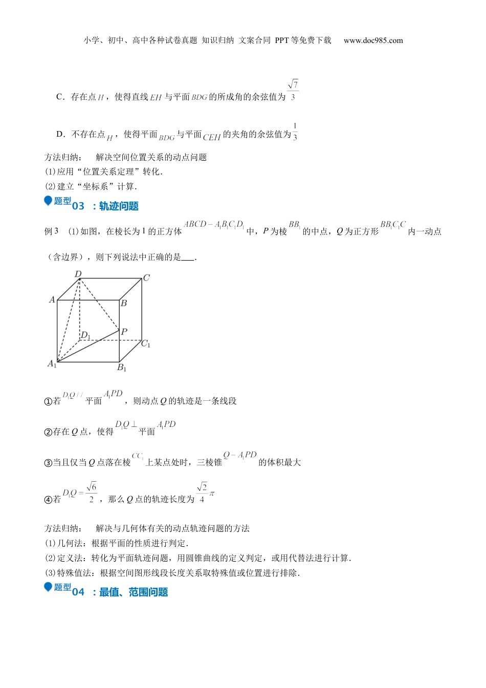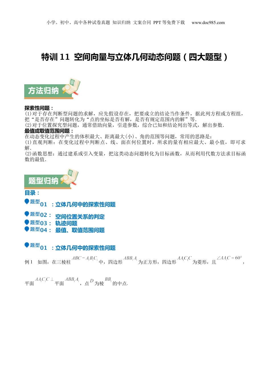 小学、初中、高中各种试卷真题知识归纳文案合同PPT等免费下载www.doc985.com特训11空间向量与立体几何动态问题(四大题型)探索性问题:(1)对于存在判断型问题的求解,应先假设存在,把要成立的结论当作条件,据此列方程或方程组,把“是否存在”问题转化为“点的坐标是否有解,是否有规定范围内的解”等.(2)对于位置探究型问题,通常借助向量,引进参数,综合已知和结论列出等式,解出参数.最值或取值范围问题:在动态变化过程中产生的体积最大、距离最大(小)、角的范围等问题,常用的思路是:(1)直观判断:在变化过程中判断点、线、面在何位置时,所求的量有相应最大、最小值,即可求解.(2)函数思想:通过建系或引入变量,把这类动态问题转化为目标函数,从而利用代数方法求目标函数的最值.目录:01:立体几何中的探索性问题02:空间位置关系的判定03:轨迹问题04:最值、取值范围问题01:立体几何中的探索性问题例1如图,在三棱柱中,四边形为正方形,四边形为菱形,且,平面平面,点为棱的中点.小学、初中、高中各种试卷真题知识归纳文案合同PPT等免费下载www.doc985.com(1)求证:;(2)棱(除两端点外)上是否存在点,使得二面角的余弦值为,若存在,请求出的值;若不存在,请说明理由.方法归纳:(1)对于存在判断型问题的求解,应先假设存在,把要成立的结论当作条件,据此列方程或方程组,把“是否存在”问题转化为“点的坐标是否有解,是否有规定范围内的解”等.(2)对于位置探究型问题,通常借助向量,引进参数,综合已知和结论列出等式,解出参数.02:空间位置关系的判定例2(多选)如图几何体是由正方形沿直线旋转得到的,已知点是圆弧的中点,点是圆弧上的动点(含端点),则下列结论正确的是()A.存在点,使得平面B.不存在点,使得平面平面小学、初中、高中各种试卷真题知识归纳文案合同PPT等免费下载www.doc985.comC.存在点,使得直线与平面的所成角的余弦值为D.不存在点,使得平面与平面的夹角的余弦值为方法归纳:解决空间位置关系的动点问题(1)应用“位置关系定理”转化.(2)建立“坐标系”计算.03:轨迹问题例3(1)如图,在棱长为1的正方体中,P为棱的中点,Q为正方形内一动点(含边界),则下列说法中正确的是.若①平面,则动点Q的轨迹是一条线段存在②Q点,使得平面当且仅当③Q点落在棱上某点处时,三棱锥的体积最大若④,那么Q点的轨迹长度为方法归纳:解决与几何体有关的动点轨迹问题的方法(1)几何法:根据平面的性质进行判定.(2)定义法:转化为平面轨迹问题,用圆锥曲线的定义判定,或用代替法进行计算.(3)特殊值法:根据空间图形线段长度关系取特殊值或位置进行排除.04:最值、范围问题小学、初中、高中各种试卷真题知识归纳文案合同PPT等免费下载www.doc985.com例4如图,在直三棱柱中,△为边长为2的正三角形,为中点,点在棱上,且.(1)当时,求证平面;(2)设为底面的中心,求直线与平面所成角的正弦值的最大值,并求取得最大值时的值.方法归纳:在动态变化过程中产生的体积最大、距离最大(小)、角的范围等问题,常用的思路是(1)直观判断:在变化过程中判断点、线、面在何位置时,所求的量有相应最大、最小值,即可求解.(2)函数思想:通过建系或引入变量,把这类动态问题转化为目标函数,从而利用代数方法求目标函数的最值.例5三棱锥P-ABC中,PA,PB,PC两两垂直,,点Q为平面ABC内的动点,且满足,记直线PQ与直线AB的所成角为,则的取值范围为.(1)先分别求解出两条异面直线的一个方向向量;(2)计算出两个方向向量夹角的余弦值;(3)根据方向向量夹角的余弦值的绝对值等于异面直线所成角的余弦值求解出结果.、题一单选1.(2023·辽宁·模拟预测)已知空间向量两两夹角均为,且.若向量满足小学、初中、高中各种试卷真题知识归纳文案合同PPT等免费下载www.doc985.com,则的最小值是()A.B.C.0D.2.(2024·安徽马鞍山·三模)已知点,,,,,都在同一个球面上,为正方形,若直线经过球心,且平面.则异面直线,所成的角最小为()A.B.C.D.3.(2020·浙江嘉兴·二模)将边长为1的正方形沿对角线翻折,使得二面角的平面角的大...