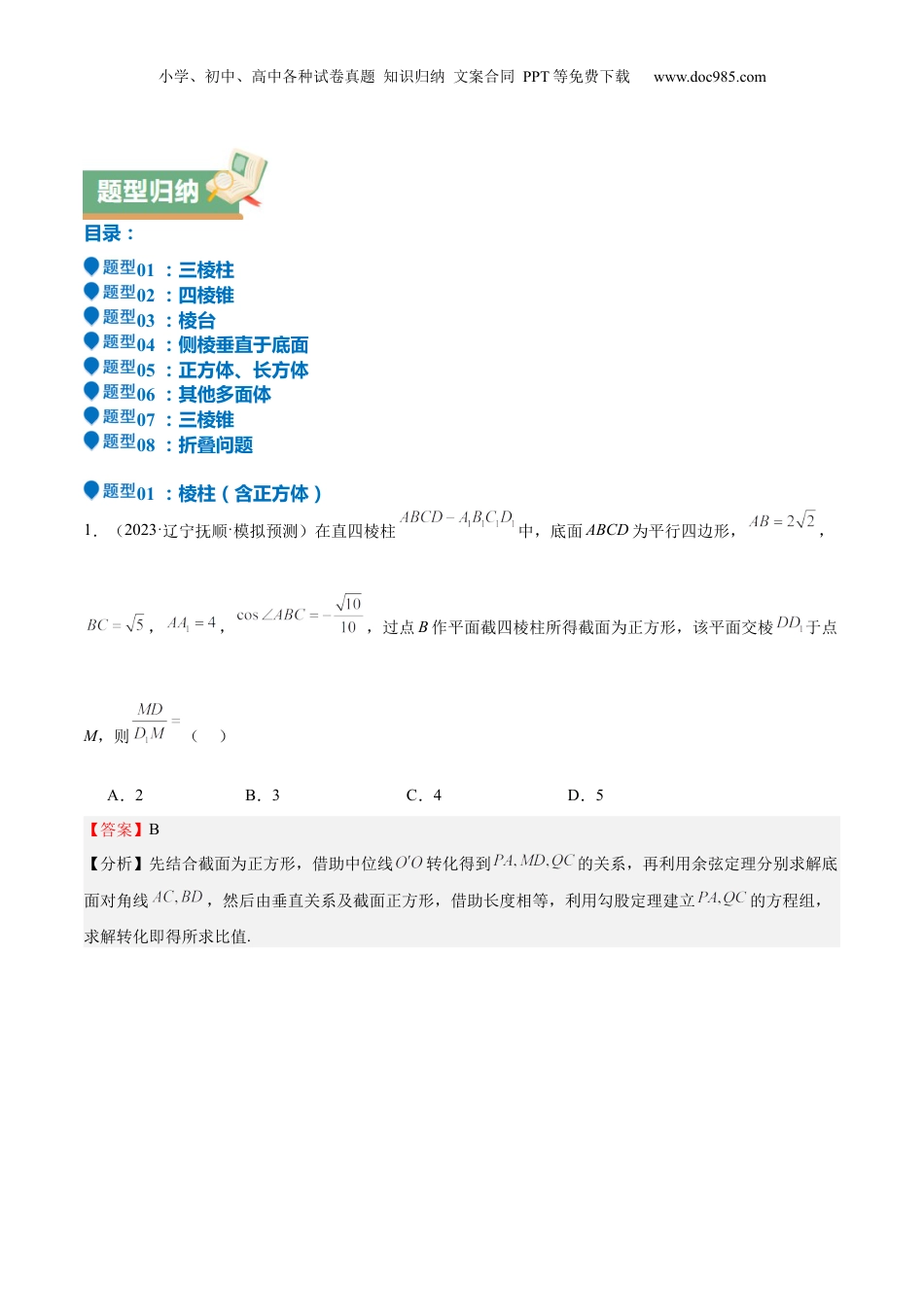 小学、初中、高中各种试卷真题知识归纳文案合同PPT等免费下载www.doc985.com特训10题立体几何中的截面问(七大题型)用一个平面去截几何体,此平面与几何体的交集,叫做这个几何体的截面.此平面与几何体表面的交集(交线)叫做截线.1.作截线与截点的主要根据:(1)确定平面的条件.(2)如果两个不重合的平面有一个公共点,那么它们相交于过此点的一条直线.(3)如果一条直线上的两点在一个平面内,那么这条直线上所有的点都在这个平面内.(4)线面平行的性质定理。(5)如果两个平面平行,第三个平面和它们相交,那么两条交线平行.2.立体几何图形中有关截面的做法:若已知两点在同一平面内,只要连接这两点,就可以得到截面与多面体的一个面的截线。①若面上只有一个已知点,应设法在同一平面上再找出第二个确定的点②;若两个已知点分别在相邻的面上,应找出这两个相邻平面的交线与截面的交点。③面面平行的性质定理。④若有一点在面上而不在棱上,则可通过作辅助平而找出棱上的交点⑤;若已知点在体内,则可通过辅助平面找出面上的交点,再找出棱上的交点.小学、初中、高中各种试卷真题知识归纳文案合同PPT等免费下载www.doc985.com目录:01:三棱柱02:四棱锥03:棱台04:侧棱垂直于底面05:正方体、长方体06:其他多面体07:三棱锥08:折叠问题01:棱柱(含正方体)1.(2023·辽宁抚顺·模拟预测)在直四棱柱中,底面ABCD为平行四边形,,,,,过点B作平面截四棱柱所得截面为正方形,该平面交棱于点M,则()A.2B.3C.4D.5【答案】B【分析】先结合截面为正方形,借助中位线转化得到的关系,再利用余弦定理分别求解底面对角线,然后由垂直关系及截面正方形,借助长度相等,利用勾股定理建立的方程组,求解转化即得所求比值.小学、初中、高中各种试卷真题知识归纳文案合同PPT等免费下载www.doc985.com【解析】如图,设截面分别交,于点P,Q,连接PQ,BM,设交点,连接,设交点,由已知截面为正方形,则是,的中点,底面ABCD为平行四边形,则是,的中点,又,,则,则是的中位线,也是四边形的中位线.设,,故,由,得,化简得(*),且,由直四棱柱知,平面,又平面,则则四边形为直角梯形.由,得,小学、初中、高中各种试卷真题知识归纳文案合同PPT等免费下载www.doc985.com在中,由余弦定理得,解得,同理可得,如图,在直角梯形中,在CQ上取点S,使,则.由,得,即,化简得,与(*)联立,解得,,所以,则,验证知,此时四边形为为正方形,满足题意.则.故选:B.2.(2023·江西赣州·模拟预测)在直四棱柱中,底面ABCD是边长为2的正方形,侧棱,E是BC的中点,F是棱上的点,且,过作平面,使得平面平面AEF,则平面截直四棱柱,所得截面图形的面积为()小学、初中、高中各种试卷真题知识归纳文案合同PPT等免费下载www.doc985.comA.B.C.3D.【答案】A【分析】根据四棱柱的几何性质以及面面平行的判定定理求解.【解析】如图,取的中点M,在上取一点H,使得,连接,如上图,则,平面,平面AEF,平面平面;即过点平行于平面AEF的平面截四棱柱的图形是三角形,其中,,故选:A.3.(2024·安徽安庆·三模)在正方体中,点分别为棱的中点,过点三点作该正方体的截面,则()A.该截面多边形是四边形B.该截面多边形与棱的交点是棱的一个三等分点小学、初中、高中各种试卷真题知识归纳文案合同PPT等免费下载www.doc985.comC.平面D.平面平面【答案】B【分析】将线段向两边延长,分别与棱的延长线,棱的延长线交于,连分别与棱交于,可判断A;利用相似比可得,可判断B;证明平面即可判断C;通过证明平面,可判断D.【解析】对于A,将线段向两边延长,分别与棱的延长线,棱的延长线交于,连分别与棱交于,得到截面多边形是五边形,A错误;对于B,易知和全等且都是等腰直角三角形,所以,所以,即,点是棱的一个三等分点,B正确;对于C,因为平面,平面,所以,又,平面,所以平面,因为平面,所以,同理可证,小学、初中、高中各种试卷真题知识归纳文案合同PPT等免费下载www.doc985.com因为平面,所以平面,因为平面与平面相交,所以与平面不垂直,C错误;对于D,易知,所以,又,所以平面...