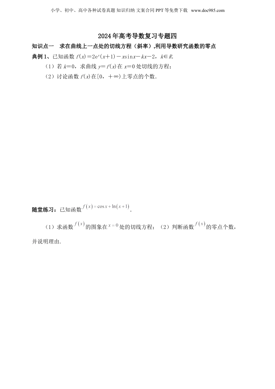 小学、初中、高中各种试卷真题知识归纳文案合同PPT等免费下载www.doc985.com2024年高考导数复习专题四知识点一求在曲线上一点处的切线方程(斜率),利用导数研究函数的零点典例1、已知函数f(x)=2ex(x+1)-xsinx-kx-2,k∈R.(1)若k=0,求曲线y=f(x)在x=0处切线的方程;(2)讨论函数f(x)在[0,+∞)上零点的个数.随堂练习:已知函数.(1)求函数的图象在处的切线方程;(2)判断函数的零点个数,并说明理由.小学、初中、高中各种试卷真题知识归纳文案合同PPT等免费下载www.doc985.com典例2、已知函数.(1)当时,求曲线在点处的切线方程;(2)讨论在区间上的零点个数.随堂练习:已知函数.(1)若,求曲线的斜率等于3的切线方程;(2)若在区间上恰有两个零点,求a的取值范围.小学、初中、高中各种试卷真题知识归纳文案合同PPT等免费下载www.doc985.com典例3、已知函数,其中为常数.(1)当时,求曲线在处的切线方程;(2)若函数在区间上只有一个零点,求的取值范围.随堂练习:已知函数,其中.(1)若,求曲线在点处的切线方程;(2)若在内只有一个零点,求的取值范围.小学、初中、高中各种试卷真题知识归纳文案合同PPT等免费下载www.doc985.com知识点二求在曲线上一点处的切线方程(斜率),利用导数研究不等式恒成立问题利用导数研究函数的零点典例4、已知函数,曲线在处的切线方程为.(1)求的值;(2)函数在区间上存在零点,求的值;(3)记函数,设()是函数的两个极值点,若,且恒成立,求实数的最大值.随堂练习:已知函数(1)若,求曲线在点处的切线方程;(2)若,且在区间上恒成立,求的取值范围;(3)若,判断函数的零点的个数.小学、初中、高中各种试卷真题知识归纳文案合同PPT等免费下载www.doc985.com典例5、已知函数.(1)求曲线在处的切线方程;(2)函数在区间上有零点,求k的值;(3)记函数,设是函数的两个极值点,若,且恒成立,求实数k的取值范围.随堂练习:已知函数,设.(1)若,求的最小值(2)若函数有两个零点,求实数m的取值范围;(3)若直线是曲线的一条切线,求证:,都有.小学、初中、高中各种试卷真题知识归纳文案合同PPT等免费下载www.doc985.com典例6、已知函数,().(1)求函数在点(e,e)处的切线方程;(2)已知,求函数极值点的个数;(3)若对任意,不等式恒成立,求实数a的取值范围.随堂练习:已知函数.(1)求函数在处的切线方程;(2)若对任意的,恒成立,求a的取值范围;小学、初中、高中各种试卷真题知识归纳文案合同PPT等免费下载www.doc985.com(3)当a=3时,设函数,证明:对于任意的k<1,函数有且只有一个零点.2024年高考导数复习专题四答案典例1、答案:(1)(2)当时,有且仅有1个零点;当时,有有2个零点.解:(1)当时,,,则曲线在处切线的斜率为,又,故切点为,因此切线方程为.(2)首先证明:当时,.证明:设,,则,单调递增,于是,即原不等式得证.,,当时,,故在上单小学、初中、高中各种试卷真题知识归纳文案合同PPT等免费下载www.doc985.com调递增.若,则当时,,单调递增,又,故此时有且仅有1个零点.若,则,又,所以在上存在唯一的零点,,当,,当,,所以在上单调递减,在上单调递增,又,且,,因此在上有2个零点.综上,当时,有且仅有1个零点;当时,有有2个零点.随堂练习:答案:(1)(2)在区间上有且仅有一个零点,理由见解析解:(1),所以函数的图象在处的切线方程为,即.(2)设,则,①当时,,所以单调递减;且,,小学、初中、高中各种试卷真题知识归纳文案合同PPT等免费下载www.doc985.com由零点存在定理可知,在区间存在唯一的,使又当时,;当时,,所以在上单调递增,且,,所以在上有唯一零点;当时,单调递减,且,所以在上没有零点.②当时,单调递增,,,所以在区间有唯一零点,设为,当时,,此时单调递减;当时,,此时单调递增;在区间上,此时单调递减,且,故有,此时单调递减,且,小学、初中、高中各种试卷真题知识归纳文案合同PPT等免费下载www.doc985.com由,得,所以.当时,,所以单调递增,又,故,,,所以存在,使,即,故为的极小值点.此时.所...