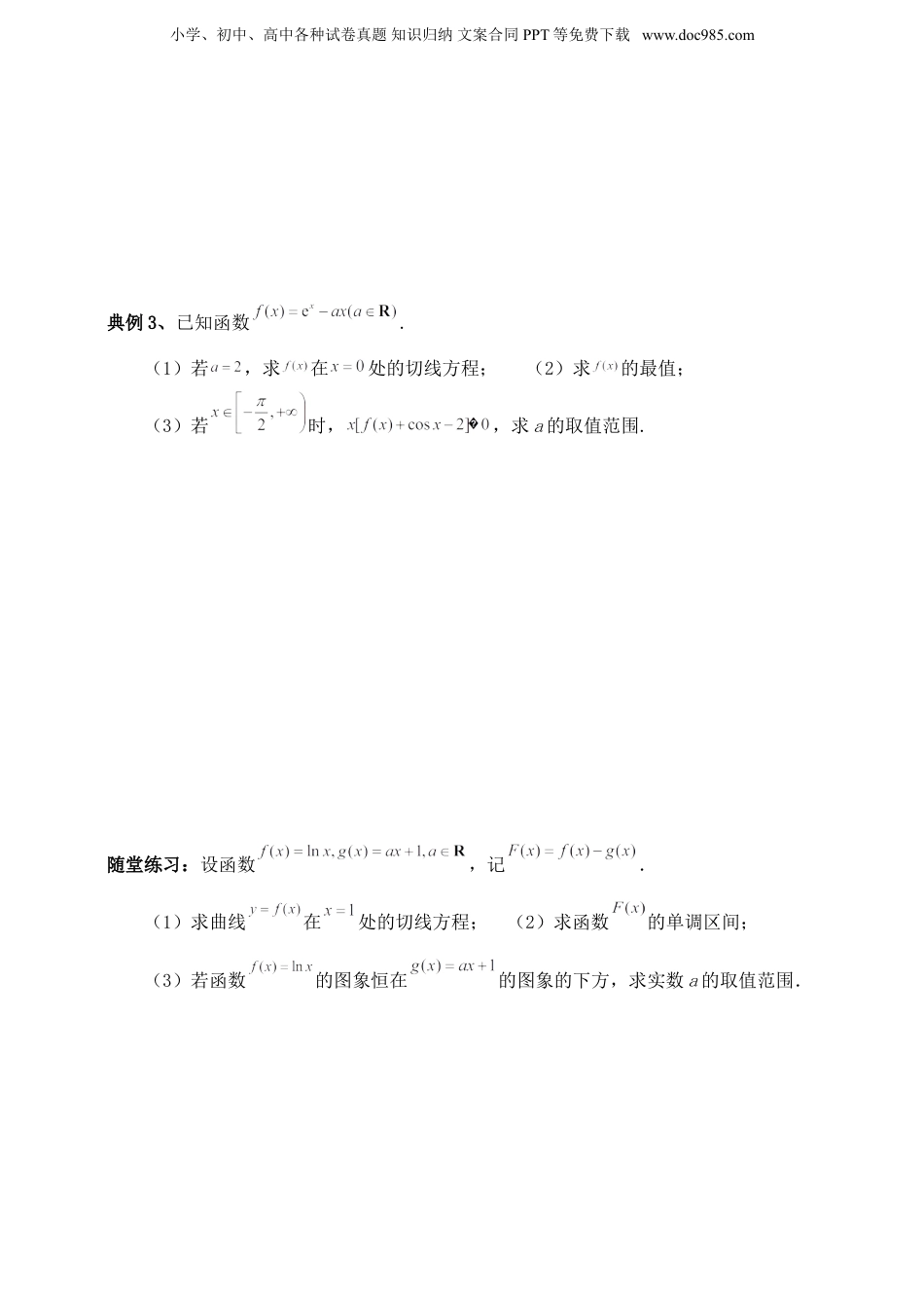 小学、初中、高中各种试卷真题知识归纳文案合同PPT等免费下载www.doc985.com2024年高考导数复习专题八知识点一求在曲线上一点处的切线方程(斜率),利用导数研究不等式恒成立问题,由导数求函数的最典例1、已知函数.(1)若,求函数的单调递减区间;(2)若,求函数在区间上的最大值;(3)若在区间上恒成立,求的最大值.随堂练习:已知.(1)若有最值,求实数a的取值范围;(2)若当时,,求实数a的取值范围.小学、初中、高中各种试卷真题知识归纳文案合同PPT等免费下载www.doc985.com典例2、已知函数且.(1)当时,求曲线在点处的切线方程;(2)若恒成立,求的取值范围.随堂练习:已知.(1)已知函数在点的切线与圆相切,求实数a的值;(2)当时,,求实数a的取值范围.小学、初中、高中各种试卷真题知识归纳文案合同PPT等免费下载www.doc985.com典例3、已知函数.(1)若,求在处的切线方程;(2)求的最值;(3)若时,,求a的取值范围.随堂练习:设函数,记.(1)求曲线在处的切线方程;(2)求函数的单调区间;(3)若函数的图象恒在的图象的下方,求实数a的取值范围.小学、初中、高中各种试卷真题知识归纳文案合同PPT等免费下载www.doc985.com知识点二求在曲线上一点处的切线方程(斜率),用导数判断或证明已知函数的单调性,利用导数证明不等式典例4、设函数.(1)若,求在点处的切线方程;(2)求的单调递减区间;(3)求证:不等式恒成立.随堂练习:已知函数.(1)当时,求函数的图象在处的切线方程;(2)讨论函数的单调性;(3)当时,若方程有两个不相等的实数根,求证:.小学、初中、高中各种试卷真题知识归纳文案合同PPT等免费下载www.doc985.com典例5、已知函数(1)求曲线在点处的切线方程;(2)求的单调区间;(3)若关于x的方程有两个不相等的实数根,记较小的实数根为,求证:随堂练习:已知函数为常数,是自然对数的底数),曲线在点,处的切线与轴平行.(1)求的值;(2)求的单调区间;(3)设,其中为的导函数.证明:对任意,小学、初中、高中各种试卷真题知识归纳文案合同PPT等免费下载www.doc985.com.典例6、已知直线是函数图象的切线,也是曲线的切线.(1)求,的值;(2)证明:当,,时,;(3)当时,讨论函数的单调性.随堂练习:已知函数,为的导函数.小学、初中、高中各种试卷真题知识归纳文案合同PPT等免费下载www.doc985.com(1)当时,求曲线在点处的切线方程;(2)当时,求函数的单调区间和极值;(3)当时,求证:对任意的,,且,有.2024年高考导数复习专题八答案典例1、答案:(1)(2)答案见详解(3)1解:(1)当时,,则,令.因为,则所以函数的单调递减区间是(2).令,由,解得,(舍去).当,即时,在区间上,函数在上是减函数.所以函数在区间上的最大值为;小学、初中、高中各种试卷真题知识归纳文案合同PPT等免费下载www.doc985.com当,即时,在上变化时,的变化情况如下表x++-↗↘所以函数在区间上的最大值为.(3)综上所述:当时,函数在区间上的最大值为;当时,函数在区间上的最大值为.当时,则在上恒成立∴函数在上是减函数,则∴成立当时,由(2)可知:①当时,在区间上恒成立,则成立;②当时,由于在区间上是增函数,所以,即在区间上存在使得,不成立综上所述:的取值范围为,即的最大值为.随堂练习:答案:(1)(2)解:(1)函数的定义域为,,当时,在上恒成立,则在上单调递增,无最值,不合题意,舍去当时,令,则,令,则∴在上单调递减,在上单调递增,则在处取到最小值所以,即实数a的取值范围为.小学、初中、高中各种试卷真题知识归纳文案合同PPT等免费下载www.doc985.com(2)因为,,所以,因为,所以成立.令,则令,则当时恒成立∴在上单调递增,则则当时恒成立所以函数在上单调递增,所以,所以,即实数a的取值范围为.典例2、答案:(1)(2)解:(1)当时,因为,所以,,又因为,所以曲线在点处的切线方程为,即;(2)因为且,所以,当时,,所以在上单调递增,取,则,不符合题意,当时,令,解得或(舍),当时,,所以在区间上单调递减,当时,,所以在区间上单调递增,所...