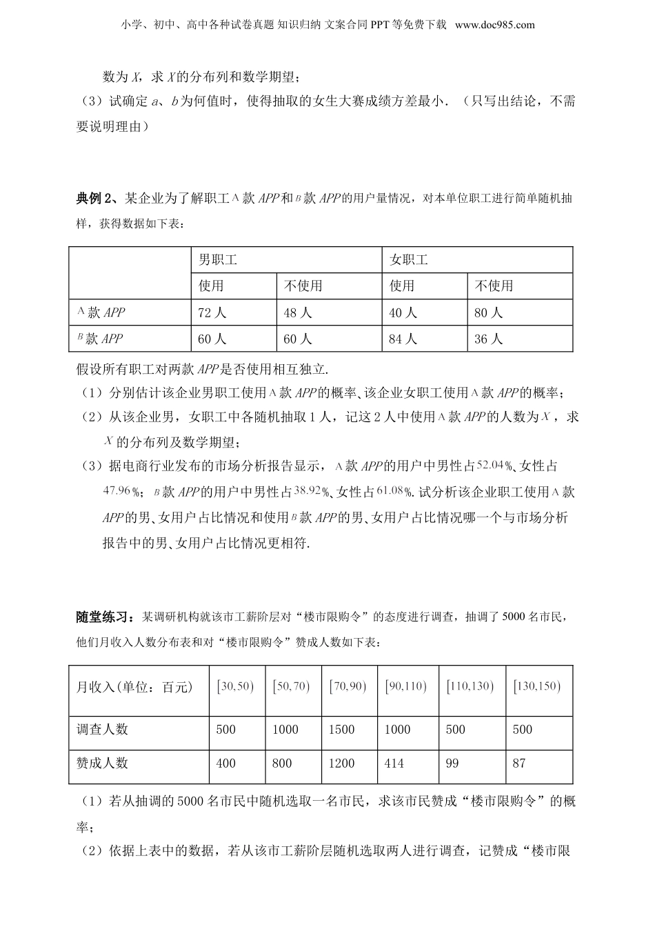 小学、初中、高中各种试卷真题知识归纳文案合同PPT等免费下载www.doc985.com人教A版数学--概率专题四知识点一根据频率分布表解决实际问题,用频率估计概率,求离散型随机变量的均值典例1、《中华人民共和国老年人权益保障法》规定,老年人的年龄起点标准是60周岁.为解决老年人打车难问题,许多公司均推出老年人一键叫车服务.某公司为调查老年人对打车软件的使用情况,在某地区随机抽取了100位老年人,调查结果整理如下:年龄/岁80岁以上使用过打车软件人数41201151未使用过打车软件人数13963(1)从该地区的老年人中随机抽取1位,试估计该老年人的年龄在且未使用过打车软件的概率;(2)从参与调查的年龄在且使用过打车软件的老年人中,随机抽取2人进一步了解情况,用X表示这2人中年龄在的人数,求随机变量X的分布列及数学期望;(3)为鼓励老年人使用打车软件,该公司拟对使用打车软件的老年人赠送1张10元的代金券,若该地区有5000位老年人,用样本估计总体,试估计该公司至少应准备多少张代金券.随堂练习:近期,某中学全体学生参加了“全国节约用水大赛”活动.现从参加该活动的学生中随机抽取了男、女各25名学生,将他们的成绩(单位:分)记录如下:成绩男生(人数)25891女生(人数)ab1032(1)在抽取的50名学生中,从大赛成绩在80分以上的人中随机取出2人,求恰好男、女生各1名,且所在分数段不同的概率;(2)从该校参加活动的男学生中随机抽取3人,设这3人中大赛成绩在80分以上的人小学、初中、高中各种试卷真题知识归纳文案合同PPT等免费下载www.doc985.com数为X,求X的分布列和数学期望;(3)试确定a、b为何值时,使得抽取的女生大赛成绩方差最小.(只写出结论,不需要说明理由)典例2、某企业为了解职工款APP和款APP的用户量情况,对本单位职工进行简单随机抽样,获得数据如下表:男职工女职工使用不使用使用不使用款APP72人48人40人80人款APP60人60人84人36人假设所有职工对两款APP是否使用相互独立.(1)分别估计该企业男职工使用款APP的概率该企业女职工使用、款APP的概率;(2)从该企业男,女职工中各随机抽取1人,记这2人中使用款APP的人数为,求的分布列及数学期望;(3)据电商行业发布的市场分析报告显示,款APP的用户中男性占%女性占、%;款APP的用户中男性占%女性占、%.试分析该企业职工使用款APP的男女用户占比情况和使用、款APP的男女用户占比情况哪一个与市场分析、报告中的男女用户占比情况更相符、.随堂练习:某调研机构就该市工薪阶层对“楼市限购令”的态度进行调查,抽调了5000名市民,他们月收入人数分布表和对“楼市限购令”赞成人数如下表:月收入(单位:百元)调查人数500100015001000500500赞成人数40080012004149987(1)若从抽调的5000名市民中随机选取一名市民,求该市民赞成“楼市限购令”的概率;(2)依据上表中的数据,若从该市工薪阶层随机选取两人进行调查,记赞成“楼市限小学、初中、高中各种试卷真题知识归纳文案合同PPT等免费下载www.doc985.com购令”的人数为X,求X的分布列和数学期望;(3)若从抽调的收入在(百元)的市民中随机抽取两名,记赞成“楼市限购令”的人数为,期望记作;若从抽调的收入在(百元)的市民中随机抽取两名,记赞成“楼市限购令”的人数为,期望记作,比较与的大小关系.(直接写出结论即可)典例3、小明所在学习小组开展社会调查,记录了某快餐连锁店每天骑手的人均业务量.现随机抽取100天的数据,将样本数据分为,,,,,,七组,整理得到如图所示的频率分布直方图.(1)随机选取一天,估计这一天该连锁店的骑手的人均日快递业务量不少于65单的概率;(2)将上图中的频率作为相应的概率,从该连锁店的骑手中任意选3人,记其中业务量不少于65单的人数为,求的分布列和数学期望.(3)如果该连锁店的骑手每送1单可以提成3元,试估计一名骑手每天的收入.并说明理由.随堂练习:人类常见的遗传病类型主要分为单基因遗传病、多基因遗传病和染色体异常遗传病三大类,高度近视(600度以上)、红绿色盲都是较常见的单基因遗传病.某学校课后实践活动对学生这两种遗传病情况进行统计,分别从男、女同学中各随机...