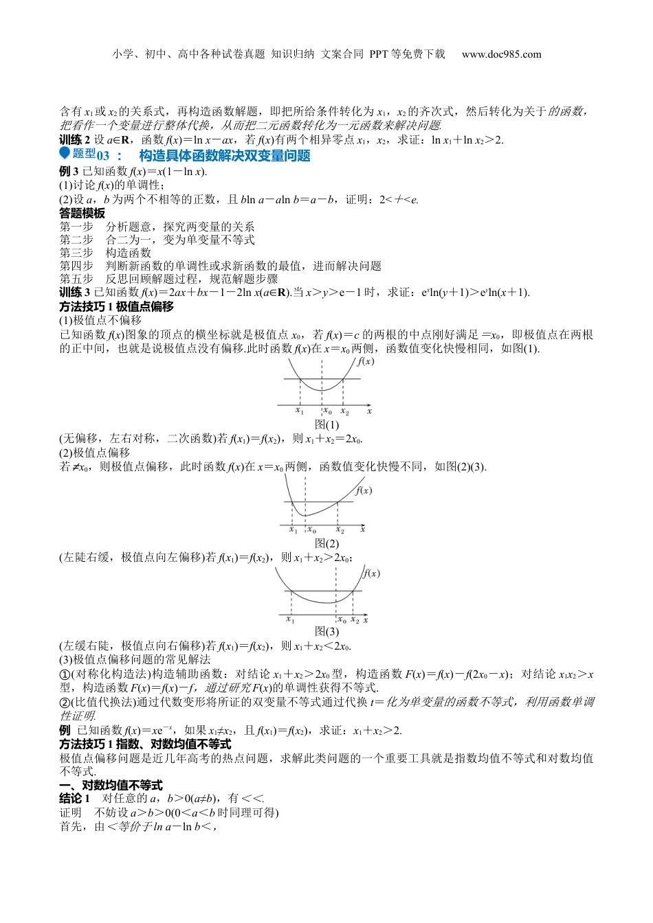小学、初中、高中各种试卷真题知识归纳文案合同PPT等免费下载www.doc985.com特训07利用导数解决双变量问题(三大题型)如果两个变量之间不存在具体直观的等量关系,但可以通过适当的代数变形将两个变量化为某种结构的整体,常见如x₂-x,,这种通过换元实现双变量合二为一目的,把双变量转化为单变量的手段分别称为差值代换和比值代换“”“”.注:如果所给条件能转化为关于变量x₁,x₂的齐次式,常常建立关于的函数.导数中解决双变量问题的步骤:(1)先根据已知条件确定出两个变量x₁,x₂满足的条件;(2)将双变量转化为单变量,具体有两种可行的方法:将所有涉及①x₁,x₂的式子转化为关于的式子,令,将问题转化为关于自变量t的函数问题;令②t=x₂-x₁,将问题转化为关于自变量t的函数问题.注:需要关注新元的范围即为新函数的定义域,借助新函数的单调性和值域完成问题的分析求解.目录:01:转化为同源函数解决02:整体代换03:构造具体函数解决双变量问题01:转化为同源函数解决例1已知函数f(x)=lnx-ax+1,其中a为实常数.对于函数图象上任意不同的两点A(x1,f(x1)),B(x2,f(x2)),直线AB的斜率为k,若x1+x2+k>0恒成立,求a的取值范围.感悟提升此类问题一般是给出含有x1,x2,f(x1),f(x2)的不等式,若能通过变形,把不等式两边转化为结构形式相同的代数式,即转化为同源函数,可利用该函数单调性求解.训练1已知函数f(x)=alnx+x2,在其图象上任取两个不同的点P(x1,y1),Q(x2,y2)(x1>x2),总能使得>2,则实数a的取值范围为()A.(1,+∞)B.[1,+∞)C.(1,2)D.[1,2]02:整体代换例2设函数f(x)=x2-(a+2)x+alnx,g(x)=2alnx-4x+b,其中a>0,b∈R.已知a>2,且方程f(x)=g(x)在(1,+∞)上有两个不相等的实数根x1,x2,求证:f′>0.感悟提升(1)解此类题的关键是利用代入消元法消去参数a,得到仅含有x1,x2的式子.(2)与极值点x1,x2有关的双变量问题,一般是根据x1,x2是方程f′(x)=0的两个根,确定x1,x2的关系,再通过消元转化为只小学、初中、高中各种试卷真题知识归纳文案合同PPT等免费下载www.doc985.com含有x1或x2的关系式,再构造函数解题,即把所给条件转化为x1,x2的齐次式,然后转化为关于的函数,把看作一个变量进行整体代换,从而把二元函数转化为一元函数来解决问题.训练2设a∈R,函数f(x)=lnx-ax,若f(x)有两个相异零点x1,x2,求证:lnx1+lnx2>2.03:构造具体函数解决双变量问题例3已知函数f(x)=x(1-lnx).(1)讨论f(x)的单调性;(2)设a,b为两个不相等的正数,且blna-alnb=a-b,证明:2<+<e.答题模板第一步分析题意,探究两变量的关系第二步合二为一,变为单变量不等式第三步构造函数第四步判断新函数的单调性或求新函数的最值,进而解决问题第五步反思回顾解题过程,规范解题步骤训练3已知函数f(x)=2ax+bx-1-2lnx(a∈R).当x>y>e-1时,求证:exln(y+1)>eyln(x+1).方法技巧1极值点偏移(1)极值点不偏移已知函数f(x)图象的顶点的横坐标就是极值点x0,若f(x)=c的两根的中点刚好满足=x0,即极值点在两根的正中间,也就是说极值点没有偏移.此时函数f(x)在x=x0两侧,函数值变化快慢相同,如图(1).图(1)(无偏移,左右对称,二次函数)若f(x1)=f(x2),则x1+x2=2x0.(2)极值点偏移若≠x0,则极值点偏移,此时函数f(x)在x=x0两侧,函数值变化快慢不同,如图(2)(3).图(2)(左陡右缓,极值点向左偏移)若f(x1)=f(x2),则x1+x2>2x0;图(3)(左缓右陡,极值点向右偏移)若f(x1)=f(x2),则x1+x2<2x0.(3)极值点偏移问题的常见解法①(对称化构造法)构造辅助函数:对结论x1+x2>2x0型,构造函数F(x)=f(x)-f(2x0-x);对结论x1x2>x型,构造函数F(x)=f(x)-f,通过研究F(x)的单调性获得不等式.②(比值代换法)通过代数变形将所证的双变量不等式通过代换t=化为单变量的函数不等式,利用函数单调性证明.例已知函数f(x)=xe-x,如果x1≠x2,且f(x1)=f(x2),求证:x1+x2>2.方法技巧1指数、对数均值不等式极值点偏移问题是近几年高考的热点问题,求解此类问题的一个重要工具就是指数均值不等式和对数均值不等式.一、对数均值不等式结论1...
