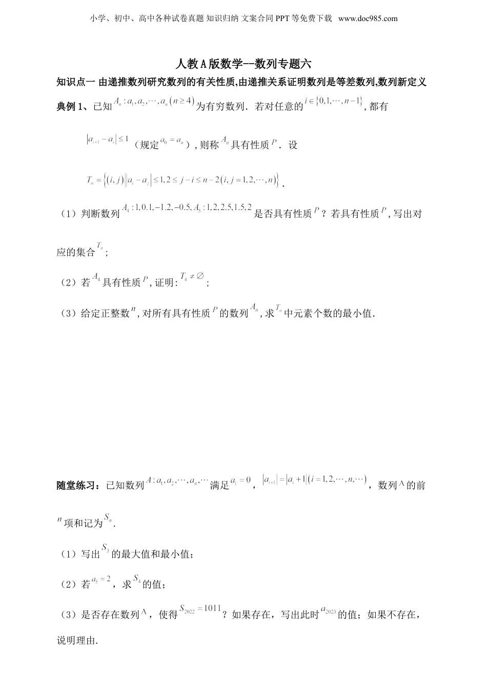 小学、初中、高中各种试卷真题知识归纳文案合同PPT等免费下载www.doc985.com人教A版数学--数列专题六知识点一由递推数列研究数列的有关性质,由递推关系证明数列是等差数列,数列新定义典例1、已知为有穷数列.若对任意的,都有(规定),则称具有性质.设.(1)判断数列是否具有性质?若具有性质,写出对应的集合;(2)若具有性质,证明:;(3)给定正整数,对所有具有性质的数列,求中元素个数的最小值.随堂练习:已知数列满足,,数列的前项和记为.(1)写出的最大值和最小值;(2)若,求的值;(3)是否存在数列,使得?如果存在,写出此时的值;如果不存在,说明理由.小学、初中、高中各种试卷真题知识归纳文案合同PPT等免费下载www.doc985.com典例2、已知为实数,数列满足.(1)当和时,分别写出数列的前5项;(2)证明:当时,存在正整数,使得;(3)当时,是否存在实数及正整数,使得数列的前项和?若存在,求出实数及正整数的值;若不存在,请说明理由.随堂练习:已知数列满足:,且.记集合.(1)若,写出集合的所有元素;小学、初中、高中各种试卷真题知识归纳文案合同PPT等免费下载www.doc985.com(2)若集合存在一个元素是3的倍数,证明:的所有元素都是3的倍数;(3)求集合的元素个数的最大值.典例3、已知数列的首项,其中,令集合,.(1)若是数列中首次为1的项,请写出所有这样数列的前三项;(2)求证:;(3)当时,求集合中元素个数的最大值.小学、初中、高中各种试卷真题知识归纳文案合同PPT等免费下载www.doc985.com随堂练习:已知无穷数列满足公式,设.(1)若,求的值;(2)若,求的值;(3)给定整数,是否存在这样的实数,使数列满足:①数列的前项都不为零;②数列中从第项起,每一项都是零.若存在,请将所有这样的实数从小到大排列形成数列,并写出数列的通项公式;若不存在,请说明理由.知识点二利用定义求等差数列通项公式,由递推关系证明数列是等差数列,反证法证明,利用an与sn关系求通项或项典例4、已知数列{an}的前n项和为Sn,且满足an+Sn=2.(1)求数列{an}的通项公式;(2)求证:数列{an}中不存在三项按原来顺序成等差数列.小学、初中、高中各种试卷真题知识归纳文案合同PPT等免费下载www.doc985.com随堂练习:已知数列满足:,,记数列,(1)证明数列是等比数列;(2)求数列的通项公式;(3)是否存在数列的不同项使之称为等差数列?若存在,请求出这样的不同项;若不存在,请说明理由.典例5、设数列的前项和为,且,.(1)求证:数列为等比数列;(2)设数列的前项和为,求证:为定值;(3)判断数列中是否存在三项成等差数列,并证明你的结论.小学、初中、高中各种试卷真题知识归纳文案合同PPT等免费下载www.doc985.com随堂练习:已知数列的前项和满足,数列的前项和满足且.(1)求数列,的通项公式;(2)设,求数列的前项和;(3)数列中是否存在不同的三项,,,使这三项恰好构成等差数列?若存在,求出,,的关系;若不存在,请说明理由.典例6、已知等比数列的前项和为,,.数列的前项和为,且,.小学、初中、高中各种试卷真题知识归纳文案合同PPT等免费下载www.doc985.com(1)分别求数列和的通项公式;(2)若,为数列的前项和,是否存在不同的正整数,,(其中,,成等差数列),使得,,成等比数列?若存在,求出所有满足条件的,,的值;若不存在,说明理由.随堂练习:若数列的前项和为,且满足等式.(1)求数列的通项公式;(2)能否在数列中找到这样的三项,它们按原来的顺序构成等差数列?说明理由;(3)令,记函数的图像在轴上截得的线段长为,设,求,并证明:.小学、初中、高中各种试卷真题知识归纳文案合同PPT等免费下载www.doc985.com人教A版数学--数列专题六典例1、答案:(1)不具有性质,具有性质,(2)证明见解析(3)解:(1)解:由题知,即因为,所以不具有性质,由于,即因为故具有性质,因为故;(2)“”等价于“证明两个元素至少有一个在中”,假设两个元素均不在中,则有不妨设,若,则由,可得,与矛盾,故,同理,从而,所以,与具有性质矛盾,所以假设不成立,即;(3)设规定时,,时,,小学、初中、高中各种试卷真题知识归纳文案合同PPT...