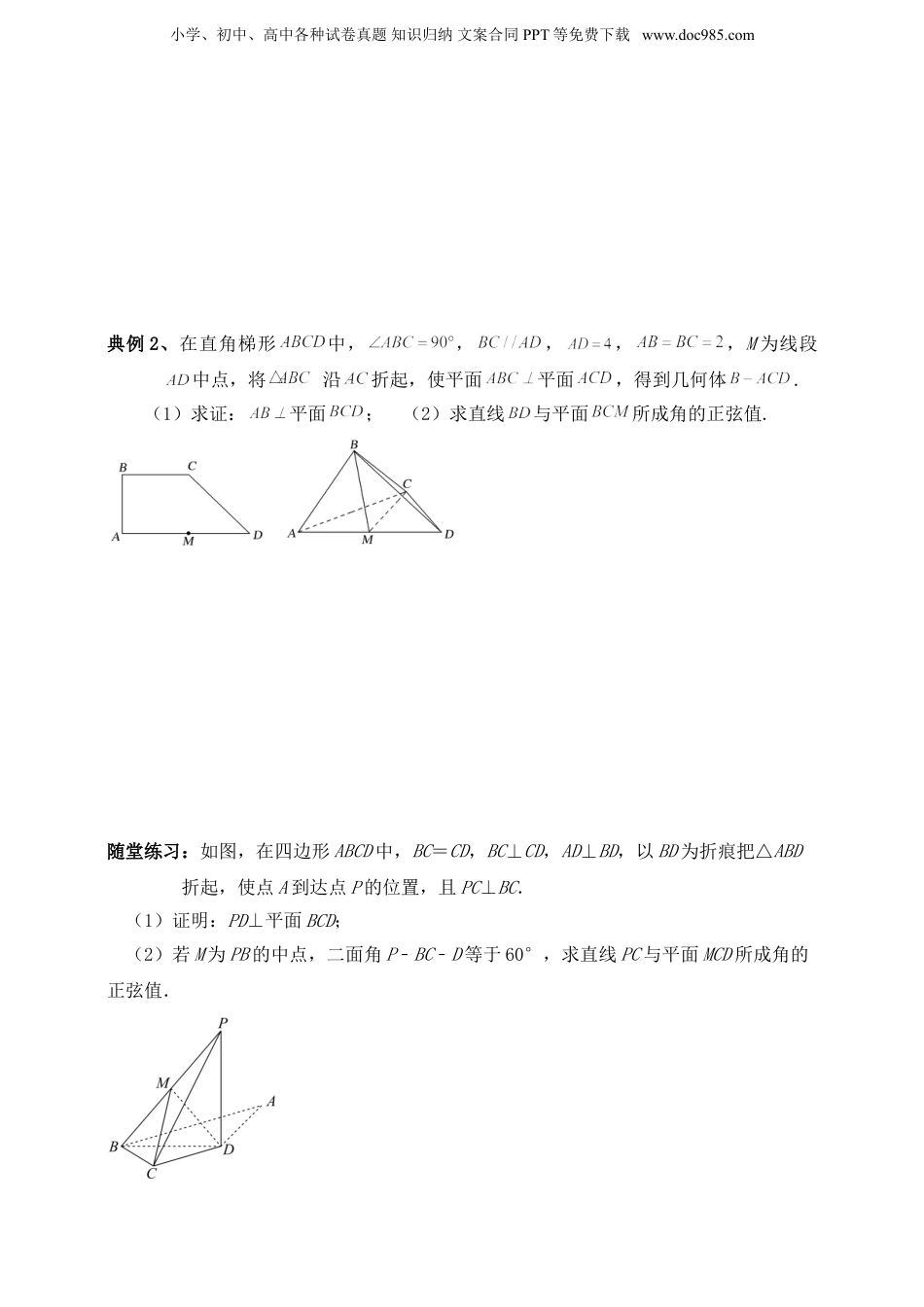 小学、初中、高中各种试卷真题知识归纳文案合同PPT等免费下载www.doc985.com空间向量和立体几何高考复习专题十五知识点一证明线面垂直,线面垂直证明线线垂直,线面角的向量求法典例1、如图,在三棱柱中,平面,,.(1)求证:平面;(2)记和的交点为M,点N在线段上,满足平面,求直线与平面所成角的正弦值.随堂练习:如图,在三棱柱中,,F是的中点.(1)证明:;(2)求与平面所成角的正弦值.小学、初中、高中各种试卷真题知识归纳文案合同PPT等免费下载www.doc985.com典例2、在直角梯形中,,,,,M为线段中点,将沿折起,使平面平面,得到几何体.(1)求证:平面;(2)求直线与平面所成角的正弦值.随堂练习:如图,在四边形ABCD中,BC=CD,BC⊥CD,AD⊥BD,以BD为折痕把△ABD折起,使点A到达点P的位置,且PC⊥BC.(1)证明:PD⊥平面BCD;(2)若M为PB的中点,二面角P﹣BC﹣D等于60°,求直线PC与平面MCD所成角的正弦值.小学、初中、高中各种试卷真题知识归纳文案合同PPT等免费下载www.doc985.com知识点二证明线面平行,求组合体的体积典例3、如图所示,在直三棱柱中,D是的中点.(1)证明:平面;(2)设,求三棱锥的体积.随堂练习:已知四棱锥中,,平面,点为三等分点(靠近点),,,.(1)求证:平面;(2)求三棱锥的体积.小学、初中、高中各种试卷真题知识归纳文案合同PPT等免费下载www.doc985.com典例4、如图,已知在长方体中,,,点E是的中点.(1)求证:平面EBD;(2)求三棱锥的体积.随堂练习:如图,在四棱锥中,是边长为2的等边三角形,梯形满足,,,为的中点.(1)求证:平面;(2)若,求三棱锥的体积.小学、初中、高中各种试卷真题知识归纳文案合同PPT等免费下载www.doc985.com典例5、如图所示,在直三棱柱中,(1)当P为的中点时,求证:平面;(2)当时,求三棱锥的体积.小学、初中、高中各种试卷真题知识归纳文案合同PPT等免费下载www.doc985.com随堂练习:如图,在三棱柱中,侧棱平面,,,,,点是的中点.(1)求证:平面;(2)求三棱锥的体积.典例6、如图,在四棱柱中,点M是线段上的一个动点,E,F分别是的中点.(1)设G为棱上的一点,问:当G在什么位置时,平面平面?(2)设三棱锥的体积为,四棱柱的体积为,求.小学、初中、高中各种试卷真题知识归纳文案合同PPT等免费下载www.doc985.com随堂练习:已知正三棱柱中,,是的中点.(1)求证:平面;(2)点是直线上的一点,当与平面所成的角的正切值为时,求三棱锥的体积.空间向量和立体几何高考复习专题十五答案典例1、答案:(1)证明见解析(2)解:(1)证明: 在三棱柱中,平面,因为平面,故,小学、初中、高中各种试卷真题知识归纳文案合同PPT等免费下载www.doc985.com因为,,所以平面, 平面,∴,因为∥,所以,因为,故四边形为菱形,故, ,∴平面(2)由平面,平面,平面平面,故,又M为中点,故N为中点.以B为坐标原点,分别以为x轴,y轴,z轴建立空间直角坐标系.则,,设平面的法向量,由,得,取,又,设直线与平面所成的角大小为,则即直线与平面所成角的正弦值为.小学、初中、高中各种试卷真题知识归纳文案合同PPT等免费下载www.doc985.com随堂练习:答案:(1)证明见解析(2)解:(1)取中点为G,连接,在中,根据勾股定理可得,因此,而已知平面,∴,∴,由余弦定理可得,故,因此平面,而平面,∴.(2)由(1)得,,又平面,故以C为坐标原点,分别为x,y,z轴建立如图空间直角坐标系,则:,,设平面的法向量为,则,小学、初中、高中各种试卷真题知识归纳文案合同PPT等免费下载www.doc985.com令,可取,又,所以与平面所成角的正弦值.典例2、答案:(1)证明见解析(2)解:(1)证明:在直角梯形中,,,,∴,,从而又平面平面,且平面平面∴平面,平面,∴.又,且,∴平面(2)取的中点O,连接,由题设知为等腰直角三角形,又平面平面,且平面平面,平面连接,因为M,O分别为和的中点,由(1)可知,以分别为x轴,y轴,z轴建立空间直角坐标系,则,,,,,,设平面的法向量为,则,令,则设直线与平面所成角为θ,小学、初中、高中各种试卷真题知识归...