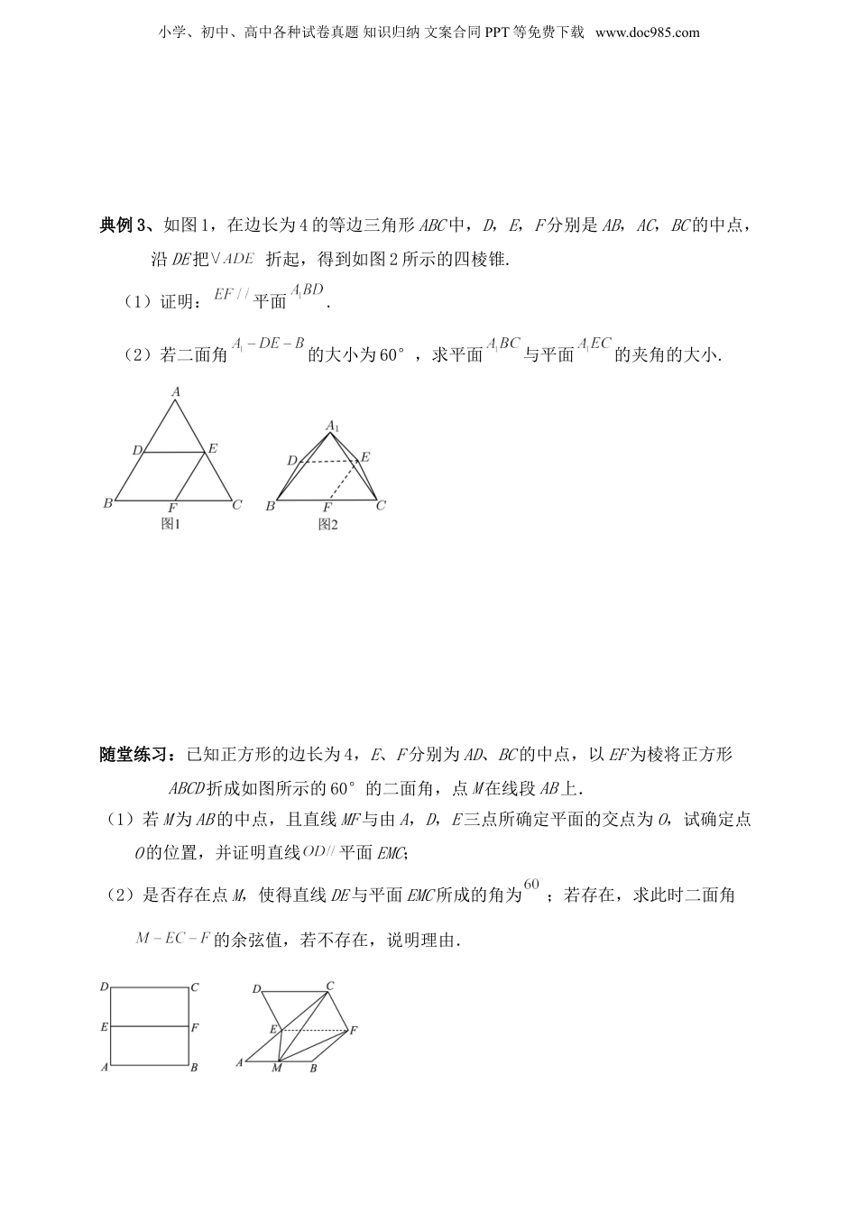 小学、初中、高中各种试卷真题知识归纳文案合同PPT等免费下载www.doc985.com空间向量和立体几何高考复习专题十二知识点一证明线面平行,面面角的向量求法典例1、在三棱锥中,,,,分别为,的中点,,,分别为,,的中点,平面,与平面所成的角为.(1)求证:平面;(2)求平面与平面的夹角的余弦值.随堂练习:在正方体中,E,F分别是,的中点.(1)求证:∥平面;(2)求平面与平面EDC所成的二面角的正弦值.小学、初中、高中各种试卷真题知识归纳文案合同PPT等免费下载www.doc985.com典例2、如图1,已知△ABC是边长为4的正三角形,D,E,F分别是AB,AC,BC边的中点,将△ADE沿DE折起,使点A到达如图2所示的点P的位置,M为DP边的中点.(1)证明:平面MEF.(2)若平面平面BCED,求平面MEF与平面PDE所成锐二面角的余弦值.随堂练习:如图,在四棱锥E-ABCD中,,,E在以AB为直径的半圆上(不包括端点),平面平面ABCD,M,N分别为DE,BC的中点.(1)求证:平面ABE;(2)当四棱锥E-ABCD体积最大时,求二面角N-AE-B的余弦值.小学、初中、高中各种试卷真题知识归纳文案合同PPT等免费下载www.doc985.com典例3、如图1,在边长为4的等边三角形ABC中,D,E,F分别是AB,AC,BC的中点,沿DE把折起,得到如图2所示的四棱锥.(1)证明:平面.(2)若二面角的大小为60°,求平面与平面的夹角的大小.随堂练习:已知正方形的边长为4,E、F分别为AD、BC的中点,以EF为棱将正方形ABCD折成如图所示的60°的二面角,点M在线段AB上.(1)若M为AB的中点,且直线MF与由A,D,E三点所确定平面的交点为O,试确定点O的位置,并证明直线平面EMC;(2)是否存在点M,使得直线DE与平面EMC所成的角为;若存在,求此时二面角的余弦值,若不存在,说明理由.小学、初中、高中各种试卷真题知识归纳文案合同PPT等免费下载www.doc985.com知识点二线面垂直证明线线垂直,面面垂直证线面垂直,面面角的向量求法典例4、已知矩形所在的平面与直角梯形所在的平面垂直,,且.(1)求证:;(2)求平面与平面夹角的余弦值.随堂练习:如图,在四棱锥P-ABCD中,平面PAB⊥平面ABCD,底面ABCD是平行四边形,AC=CD=2,,,PC=3.(1)证:AD⊥PC(2)求平面PAB与平面PCD的夹角的正弦值.小学、初中、高中各种试卷真题知识归纳文案合同PPT等免费下载www.doc985.com典例5、如图1是直角梯形ABCD,,,,,,以BE为折痕将折起,使点C到达的位置,且,如图(1)证明:(2)求二面角余弦值.随堂练习:如图,在直三棱柱,,.(1)证明:;(2)若三棱锥的体积为,求平面与平面夹角的余弦值.小学、初中、高中各种试卷真题知识归纳文案合同PPT等免费下载www.doc985.com典例6、四棱锥,底面为矩形,侧面底面,.(1)证明:;(2)设与平面所成的角为,求二面角的大小.随堂练习:如图,直三棱柱中,,E,F分别是AB,的中点.小学、初中、高中各种试卷真题知识归纳文案合同PPT等免费下载www.doc985.com(1)证明:EF⊥BC;(2)若,直线EF与平面ABC所成的角为,求平面与平面FEC夹角的余弦值.空间向量和立体几何高考复习专题十二答案典例1、答案:(1)证明见解析;(2).解:(1)连结. ,分别为,的中点,∴,即四边形是梯形, ,为分别为,的中点,∴,而平面,平面∴平面, 、为分别为、的中点,∴,而平面,小学、初中、高中各种试卷真题知识归纳文案合同PPT等免费下载www.doc985.com平面∴平面,又,平面,平面,∴平面平面,平面,∴平面;(2) ,为的中点,∴, 平面,故,,两两垂直.分别以,,所在直线为轴,轴,轴建立空间直角坐标系.不妨设,由得,, 与平面所成的角为,而平面,∴,∴,∴,,,易知为平面的法向量,,,设为平面的法向量,∴,令,则为平面的一个法向量,∴,∴平角与平面的夹角的小学、初中、高中各种试卷真题知识归纳文案合同PPT等免费下载www.doc985.com余弦值为.随堂练习:答案:(1)见解析;(2).解:(1)如图,连接,,连接, BC∥且BC=,∴四边形是平行四边形,∴∥且, E是中点,G是中点,∴∥CG且,∴四边形是平行四边形,∴∥CE, 平面,CE平面,∴CE∥平面;(2)如图建立空...