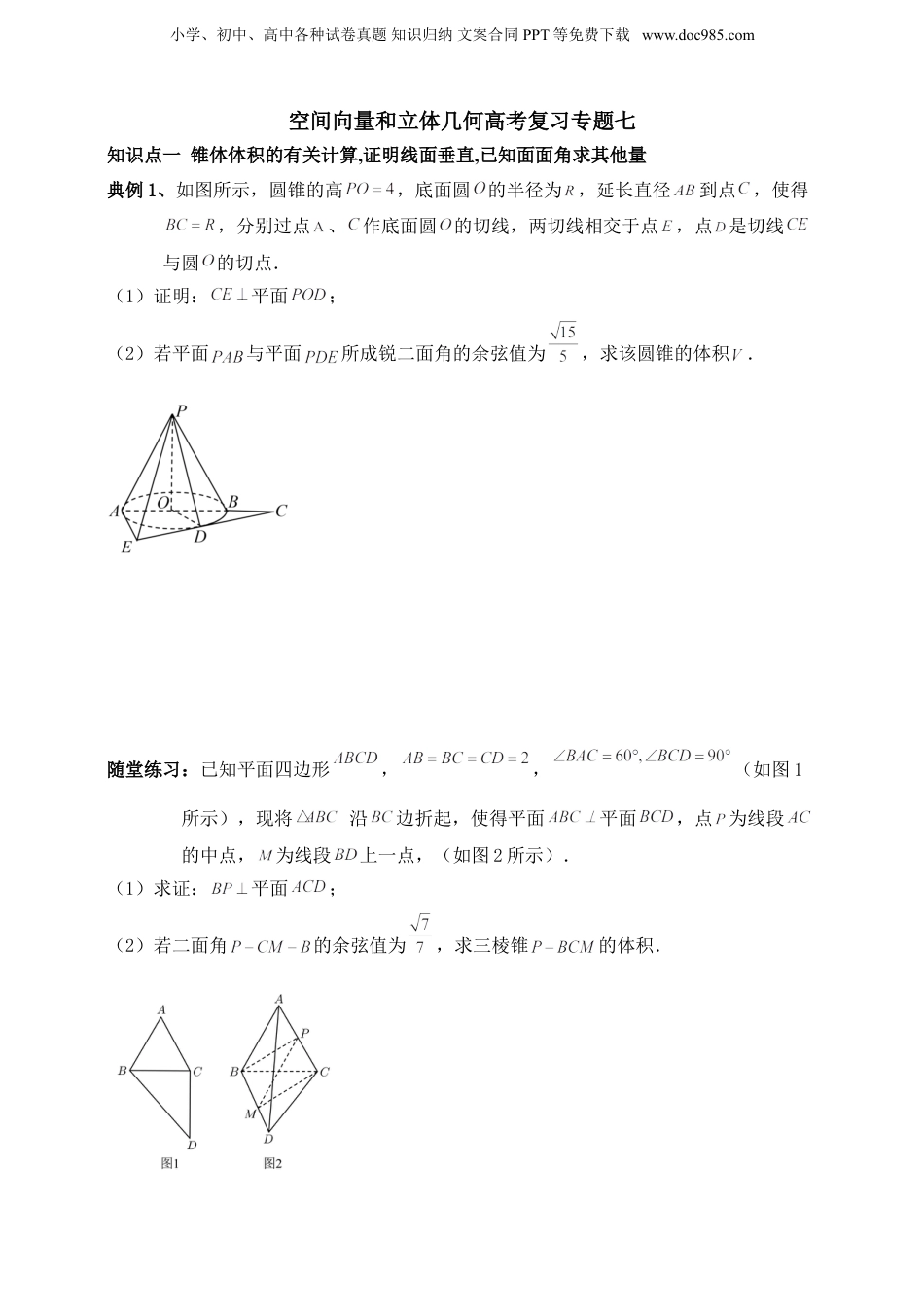 小学、初中、高中各种试卷真题知识归纳文案合同PPT等免费下载www.doc985.com空间向量和立体几何高考复习专题七知识点一锥体体积的有关计算,证明线面垂直,已知面面角求其他量典例1、如图所示,圆锥的高,底面圆的半径为,延长直径到点,使得,分别过点、作底面圆的切线,两切线相交于点,点是切线与圆的切点.(1)证明:平面;(2)若平面与平面所成锐二面角的余弦值为,求该圆锥的体积.随堂练习:已知平面四边形,,(如图1所示),现将沿边折起,使得平面平面,点为线段的中点,为线段上一点,(如图2所示).(1)求证:平面;(2)若二面角的余弦值为,求三棱锥的体积.小学、初中、高中各种试卷真题知识归纳文案合同PPT等免费下载www.doc985.com典例2、如图,在三棱柱中,平面,四边形为菱形.(1)证明:平面;(2)若,,二面角的余弦值为,求三棱锥的体积.随堂练习:如图所示,在三棱锥中,,为的中点.(1)证明:平面;(2)若点在棱上,且二面角为,求三棱锥的体积.小学、初中、高中各种试卷真题知识归纳文案合同PPT等免费下载www.doc985.com典例3、如图,在四棱锥中,平面,底面为矩形,,G为的重心,M为线段的中点,与交于点F.(1)当时,证明:平面;(2)当平面与平面所成锐二面角为时,求三棱锥的体积.随堂练习:如图,在四棱锥中,底面为矩形,侧面是正三角形,侧面底面,M是的中点.(1)证明:平面;(2)若,且二面角的大小为30°,求四棱锥的体积.小学、初中、高中各种试卷真题知识归纳文案合同PPT等免费下载www.doc985.com知识点二证明线面垂直,面面角的向量求法典例4、如图,在四棱锥中,底面是矩形且,M为的中点,,.(1)证明:平面;(2)若,与平面所成的角为45°,求二面角的正弦值.随堂练习:如图,四边形是正方形,平面,,,.(1)求证:平面;小学、初中、高中各种试卷真题知识归纳文案合同PPT等免费下载www.doc985.com(2)求平面与平面夹角的余弦值.典例5、已知四棱锥中,底面,平面平面,,.(1)求证:平面;(2)若,求二面角的余弦值.小学、初中、高中各种试卷真题知识归纳文案合同PPT等免费下载www.doc985.com随堂练习:如图,在四棱锥中,底面为正方形,侧面为等边三角形且垂直于底面,分别为的中点.(1)证明:平面;(2)求二面角的正弦值.典例6、如图,已知等边中,E,F分别为AB,AC边的中点,N为BC边上一点,且,将沿EF折到的位置,使平面平面,M为EF中点.(1)求证:平面平面;(2)求二面角的余弦值.小学、初中、高中各种试卷真题知识归纳文案合同PPT等免费下载www.doc985.com随堂练习:如图,等腰梯形中,,,现以为折痕把折起,使点到达点的位置,且.1、证明:平面;2、若为上一点,且三棱锥的体积是三棱锥体积的2倍,求平面与平面夹角的余弦值.【正确答案】1、证明见解析2、空间向量和立体几何高考复习专题七答案典例1、答案:(1)证明见解析;(2).解:(1)由题设,底面圆,又是切线与圆的切点,∴底面圆,则,且,而,∴平面.(2)由题设,若,可构建为原点,、、为x、y、z轴的空间直角坐标系,又,可得,小学、初中、高中各种试卷真题知识归纳文案合同PPT等免费下载www.doc985.com∴,,,有,,若是面的一个法向量,则,令,则,又面的一个法向量为,∴,可得,∴该圆锥的体积.随堂练习:答案:(1)证明见解析(2)解:(1)证明:因为,所以为等边三角形,因为为的中点,所以.因为平面平面,平面平面平面,所以平面,又平面,所以,又因为平面,所以平面.(2)如图所示以为坐标原点,分别以为轴的正方向建立空间直角坐标系,小学、初中、高中各种试卷真题知识归纳文案合同PPT等免费下载www.doc985.com则,,,,.所以,,设,则,设平面的一个法向量为,则,即,取,有,即.平面的一个法向量.设二面角的平面角为,则,解得,即为中点.此时,又因为,所以.典例2、答案:(1)证明见解析;(2).小学、初中、高中各种试卷真题知识归纳文案合同PPT等免费下载www.doc985.com解:(1)因为四边形为菱形,所以.因为平面,平面,所以.又因为,平面,平面,所以平面.(2)以B为坐标原点,分别以,BC所在的...