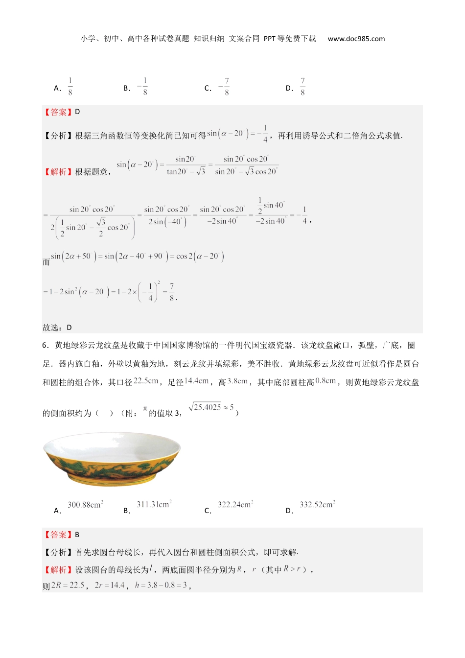 小学、初中、高中各种试卷真题知识归纳文案合同PPT等免费下载www.doc985.com2025年高考一轮复习第二次月考卷02(满分150分,考试用时120分钟)测试范围:集合+不等式+函数+三角函数+复数+数列+立体几何一、选择题1.已知集合,,则()A.B.C.D.【答案】B【分析】先解不等式求出两个集合,再求出,然后求即可.【解析】由,得,解得,所以,由,得或,所以,所以,所以.故选:B2.已知复数,则()A.B.C.D.【答案】A【分析】根据共轭复数和除法法则进行计算,得到答案.【解析】因为,所以,所以.小学、初中、高中各种试卷真题知识归纳文案合同PPT等免费下载www.doc985.com故选:A.3.已知向量,则()A.B.2C.D.3【答案】D【分析】对两边平方化简可得,再对平方化简后再开方即可.【解析】由两边平方得,,所以,所以,所以,故选:D.4.已知,,且,则的最小值为()A.4B.C.6D.【答案】D【分析】利用乘“1”法及基本不等式计算可得.【解析】因为,,且,所以,当且仅当,即,时取等号.故选:D5.若,则()小学、初中、高中各种试卷真题知识归纳文案合同PPT等免费下载www.doc985.comA.B.C.D.【答案】D【分析】根据三角函数恒等变换化简已知可得,再利用诱导公式和二倍角公式求值.【解析】根据题意,,而.故选:D6.黄地绿彩云龙纹盘是收藏于中国国家博物馆的一件明代国宝级瓷器.该龙纹盘敞口,弧壁,广底,圈足.器内施白釉,外壁以黄釉为地,刻云龙纹并填绿彩,美不胜收.黄地绿彩云龙纹盘可近似看作是圆台和圆柱的组合体,其口径,足径,高,其中底部圆柱高,则黄地绿彩云龙纹盘的侧面积约为()(附:的值取3,)A.B.C.D.【答案】B【分析】首先求圆台母线长,再代入圆台和圆柱侧面积公式,即可求解.【解析】设该圆台的母线长为,两底面圆半径分别为,(其中),则,,,小学、初中、高中各种试卷真题知识归纳文案合同PPT等免费下载www.doc985.com所以,故圆台部分的侧面积为,圆柱部分的侧面积为,故该黄地绿彩云龙纹盘的侧面积约为.故选:B.7.已知数列的前n项和为,若,,且,都有,则()A.是等比数列B.C.D.【答案】B【分析】求出数列的前几项,对四个选项进行验证排除即可.【解析】因为,,所以,由,即,由,即,由,即,由,即,由.小学、初中、高中各种试卷真题知识归纳文案合同PPT等免费下载www.doc985.com因为,所以不是等比数列,故A错误;因为,故B正确;因为,故C错误;因为,故D错误.故选:B8.已知函数(不恒为零),其中为的导函数,对于任意的,满足,且,则()A.B.是偶函数C.关于点对称D.【答案】D【分析】借助赋值法令,即可得A;结合赋值法与函数奇偶性的定义计算可得B;结合复合函数导数公式与对称性可得C;借助赋值法,可逐项计算出到,即可得解.【解析】对A:令,有,故,故A错误;对B:令,有,又不恒为零,故,即,又,故是奇函数,故B错误;对C:令,;小学、初中、高中各种试卷真题知识归纳文案合同PPT等免费下载www.doc985.com令,当时,有,;当,有,,当,结合,有,,,综上,,,关于直线对称,所以关于直线对称,故C错误;对D:由,故,令,有,即,则,即,,即,,即,令,有,即,则,,,故,故D正确.故选:D.【点睛】关键点点睛:D选项中,关键点在于令可得,结合,可得小学、初中、高中各种试卷真题知识归纳文案合同PPT等免费下载www.doc985.com为偶数时,.二、多选题9.已知函数,若,则下列不等式一定成立的有()A.B.C.D.【答案】BD【分析】确定函数是增函数,然后比较自变量的大小后可得正确选项.【解析】易知是上的增函数,时,成立,成立,BD一定成立;与的大小关系不确定,A不一定成立;同样与的大小关系也不确定,如时,,C也不一定成立.故选:BD.10.已知函数则()A.函数的图象关于点对称B.将函数的图象向左平移个单位长度后所得到的图象关于轴对称C.函数在区间上有2个零点D.函数在区间上单调递增【答案】ACD小学、初中、高中各种试卷真题知识归纳文案合同PPT等免费下载www.doc985.com【分析】利用三角恒等变换易得,采用代入检验法即可判断A项,利用平移变换,求得函数解析式...