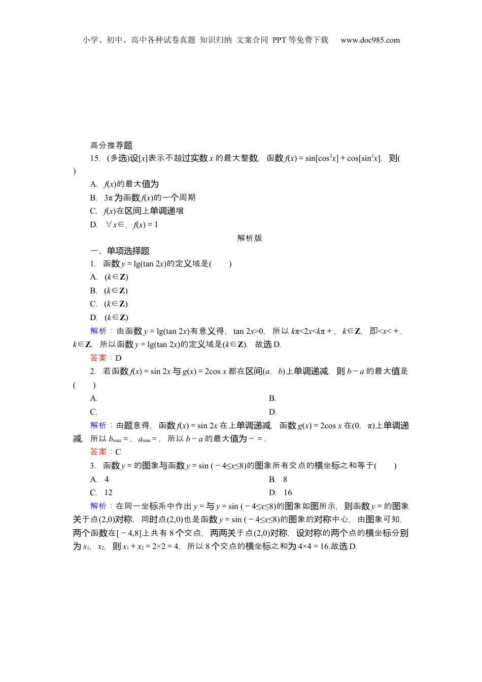 小学、初中、高中各种试卷真题知识归纳文案合同PPT等免费下载www.doc985.com限跟踪时检测(二十六)三角函的象性数图与质一、单项选择题1.函数y=lg(tan2x)的定域是义()A.(k∈Z)B.(k∈Z)C.(k∈Z)D.(k∈Z)2.若函数f(x)=sin2x与g(x)=2cosx都在区间(a,b)上,单调递减则b-a的最大是值()A.B.C.D.3.函数y=的象函图与数y=sin(-4≤x≤8)的象所有交点的坐之和等于图横标()A.4B.8C.12D.164.(2024·河北衡水中学调研)若函数f(x)=|tan(ωx-ω)|(ω>0)的最小正周期为4,在下则列中区间f(x)增的是单调递()A.B.C.D.(3,4)5.(2024·州五校考贵贵阳联)下列可能是函数y=4coscos象的中心的是图对称()A.B.C.D.6.已知函数f(x)=2cos,设a=f,b=f,c=f,则a,b,c的大小系是关()A.a>b>cB.a>c>bC.c>a>bD.b>a>c7.函数f(x)=在[-π,π]上的象大致图为()8.函设数f(x)=cos,则f(x)在上的是单调递减区间()A.B.C.D.9.(2024·安徽皖江名校高三考联)已知函数f(x)=sin(2x+φ)+cos(2x+φ)偶函,且为数在上增,单调递则φ的一可能取个值为()A.B.小学、初中、高中各种试卷真题知识归纳文案合同PPT等免费下载www.doc985.comC.D.二、多项选择题10.(2024·广汕模东头拟)于函对数f(x)=|sinx|+cos2x,下列正确的是结论()A.f(x)的域值为B.f(x)在上增单调递C.f(x)的象于直图关线x=对称D.f(x)的最小正周期为π11.已知函数f(x)=cos2-cos2x,则()A.f(x)的最大值为B.f(x)的象于点图关对称C.f(x)象的方程图对称轴为x=+(k∈Z)D.f(x)在[0,2π]上有4零点个三、空解答填题与题12.(2024·福建模拟)已知三角函数f(x)足:满①f(3-x)=-f(x);②f(x)=f(1-x);③函数f(x)在上.出一同具有上述性单调递减写个时质①②③的函数f(x)=_____________________________________________.13.(2024·名原师创)已知函数f(x)=-cos2x-sin2x,将f(x)的象上所有点沿图x平轴移θ(θ>0)位度,得到函个单长数g(x)的象,且函图数g(x)偶函,为数当θ最小,函时数h(x)=2cos(πx-θ)的象的中心的坐图对称标为______________.14.(2024·浙江杭州模拟)已知函数f(x)=sin+cos-2sin2.(1)求函数f(x)的增;单调递区间(2)求使f(x)<0成立的实数x的取集合.值小学、初中、高中各种试卷真题知识归纳文案合同PPT等免费下载www.doc985.com高分推荐题15.(多选)设[x]表示不超过实数x的最大整,函数数f(x)=sin[cos2x]+cos[sin2x],则()A.f(x)的最大值为B.3π函为数f(x)的一周期个C.f(x)在上增区间单调递D.∀x∈,f(x)=1解析版一、单项选择题1.函数y=lg(tan2x)的定域是义()A.(k∈Z)B.(k∈Z)C.(k∈Z)D.(k∈Z)解析:由函数y=lg(tan2x)有意得,义tan2x>0,所以kπ<2x<kπ+,k∈Z,即<x<+,k∈Z,所以函数y=lg(tan2x)的定域是义(k∈Z).故选D.答案:D2.若函数f(x)=sin2x与g(x)=2cosx都在区间(a,b)上,单调递减则b-a的最大是值()A.B.C.D.解析:由意得,函题数f(x)=sin2x在上,函单调递减数g(x)=2cosx在(0,π)上单调递,所以减bmax=,amin=,所以b-a的最大-=值为.答案:C3.函数y=的象函图与数y=sin(-4≤x≤8)的象所有交点的坐之和等于图横标()A.4B.8C.12D.16解析:在同一坐系中作出标y=与y=sin(-4≤x≤8)的象如所示,函图图则数y=的象图于点关(2,0),同点对称时(2,0)也是函数y=sin(-4≤x≤8)的象的中心,由象可知,图对称图函在两个数[-4,8]上共有8交点,于点个两两关(2,0),的点的坐分对称设对称两个横标别为x1,x2,则x1+x2=2×2=4,所以8交点的坐之和个横标为4×4=16.故选D.小学、初中、高中各种试卷真题知识归纳文案合同PPT等免费下载www.doc985.com答案:D4.(2024·河北衡水中学调研)若函数f(x)=|tan(ωx-ω)|(ω>0)的最小正周期为4,在下则列中区间f(x)增的是单调递()A.B.C.D.(3,4)解析:作出函数y=|tanu|的象如所示.图图由可知,函图数y=|tanu|的最小正周期为π,且其增单调递区间为(k∈Z).于函对数f(x),其最小正周期T==4,可得ω=,则f(x)=.由kπ<x-<kπ+(k∈Z),解得4k+1<x<4k+3,其中k∈Z,所以f(x...