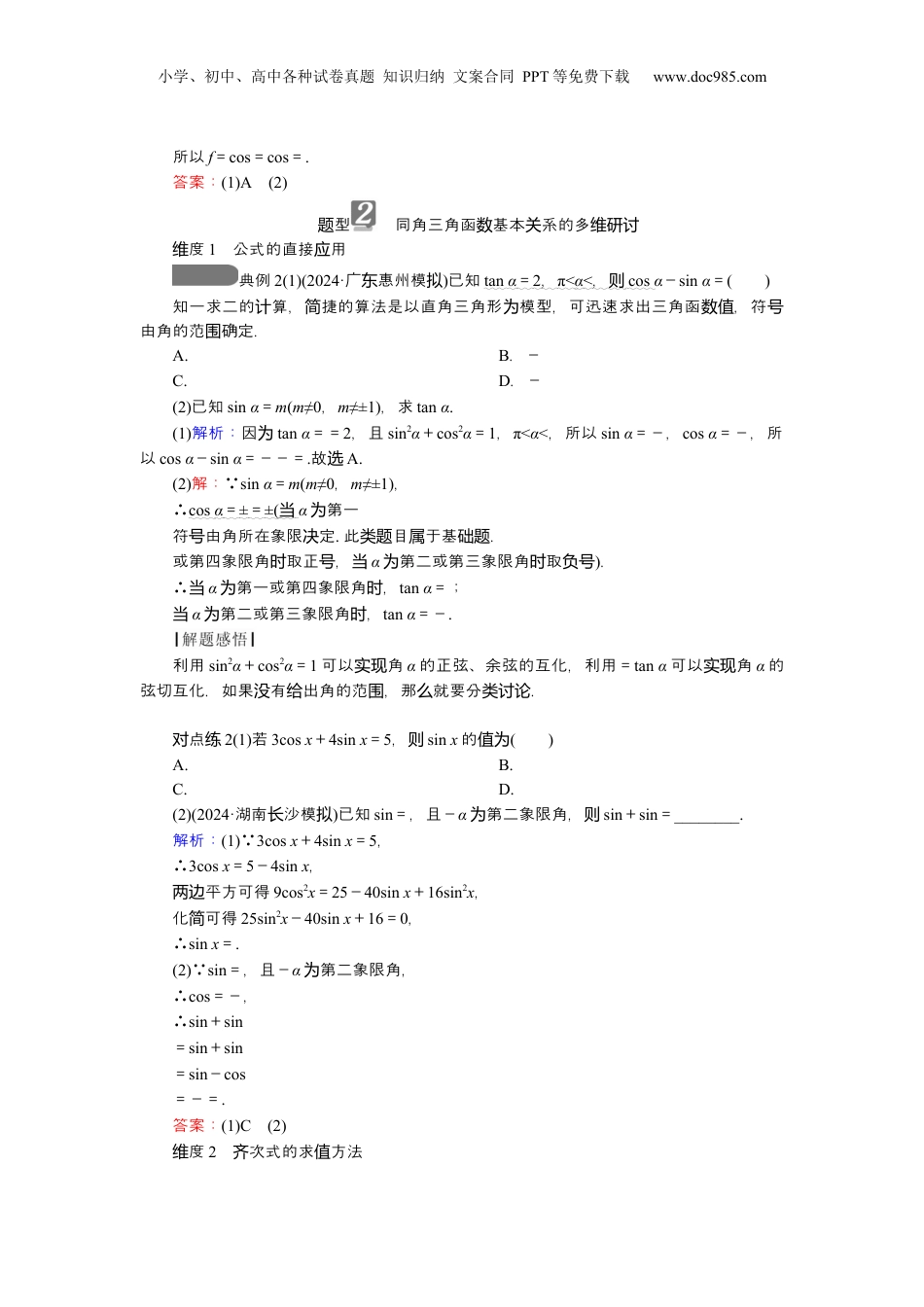 小学、初中、高中各种试卷真题知识归纳文案合同PPT等免费下载www.doc985.com第2同角三角函基本系式及公式讲数关诱导要点复习1.理解同角三角函的基本系式:数关sin2α+cos2α=1,=tanα.2.借助位单圆的性,利用定推出公式对称义导诱导.一同角三角函的基本系式数关1.平方系:关sin2α+cos2α=1.2.商系:数关tanα=.二六公式组诱导角函数2kπ+α(k∈Z)π+α-απ-α-α+α正弦sin_α-sin_α-sin_αsin_αcos_αcos_α余弦cos_α-cos_αcos_α-cos_αsin_α-sin_α正切tan_αtan_α-tan_α-tan_α——公式可“奇偶不,符看象限”.“奇”“偶”指的是“诱导简记为变变号k·+α(k∈Z)”中的k是奇是偶.“”“不”是指函名的化.若数还数变与变数称变k是奇,正、余弦互;若数则变k偶,函名不.“符看象限”指的是在“为数则数称变号k·+α(k∈Z)”中,将α看成角,“锐时k·+α(k∈Z)”的所在的象限.终边常/用/结/论1.sin2α=1-cos2α=(1+cosα)(1-cosα);cos2α=1-sin2α=(1+sinα)(1-sinα);(sinα±cosα)2=1±2sinαcosα.2.sinα=tanαcosα.在已知tanα,cosα后,用此法求sinα.1.判下列是否正确.断结论(1)若α,β角,为锐则sin2α+cos2β=1.()(2)若α∈R,则tanα=恒成立.()(3)sin(π+α)=-sinα成立的件是条α角.为锐()(4)若sin=,则cosα=-.(√)2.sin210°cos120°的值为()A.B.-C.-D.解析:sin210°cos120°=(-sin30°)·(-cos60°)=×=.答案:A3.(多选)若角A,B,C是△ABC的三角,下列等式中一定成立的是个内则()A.cos(A+B)=cosCB.sin(A+B)=-sinCC.cos=sin小学、初中、高中各种试卷真题知识归纳文案合同PPT等免费下载www.doc985.comD.sin=cos解析:因为A+B+C=π,所以A+B=π-C,=,=,所以cos(A+B)=cos(π-C)=-cosC,sin(A+B)=sin(π-C)=sinC,cos=cos=sin,sin=sin=cos.答案:CD4.化的果是简结()A.-1B.1C.tanαD.-tanα解析:原式===tanα.答案:C型题公式及用诱导应典例1(1)下列三角函的中数值(k∈Z),与sin的相同的是值个数()和相同的角的正弦;或者或-相同的角的余弦.与终边值与终边值①sin;②cos;③sin;④cos;⑤sin.A.1B.2C.3D.4(2)化简:=________.于对kπ±α的公式,口溜“函名不,符看象限”;于诱导顺为数变号对±α和±α的公诱导式,口溜“函名改,符看象限”.顺为数变号解析:(1)于对①,sin=sin,当k奇,为数时sin=sin;当k偶,为数时sin=-sin,不足意;于满题对②,cos=cos=sin,足意;于满题对③,sin=sin,足意;于满题对④,cos=cos=-cos=-sin,不足意;于满题对⑤,sin=sin=sin,足意.故满题选C.(2)原式====-=-·=-1.故答案-为1.1.公式的用方向原诱导两个应与则(1)求.化角的原方向:化正,大化小,化到角了.值则与负锐为终(2)化.化的原方向:一角,一名,同角名少了.简简则与统统为终2.含2π整倍的公式的用数诱导应由相同的角的系可知,在算含有终边关计2π的整倍的三角函式中可直接数数将2π的整倍去掉后再行算,如数进运cos(5π-α)=cos(π-α)=-cosα.点对练1(1)(2024·福建三明模拟)已知cos=-,则sin-2cos=()A.-B.C.-D.(2)已知f(α)=,则f=________.解析:(1)因为sin=sin=-sin=-cos=,cos=-cos=-cos=,所以sin-2cos=-2×=-,故选A.(2)因为f(α)===cosα,小学、初中、高中各种试卷真题知识归纳文案合同PPT等免费下载www.doc985.com所以f=cos=cos=.答案:(1)A(2)型题同角三角函基本系的多数关维研讨度维1公式的直接用应典例2(1)(2024·广惠州模东拟)已知tanα=2,π<α<,则cosα-sinα=()知一求二的算,捷的算法是以直角三角形模型,可迅速求出三角函,符计简为数值号由角的范确定.围A.B.-C.D.-(2)已知sinα=m(m≠0,m≠±1),求tanα.(1)解析:因为tanα==2,且sin2α+cos2α=1,π<α<,所以sinα=-,cosα=-,所以cosα-sinα=--=.故选A.(2)解: sinα=m(m≠0,m≠±1),∴cosα=±=±(当α第一为符由角所在象限...
