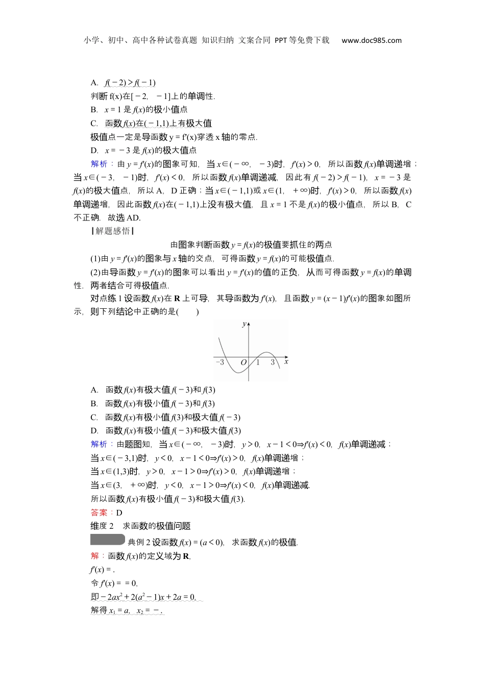 小学、初中、高中各种试卷真题知识归纳文案合同PPT等免费下载www.doc985.com第3函的最讲导数与数极值与值要点复习1.借助函的象,了解函在某点取得的必要件和充分件数图数极值条条.2.能利用求某些函的大、小以及定上不超三次的多式函的最大导数数极值极值给闭区间过项数、最小值值.3.体性、、最大会导数与单调极值(小)的系.值关一函的数极值1.函的小小点数极值与极值若函数f(x)在点x=a的函处数值f(a)比在点它x=a附近其他点的函数值都小,且f′(a)=0,而且在x=a附近的左侧f′(x)<0,右侧f′(x)>0,点则a叫做函的小点,数极值f(a)叫做函的小.数极值2.函的大大点数极值与极值若函数f(x)在点x=b的函处数值f(b)比在点它x=b附近其他点的函数值都大,且f′(b)=0,而且在x=b附近的左侧f′(x)>0,右侧f′(x)<0,点则b叫做函的大点,数极值f(b)叫做函的大.数极值3.函的点数极值与极值小点和大点点,大和小.极值极值统称为极值极值极值统称为极值二函的最大数(小)值1.函数f(x)在[a,b]上有最的件值条如果在区间[a,b]上函数y=f(x)的象是一图条不连续断的曲,那必有最大和线么它值最小.值2.求函数y=f(x)在区间[a,b]上的最大(小)的步值骤(1)求函数y=f(x)在区间(a,b)的内.极值(2)函将数y=f(x)的各极值与端点的函处数值f(a),f(b)比,其中较最大的一是最大个值,最小的一是最小.个值常/用/结/论1.于可函对导数f(x),f′(x0)=0是函数f(x)在x=x0有的必要不充分件处极值条.若x0是f(x)的点,必有极值则f′(x0)=0,反,若过来f′(x0)=0,但x0不一定是点极值.通俗:只有讲y=f′(x)穿透x的零点,才是轴f(x)的点.极值2.若函数f(x)的象不,图连续断则f(x)在[a,b]上一定有最.值3.若函数f(x)在[a,b]上是函,单调数则f(x)一定在端点取得最.区间处值4.若函数f(x)在区间(a,b)只有一点,相的点一定是函的最点内个极值则应极值数值.1.判下列是否正确.断结论(1)函数f(x)在区间(a,b)上不存在最.值()(2)函的小一定是函的最小.数极值数值()(3)函的小一定不是函的最大.数极值数值(√)(4)三次函数f(x)=x3+ax2+bx+c最多有点.两个极值(√)2.(本改课习题编)函数f(x)=(x2-1)2+2的点是极值()小学、初中、高中各种试卷真题知识归纳文案合同PPT等免费下载www.doc985.comA.1B.-1C.1,-1,0D.0解析: f(x)=x4-2x2+3,由f′(x)=4x3-4x=4x(x+1)(x-1)=0,得x=0或x=1或x=-1.又当x<-1,时f′(x)<0,-当1<x<0,时f′(x)>0,当0<x<1,时f′(x)<0,当x>1,时f′(x)>0,∴x=0,1,-1都是f(x)的点.故极值选C.答案:C3.(2024·甘州模肃兰拟)函数y=f(x)的函导数y=f′(x)的象如所示,以下命图图则题错的是误()A.-3是函数y=f(x)的点极值B.-1是函数y=f(x)的最小点值C.y=f(x)在区间(-3,1)上增单调递D.y=f(x)在x=0切的斜率大于零处线解析:根据函象可知导数图当x∈(-∞,-3),时f′(x)<0,当x∈(-3,1),时f′(x)≥0,所以函数y=f(x)在(-∞,-3)上,在单调递减(-3,1)上增,故单调递C正确;易知-3是函数y=f(x)的小点,故极值A正确;因为y=f(x)在(-3,1)上增,所以-单调递1不是函数y=f(x)的最小点,故值B;因函错误为数y=f(x)在x=0的大于处导数0,所以切的斜率线大于零,故D正确.故选B.答案:B4.若函数f(x)=x3-4x+m在[0,3]上的最大值为4,则m=________.解析:f′(x)=x2-4,x∈[0,3],当x∈[0,2),时f′(x)<0,当x∈(2,3],时f′(x)>0,所以f(x)在[0,2)上是函,在减数(2,3]上是增函,又数f(0)=m,f(3)=-3+m,所以在[0,3]上,f(x)max=f(0)=4,所以m=4.答案:4型题函的多数极值问题维研讨度维1根据函象判数图断极值典例1(多选)(2024·宁州模辽锦拟)函数f(x)的定域义为R,的函它导数y=f′(x)的部分象如所示,下列正确的是图图则结论()小学、初中、高中各种试卷真题知识归纳文案合同PPT等免费下载www.doc985.comA.f(-2)>f(-1)判断f(x)在[-2,-1]上的性.单调B.x=1是f(x)的小点极值C.函数f(x)在(-1,1)上有大极值点一定是函极值导数y=f′(x)穿透x的零点.轴D.x=-3是f(x)的大点极值解析:由...