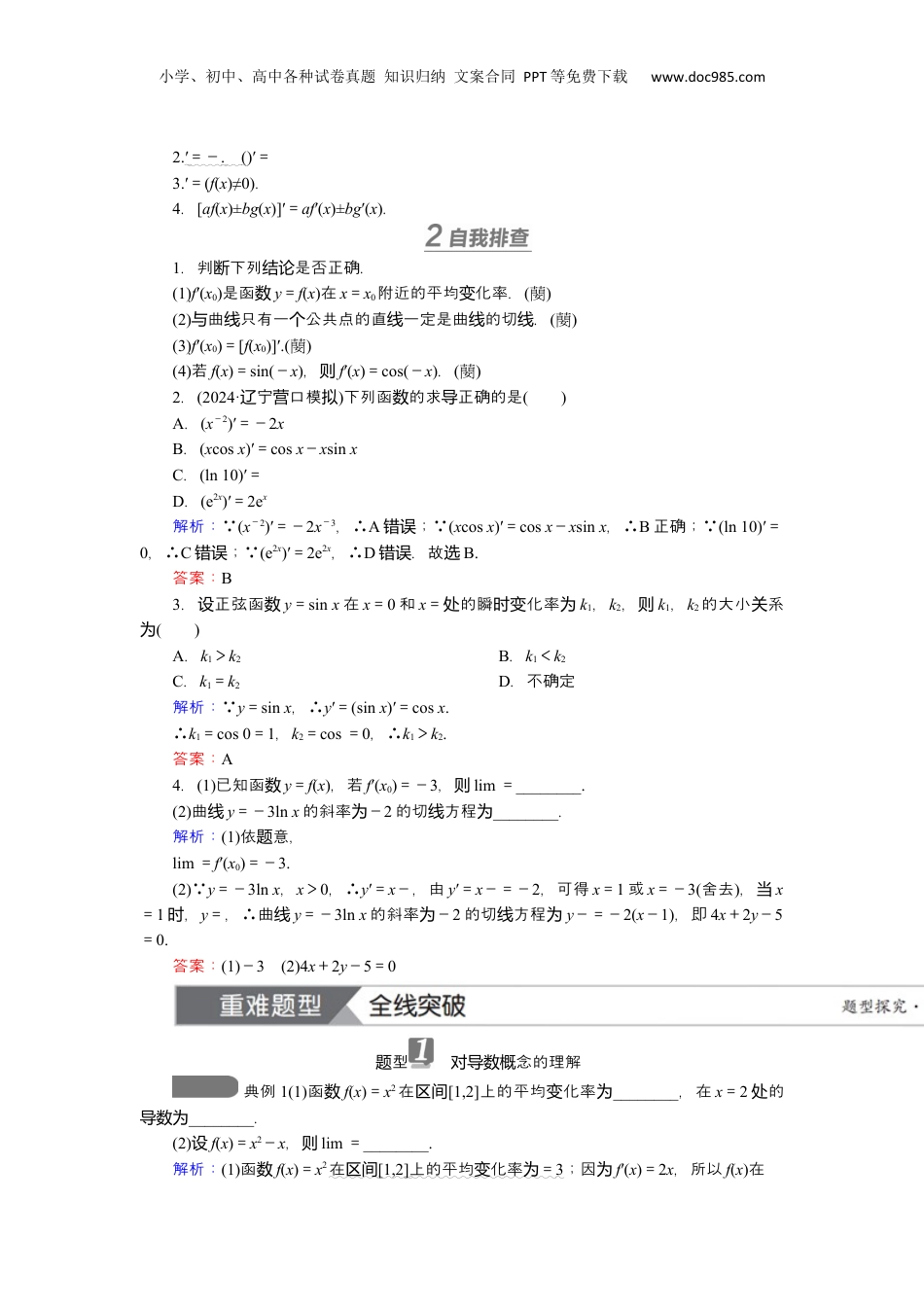小学、初中、高中各种试卷真题知识归纳文案合同PPT等免费下载www.doc985.com第1的念算讲导数概与运要点复习1.了解平均化率、瞬化率,了解念的背景变时变导数概实际.2.通函过数图象直理解的几何意观导数义.3.能根据定,求函导数义数y=c,y=x,y=x2,y=x3,y=,y=的导数.4.能利用基本初等函的公式和的四算法求函的数导数导数则运则简单数导数.5.能求的合函简单复数(形如f(ax+b))的.导数一的念导数概1.平均化率:于函变对数y=f(x),我把比=叫做函们值数y=f(x)从x0到x0+Δx的平均化率.变2.函数y=f(x)在x=x0的:处导数函称数y=f(x)在x=x0的瞬化率处时变lim=lim函为数y=f(x)在x=x0的,作处导数记f′(x0)或y′|x=x0,即f′(x0)=lim=lim.3.几何意义函数f(x)在x=x0的处导数f′(x0)的几何意是:在曲义线y=f(x)上点(x0,f(x0))的处切的线斜率.相地,切方程应线为y-f(x0)=f′(x0)(x-x0).二基本初等函的公式数导数原函数函导数f(x)=c(c常为数)f′(x)=0f(x)=xα(α∈Q,且α≠0)f′(x)=αxα-1f(x)=sinxf′(x)=cos_xf(x)=cosxf′(x)=-sin_xf(x)=ax(a>0,且a≠1)f′(x)=axln_af(x)=exf′(x)=exf(x)=logax(a>0,且a≠1,x>0)f′(x)=f(x)=lnx(x>0)f′(x)=三的算法导数运则若y=f(x),y=g(x)的存在,导数则(1)[f(x)±g(x)]′=f′(x)±g′(x);(2)[f(x)·g(x)]′=f′(x)g(x)+f(x)g′(x);(3)′=(g(x)≠0).四合函的复数导数函设数u=φ(x)在点x有处导数u′=φ′(x),函数y=f(u)在点x的点对应u有处导数y′=f′(u),合函则复数y=f(φ(x))在点x也有处导数y′x=y′u·u′x,即y对x的等于导数y对u的导数与u对x的的乘.导数积常/用/结/论1.奇函的是偶函,偶函的是奇函,周期函的是周期函.数导数数数导数数数导数还数小学、初中、高中各种试卷真题知识归纳文案合同PPT等免费下载www.doc985.com2.′=-.()′=3.′=(f(x)≠0).4.[af(x)±bg(x)]′=af′(x)±bg′(x).1.判下列是否正确.断结论(1)f′(x0)是函数y=f(x)在x=x0附近的平均化率.变()(2)曲只有一公共点的直一定是曲的切.与线个线线线()(3)f′(x0)=[f(x0)]′.()(4)若f(x)=sin(-x),则f′(x)=cos(-x).()2.(2024·宁口模辽营拟)下列函的求正确的是数导()A.(x-2)′=-2xB.(xcosx)′=cosx-xsinxC.(ln10)′=D.(e2x)′=2ex解析: (x-2)′=-2x-3,∴A;错误 (xcosx)′=cosx-xsinx,∴B正确; (ln10)′=0,∴C;错误 (e2x)′=2e2x,∴D.故错误选B.答案:B3.正弦函设数y=sinx在x=0和x=的瞬化率处时变为k1,k2,则k1,k2的大小系关为()A.k1>k2B.k1<k2C.k1=k2D.不确定解析: y=sinx,∴y′=(sinx)′=cosx.∴k1=cos0=1,k2=cos=0,∴k1>k2.答案:A4.(1)已知函数y=f(x),若f′(x0)=-3,则lim=________.(2)曲线y=-3lnx的斜率-为2的切方程线为________.解析:(1)依意,题lim=f′(x0)=-3.(2) y=-3lnx,x>0,∴y′=x-,由y′=x-=-2,可得x=1或x=-3(舍去),当x=1,时y=,∴曲线y=-3lnx的斜率-为2的切方程线为y-=-2(x-1),即4x+2y-5=0.答案:(1)-3(2)4x+2y-5=0型题念的理解对导数概典例1(1)函数f(x)=x2在区间[1,2]上的平均化率变为________,在x=2的处导数为________.(2)设f(x)=x2-x,则lim=________.解析:(1)函数f(x)=x2在区间[1,2]上的平均化率=变为3;因为f′(x)=2x,所以f(x)在小学、初中、高中各种试卷真题知识归纳文案合同PPT等免费下载www.doc985.com强念,平均化率=调概变.x=2的处导数为2×2=4.故答案为34.(2) f(x)=x2-x,∴f′(x)=2x-1.lim=-lim=-f′(2)=-(2×2-1)=-3.故答案-为3.定的探究导数义(1)判一函在某点是否可就是判断个数导断当Δx→0函的平均化率的限是否时该数变极存在.很,,基本初等函在定域每点都可这样讲笼统应这样说数义内个处导.(2)利用定求函的,先算函的化量导数义数导数时数值变Δy,再算比=,再里有值这两量,个Δx和x,在求限程中,极过x理解常量,此暂时为时Δx量,在限果中,为变极结Δx消失,此时x可以看作量了.变求限...
