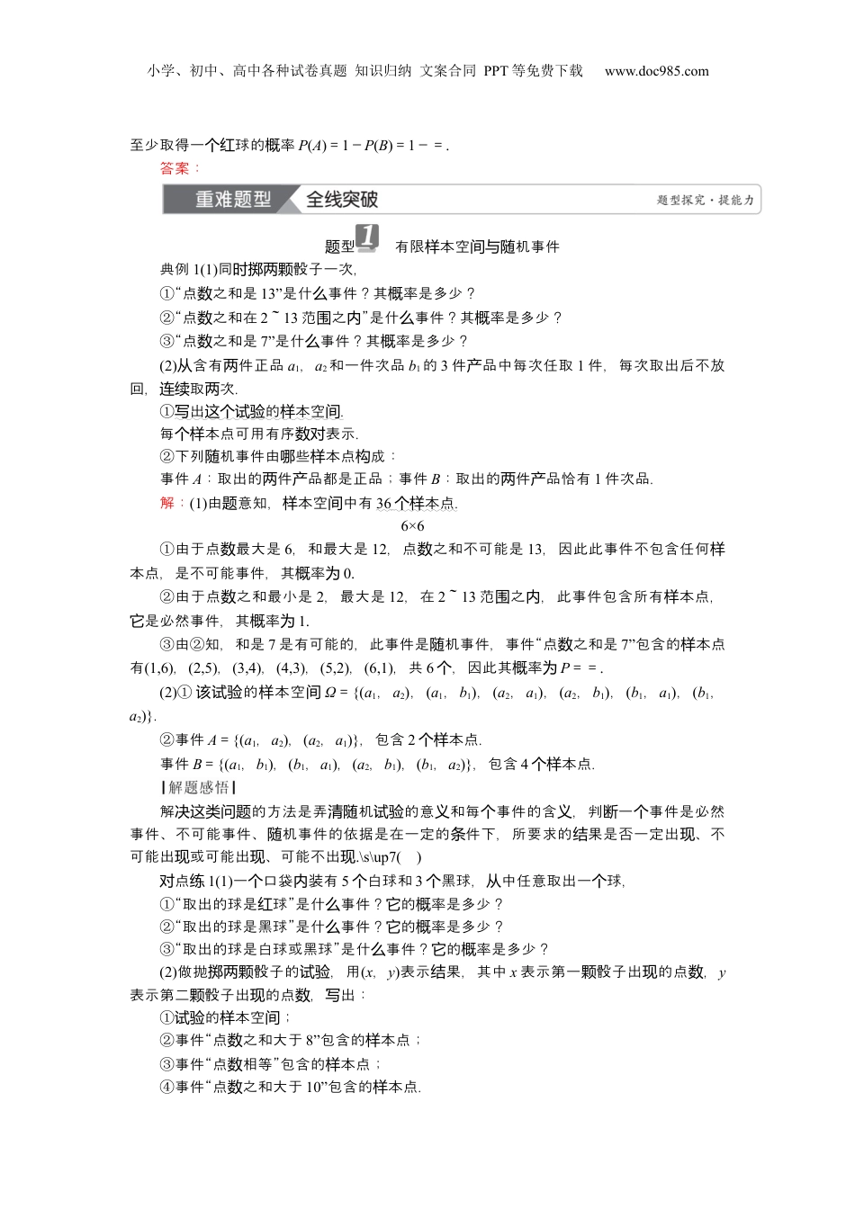 小学、初中、高中各种试卷真题知识归纳文案合同PPT等免费下载www.doc985.com第6机事件的率讲随概要点复习1.了解机事件生的不确定性和率的定性,了解率的意,了解随发频稳概义率率的频与概区别.2.了解互斥事件的率加法公式.两个概一本空和机事件样间随1.本点和有限本空样样间(1)本点:机样随试验E的每可能的个基本果结本点,常用称为样ω表示.全体本点的集合样称为试验E的本空,常用样间Ω表示.(2)有限本空:如果一机有样间个随试验n可能果个结ω1,ω2,…,ωn,本空则称样间Ω={ω1,ω2,…,ωn}有限本空.为样间2.机事件随(1)定:本空义将样间Ω的子集机事件,事件.称为随简称(2)表示:大字母写A,B,C,….(3)机事件的端事件:必然事件、不可能事件.随极二事件的系算关与运名称定义符表示号包含系关若事件A生发,事件则B一定生发,事件这时称B包含事件A(或事件称A包含于事件B)B⊇A(或A⊆B)相等系关若B⊇A,且A⊇B,事件则称A事与件B相等A=B事件并(和事件)若某事件生发且事件当仅当A生或发事件B生发,此事件事件则称为A与事件B的事件并(或和事件)A∪B(或A+B)交事件(事件积)若某事件生且发当仅当事件A生且发事件B生发,此事件事件则称为A与事件B的交事件(或事件积)A∩B(或AB)互斥事件若A∩B为不可能事件,事件则A与事件B互斥A∩B=∅立对事件若A∩B为不可能事件,A∪B为必然事件,事件则称A事件与B互立为对事件A∩B=∅且A∪B=Ω三率率频与概1.率的定性频稳一般地,着次随试验数n的增大,率偏离率的幅度小,即事件频概会缩A生的率发频fn(A)逐会渐定于稳事件A生的率发概P(A),我率的性率的定性.们称频这个质为频稳2.率定性的作用:可以用率频稳频fn(A)估率计概P(A).常/用/结/论小学、初中、高中各种试卷真题知识归纳文案合同PPT等免费下载www.doc985.com1.方便一理,必然事件和不可能事件作机事件的端情形.为统处将为随两个极2.机事件当随A,B互斥,不一定立;机事件时对当随A,B立,一定互斥.即对时事件互斥是立的必要不充分件.两对条3.机事件随A生的率是机的,而率是客存在的确定的常,但在大量机发频随概观数随中,事件试验A生的率逐定于事件发频渐稳A生的率.发概1.判下列是否正确.断结论(1)必然事件一定生.发(√)(2)在大量的重中,率是率的定.复试验概频稳值(√)(3)若A∪B是必然事件,则A与B是立事件.对()(4)事件的和事件是指事件同生.两个两个时发()2.一射手行射,事件个进击记A1=“”,脱靶A2=“中”,靶A3=“中大于靶环数4”,则在上述事件中,互斥而不立的事件是对()A.A1与A2B.A1与A3C.A2与A3D.以上都不对解析:射手行射,事件进击时A1=“”,脱靶A2=“中”,靶A3=“中大于靶环数4”,事件A1与A2不可能同生,且必有一生,即事件时发并个发A1与A2互斥且立,对A不正确;事件A1与A3不可能同生,但可以同不生,即事件时发时发A1与A3互斥而不立,对B正确;事件A2与A3可以同生,即事件时发A2与A3不互斥不立,对C不正确,然显D不正确.答案:B3.(2024·河北邢台第二中期末学)如所示,图A,B,C表示3,若在某段个开关时间内,正常工作的率分它们概别为0.9,0.8,0.8,系的可靠性则该统(3只要一正常工个开关个开关作即可靠)为()A.0.504B.0.994C.0.996D.0.964解析:由意知,所求率题概为1-(1-0.9)×(1-0.8)×(1-0.8)=1-0.004=0.996.故选C.答案:C4.一只袋子中装有7球,个红3球,中无放回地任意抽取次,每次只取一个绿从两个球,若取得球的率,取得球的率,取得同色的球的率两个红概为两个绿概为则两个颜概为________,至少取得一球的率个红概为________.解析:由于“取得球”“取得球”是互斥事件,要取得同色的球两个红与两个绿则两个颜只需互斥事件中有一事件生即可,因而取得同色的球的率两个个发两个颜概P=+=.事记件A“至少取得一球”,事件为个红B“取得球”,事件为两个绿A事件与B是立事件,对则小学、初中、高中各种试卷真题知识归纳文案合同PPT等免费下载www.doc985.com至少取得一球的率个红概P(A)=1-P(B)=1-=.答案:型题有限本空机事件样间与随典例1(1)同骰子一次,时掷两颗①“点之和是数13”是什事...