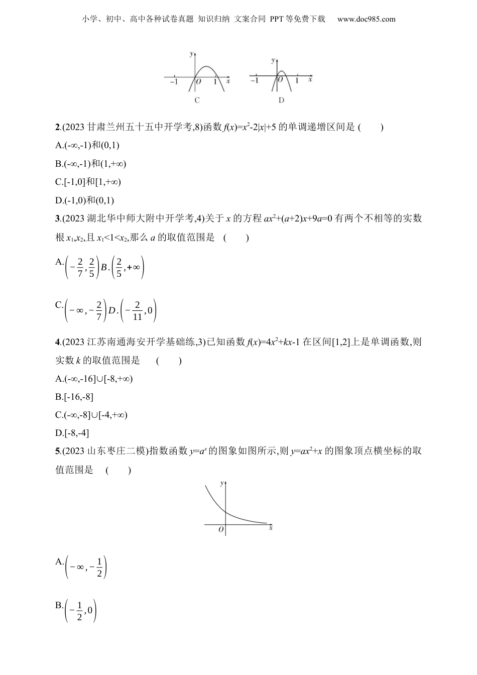 小学、初中、高中各种试卷真题知识归纳文案合同PPT等免费下载www.doc985.com2025新教材数学高考第一轮复习3.4二次函数、幂函数五年高考考点1二次函数1.(2013浙江文,7,5分,易)已知a,b,c∈R,函数f(x)=ax2+bx+c.若f(0)=f(4)>f(1),则()A.a>0,4a+b=0B.a<0,4a+b=0C.a>0,2a+b=0D.a<0,2a+b=02.(2017浙江,5,4分,中)若函数f(x)=x2+ax+b在区间[0,1]上的最大值是M,最小值是m,则M-m的值()A.与a有关,且与b有关B.与a有关,但与b无关C.与a无关,且与b无关D.与a无关,但与b有关3.(2014北京,8,5分,中)加工爆米花时,爆开且不糊的粒数占加工总粒数的百分比称为“可食用率”.在特定条件下,可食用率p与加工时间t(单位:分钟)满足函数关系p=at2+bt+c(a,b,c是常数),如图,记录了三次实验的数据.根据上述函数模型和实验数据,可以得到最佳加工时间为()A.3.50分钟B.3.75分钟C.4.00分钟D.4.25分钟4.(2014江苏,10,5分,中)已知函数f(x)=x2+mx-1,若对于任意x[∈m,m+1]都有f(x)<0,则实数m的取值范围为.5.(2012江苏,13,5分,中)已知函数f(x)=x2+ax+b(a,b∈R)的值域为[0,+∞),若关于x的不等式f(x)<c的解集为(m,m+6),则实数c的值为.6.(2018天津,14,5分,难)已知a∈R,函数f(x)={x2+2x+a−2,x≤0,−x2+2x−2a,x>0.若对任意x[-3,+∞),∈f(x)≤|x|恒成立,则a的取值范围是.小学、初中、高中各种试卷真题知识归纳文案合同PPT等免费下载www.doc985.com考点2幂函数1.(2014浙江,7,5分,中)在同一直角坐标系中,函数f(x)=xa(x>0),g(x)=logax的图象可能是()2.(2020课标Ⅱ文,10,5分,中)设函数f(x)=x3-1x3,则f(x)()A.是奇函数,且在(0,+∞)单调递增B.是奇函数,且在(0,+∞)单调递减C.是偶函数,且在(0,+∞)单调递增D.是偶函数,且在(0,+∞)单调递减3.(2018上海,7,5分,易)已知α∈-2,-1,-12,12,1,2,3.若幂函数f(x)=xα为奇函数,且在(0,+∞)上递减,则α=.三年模拟综合基础练1.(2024届江西吉安泰和中学质检,6)指数函数y=(ba)x的图象如图所示,则二次函数y=ax2+bx的图象可能是()小学、初中、高中各种试卷真题知识归纳文案合同PPT等免费下载www.doc985.com2.(2023甘肃兰州五十五中开学考,8)函数f(x)=x2-2|x|+5的单调递增区间是()A.(-∞,-1)和(0,1)B.(-∞,-1)和(1,+∞)C.[-1,0]和[1,+∞)D.(-1,0)和(0,1)3.(2023湖北华中师大附中开学考,4)关于x的方程ax2+(a+2)x+9a=0有两个不相等的实数根x1,x2,且x1<1<x2,那么a的取值范围是()A.(−27,25)B.(25,+∞)C.(−∞,−27)D.(−211,0)4.(2023江苏南通海安开学基础练,3)已知函数f(x)=4x2+kx-1在区间[1,2]上是单调函数,则实数k的取值范围是()A.(-∞,-16][-8,+∞)∪B.[-16,-8]C.(-∞,-8][-4,+∞)∪D.[-8,-4]5.(2023山东枣庄二模)指数函数y=ax的图象如图所示,则y=ax2+x的图象顶点横坐标的取值范围是()A.(−∞,−12)B.(−12,0)小学、初中、高中各种试卷真题知识归纳文案合同PPT等免费下载www.doc985.comC.(0,12)D.(−12,+∞)6.(2024届重庆南开中学月考,13)已知幂函数y=(m2-3)xm2+m−3在(0,+∞)上单调递减,则实数m=.7.(2024届广东潮州潮安凤塘中学统测(一),14)已知二次函数f(x)满足f(0)=0,f(x-1)=f(x)+3x-5,则不等式f(x)>0的解集为.综合拔高练1.(2024届福建连城一中月考,6)给定函数f(x)=x2,g(x)=-x2+x,x∈R.用m(x)表示f(x),g(x)中的较小者,记为m(x)=min{f(x),g(x)},则m(x)的最大值为()A.14B.1C.0D.22.(2023北京海淀一模,8)已知二次函数f(x),对任意的x∈R,有f(2x)<2f(x),则f(x)的图象可能是()3.(2023辽宁锦州检测,7)设函数f(x)的定义域为R,满足f(x-2)=2f(x),且当x(0,2]∈时,f(x)=x(2-x).若对任意x[∈a,+∞),都有f(x)≤38成立,则a的取值范围是()A.[72,+∞)B.[52,+∞)C.(−∞,−32]D.(−∞,−52]小学、初中、高中各种试卷真题知识归纳文案合同PPT等免费下载www.doc985.com4.(2023河北承德一中质检,8)关于x的方程x2+(m-2)x+2m-1=0恰有一根在区间(0,1)内,则实数m的取值范围是()A.[12,32]B.(12,23]C.[12,2)D.(12,23]{6-2∪❑√7}5.(多选)(2024届江西吉安泰和中学质检,10)已知函数f(x)={x2,−2≤x<1,−x+2,x≥1,关于函数f(x)的结论正确的是()A.f(x)的定义域为RB.f(x)的值域为(-∞,4]C.若f(x)=2,则x的值是-❑√2D.f(x)<1的解集为(-...
