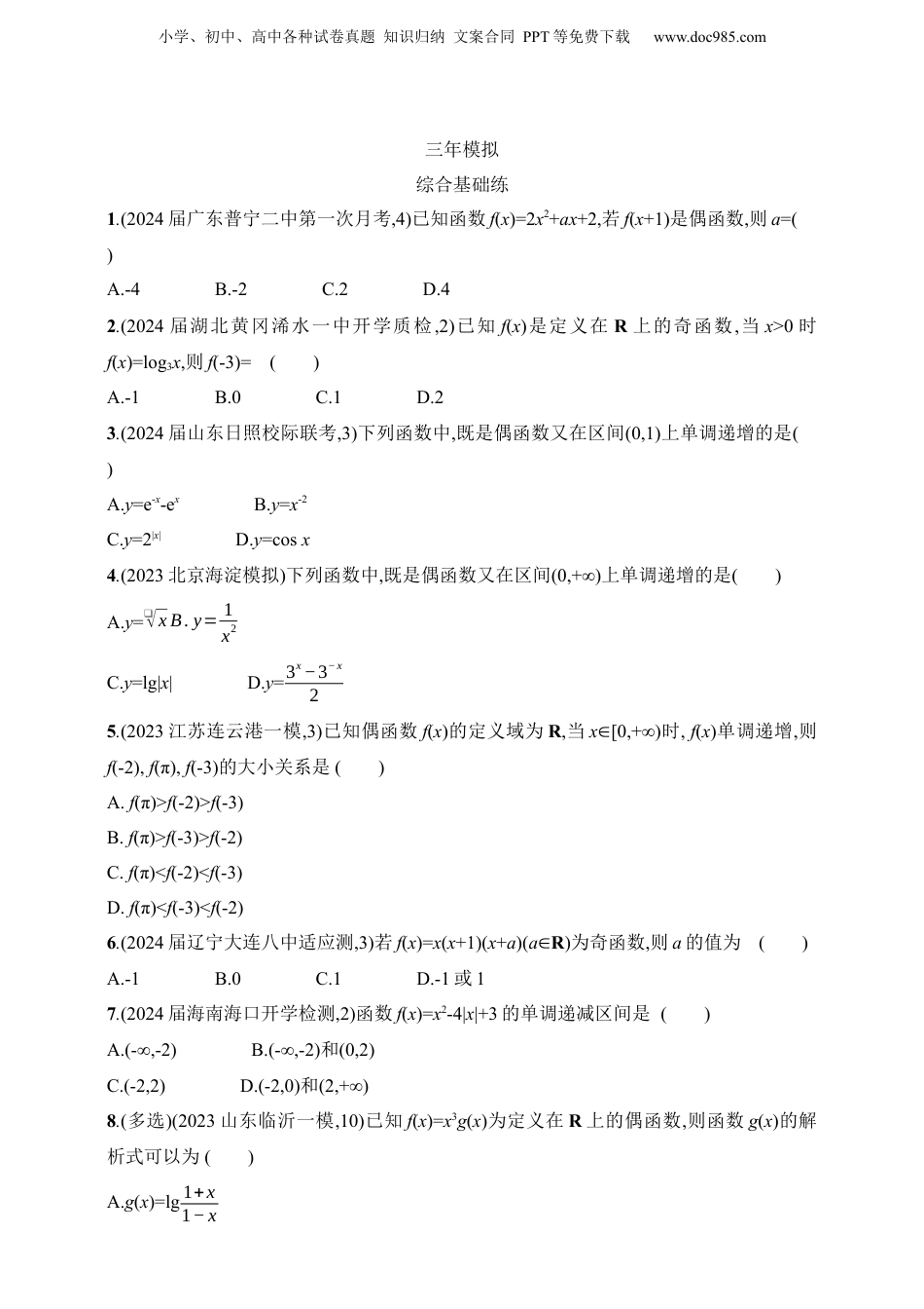 小学、初中、高中各种试卷真题知识归纳文案合同PPT等免费下载www.doc985.com2025新教材数学高考第一轮复习3.2函数的单调性与奇偶性五年高考考点1函数的单调性1.(2021全国甲文,4,5分,易)下列函数中是增函数的为()A.f(x)=-xB.f(x)=(23)xC.f(x)=x2D.f(x)=3√x2.(2023新课标Ⅰ,4,5分,易)设函数f(x)=2x(x-a)在区间(0,1)单调递减,则a的取值范围是()A.(-∞,-2]B.[-2,0)C.(0,2]D.[2,+∞)3.(2020新高考Ⅱ,7,5分,中)已知函数f(x)=lg(x2-4x-5)在(a,+∞)单调递增,则a的取值范围是()A.(-∞,-1]B.(-∞,2]C.[2,+∞)D.[5,+∞)4.(2023全国甲文,11,5分,中)已知函数f(x)=e−(x−1)2.记a=f(❑√22),b=f(❑√32),c=f(❑√62),则()A.b>c>aB.b>a>cC.c>b>aD.c>a>b5.(2020新高考Ⅰ,8,5分,难)若定义在R的奇函数f(x)在(-∞,0)单调递减,且f(2)=0,则满足xf(x-1)≥0的x的取值范围是()A.[-1,1][3,+∞)∪B.[-3,-1][0,1]∪C.[-1,0][1,+∞)∪D.[-1,0][1,3]∪6.(2022北京,14,5分,难)设函数f(x)={−ax+1,x<a,(x−2)2,x≥a.若f(x)存在最小值,则a的一个取值为;a的最大值为.考点2函数的奇偶性1.(2023全国乙理,4,5分,易)已知f(x)=xexeax−1是偶函数,则a=()小学、初中、高中各种试卷真题知识归纳文案合同PPT等免费下载www.doc985.comA.-2B.-1C.1D.22.(2023新课标Ⅱ,4,5分,易)若f(x)=(x+a)·ln2x−12x+1为偶函数,则a=()A.-1B.0C.12D.13.(2022北京,4,4分,易)已知函数f(x)=11+2x,则对任意实数x,有()A.f(-x)+f(x)=0B.f(-x)-f(x)=0C.f(-x)+f(x)=1D.f(-x)-f(x)=134.(2021全国乙理,4,5分,易)设函数f(x)=1−x1+x,则下列函数中为奇函数的是()A.f(x-1)-1B.f(x-1)+1C.f(x+1)-1D.f(x+1)+15.(2021新高考Ⅱ,8,5分,中)设函数f(x)的定义域为R,且f(x+2)为偶函数,f(2x+1)为奇函数,则()A.f(−12)=0B.f(-1)=0C.f(2)=0D.f(4)=06.(2020课标Ⅱ理,9,5分,难)设函数f(x)=ln|2x+1|-ln|2x-1|,则f(x)()A.是偶函数,且在(12,+∞)单调递增B.是奇函数,且在(−12,12)单调递减C.是偶函数,且在(−∞,−12)单调递增D.是奇函数,且在(−∞,−12)单调递减7.(2023全国甲理,13,5分,易)若f(x)=(x-1)2+ax+sin(x+π2)为偶函数,则a=.8.(2021新高考Ⅰ,13,5分,易)已知函数f(x)=x3·(a·2x-2-x)是偶函数,则a=.小学、初中、高中各种试卷真题知识归纳文案合同PPT等免费下载www.doc985.com三年模拟综合基础练1.(2024届广东普宁二中第一次月考,4)已知函数f(x)=2x2+ax+2,若f(x+1)是偶函数,则a=()A.-4B.-2C.2D.42.(2024届湖北黄冈浠水一中开学质检,2)已知f(x)是定义在R上的奇函数,当x>0时f(x)=log3x,则f(-3)=()A.-1B.0C.1D.23.(2024届山东日照校际联考,3)下列函数中,既是偶函数又在区间(0,1)上单调递增的是()A.y=e-x-exB.y=x-2C.y=2|x|D.y=cosx4.(2023北京海淀模拟)下列函数中,既是偶函数又在区间(0,+∞)上单调递增的是()A.y=❑√xB.y=1x2C.y=lg|x|D.y=3x−3−x25.(2023江苏连云港一模,3)已知偶函数f(x)的定义域为R,当x[0,+∞)∈时,f(x)单调递增,则f(-2),f(π),f(-3)的大小关系是()A.f(π)>f(-2)>f(-3)B.f(π)>f(-3)>f(-2)C.f(π)<f(-2)<f(-3)D.f(π)<f(-3)<f(-2)6.(2024届辽宁大连八中适应测,3)若f(x)=x(x+1)(x+a)(a∈R)为奇函数,则a的值为()A.-1B.0C.1D.-1或17.(2024届海南海口开学检测,2)函数f(x)=x2-4|x|+3的单调递减区间是()A.(-∞,-2)B.(-∞,-2)和(0,2)C.(-2,2)D.(-2,0)和(2,+∞)8.(多选)(2023山东临沂一模,10)已知f(x)=x3g(x)为定义在R上的偶函数,则函数g(x)的解析式可以为()A.g(x)=lg1+x1−x小学、初中、高中各种试卷真题知识归纳文案合同PPT等免费下载www.doc985.comB.g(x)=3x-3-xC.g(x)=12+12x+1D.g(x)=ln(❑√x2+1+x)9.(2024届广东佛山摸底考,14)设函数f(x)=(x+1)2+sinxx2+1的最大值为M,最小值为m,则m+M=.10.(2024届重庆渝北中学月考,15)关于函数f(x)=❑√x2−x4|x−1∨−1的描述,正确的是.①f(x)的定义域为[-1,0)(0,1];∪②f(x)的值域为(-1,1);③f(x)为定义域内的增函数;④f(x)的图象关于原点对称.11.(2023山东枣庄三中质检,19改编)已知定义在R上的奇函数f(x)和偶函数g(x)满足12f(x)-g(x)=x−1x2+1,求f(x),g(x)的解析式.综合拔高练1.(2024届广东深圳罗湖开学模考,4)已知函...