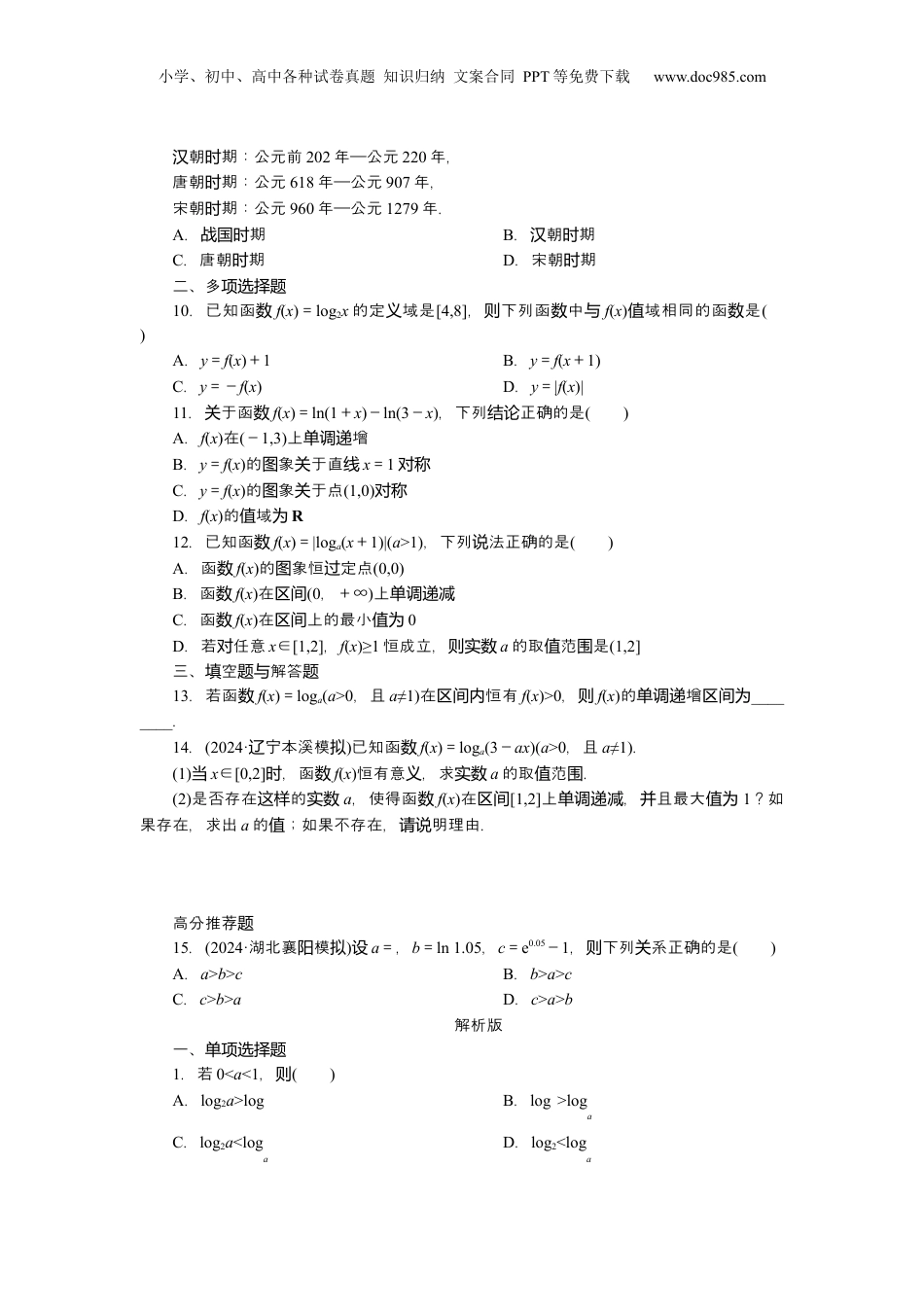 小学、初中、高中各种试卷真题知识归纳文案合同PPT等免费下载www.doc985.com限跟踪时检测(十二)函对数数一、单项选择题1.若0<a<1,则()A.log2a>logB.log>logaC.log2a<logaD.log2<loga2.(2024·山坊月考东潍)若函数y=f(x)是函数y=ax(a>0,a≠1)的反函,数g(x)=f(x-2)+1,则g(x)定点过()A.(2,0)B.(2,1)C.(3,0)D.(3,1)3.(2024·安徽安模庆拟)若实数x足满log3x=1+sinθ,则log2(|x-1|+|x-9|)的值为()A.2B.3C.4D.与θ有关4.(2024·山泰安模东拟)已知函对数数f(x)=log2x的象点图经过A(4,t),若a=log\f(1,2t,b=t,c=t,则()A.c<a<bB.c<b<aC.b<a<cD.a<b<c5.(2024·河北石家庄月考)函数y=的大致象是图()6.已知函数f(x)=log2(x+1)-|x|,不等式则f(x)>0的解集是()A.(-1,1)B.(0,1)C.(-1,0)D.∅7.若非零实数a,b,c足满2a=3b=6c=k,则()A.+=B.+=C.+=D.+=8.若函数y=loga(x2-ax+2)在区间(-∞,1]上,单调递减则a的取范是值围()A.(0,1)B.[2,+∞)C.[2,3)D.(1,3)9.(2024·河南州郑质检)生物体死亡后,体原有的它内碳14按确定的律衰,大会规减每约经过5730年衰原的一半,“半衰期”减为来这个时间称为.2023年,一墓葬殉葬检测动物尸体出土时碳14的余量占原始含量的残约79%,可推出墓葬于则断该属()考据:参数log20.79≈-0.34.考:参时间轴期:公元前战国时475年—公元前221年,小学、初中、高中各种试卷真题知识归纳文案合同PPT等免费下载www.doc985.com朝期:公元前汉时202年—公元220年,唐朝期:公元时618年—公元907年,宋朝期:公元时960年—公元1279年.A.期战国时B.朝期汉时C.唐朝期时D.宋朝期时二、多项选择题10.已知函数f(x)=log2x的定域是义[4,8],下列函中则数与f(x)域相同的函是值数()A.y=f(x)+1B.y=f(x+1)C.y=-f(x)D.y=|f(x)|11.于函关数f(x)=ln(1+x)-ln(3-x),下列正确的是结论()A.f(x)在(-1,3)上增单调递B.y=f(x)的象于直图关线x=1对称C.y=f(x)的象于点图关(1,0)对称D.f(x)的域值为R12.已知函数f(x)=|loga(x+1)|(a>1),下列法正确的是说()A.函数f(x)的象恒定点图过(0,0)B.函数f(x)在区间(0,+∞)上单调递减C.函数f(x)在上的最小区间值为0D.若任意对x∈[1,2],f(x)≥1恒成立,则实数a的取范是值围(1,2]三、空解答填题与题13.若函数f(x)=loga(a>0,且a≠1)在恒有区间内f(x)>0,则f(x)的增单调递区间为________.14.(2024·宁本溪模辽拟)已知函数f(x)=loga(3-ax)(a>0,且a≠1).(1)当x∈[0,2],函时数f(x)恒有意,求义实数a的取范.值围(2)是否存在的这样实数a,使得函数f(x)在区间[1,2]上,且最大单调递减并值为1?如果存在,求出a的;如果不存在,明理由.值请说高分推荐题15.(2024·湖北襄模阳拟)设a=,b=ln1.05,c=e0.05-1,下列系正确的是则关()A.a>b>cB.b>a>cC.c>b>aD.c>a>b解析版一、单项选择题1.若0<a<1,则()A.log2a>logB.log>logaC.log2a<logaD.log2<loga小学、初中、高中各种试卷真题知识归纳文案合同PPT等免费下载www.doc985.com解析: 0<a<1,∴0<a2<a<<1.在A中,log2a=log,故A错误;在B中,log>loga,故B正确;在C中,log2a>loga,故C错误;在D中,log2>loga,故D错误.答案:B2.(2024·山坊月考东潍)若函数y=f(x)是函数y=ax(a>0,a≠1)的反函,数g(x)=f(x-2)+1,则g(x)定点过()A.(2,0)B.(2,1)C.(3,0)D.(3,1)解析:函数y=ax(a>0,且a≠1)的反函是数f(x)=logax,∴g(x)=f(x-2)+1=loga(x-2)+1,定点过(3,1).答案:D3.(2024·安徽安模庆拟)若实数x足满log3x=1+sinθ,则log2(|x-1|+|x-9|)的值为()A.2B.3C.4D.与θ有关解析:-1≤sinθ≤1⇒0≤1+sinθ≤2,由log3x=1+sinθ,可得1≤x≤9,log2(|x-1|+|x-9|)=log28=3,故选B.答案:B4.(2024·山泰安模东拟)已知函对数数f(x)=log2x的象点图经过A(4,t),若a=log\f(1,2t,b=t,c=t,则()A.c<a<bB.c<b<aC.b<a<cD.a<b<c解析:函对数数f(x)=log2x的象点图经过A(4,t),则t=f(4)=log24=2,所以a=log\f(1,2t=log\f(1,22=-1,b=t...