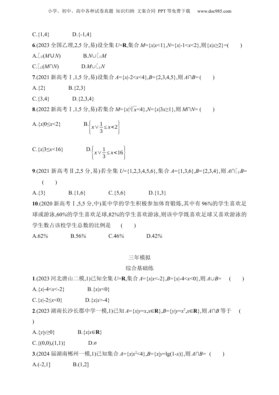 小学、初中、高中各种试卷真题知识归纳文案合同PPT等免费下载www.doc985.com2025新教材数学高考第一轮复习专题一集合与常用逻辑用语1.1集合五年高考考点1集合及其关系1.(2022全国乙理,1,5分,易)设全集U={1,2,3,4,5},集合M满足∁UM={1,3},则()A.2∈MB.3∈MC.4∉MD.5∉M2.(2023新课标Ⅱ,2,5分,易)设集合A={0,-a},B={1,a-2,2a-2},若A⊆B,则a=()A.2B.1C.23D.-13.(2020课标Ⅲ理,1,5分,易)已知集合A={(x,y)|x,y∈N*,y≥x},B={(x,y)|x+y=8},则A∩B中元素的个数为()A.2B.3C.4D.64.(2018课标Ⅱ,2,5分,易)已知集合A={(x,y)|x2+y2≤3,x∈Z,y∈Z},则A中元素的个数为()A.9B.8C.5D.4考点2集合的基本运算1.(2023新课标Ⅰ,1,5分,易)已知集合M={-2,-1,0,1,2},N={x|x2-x-6≥0},则M∩N=()A.{-2,-1,0,1}B.{0,1,2}C.{-2}D.{2}2.(2023全国乙文,2,5分,易)设全集U={0,1,2,4,6,8},集合M={0,4,6},N={0,1,6},则M∪∁UN=()A.{0,2,4,6,8}B.{0,1,4,6,8}C.{1,2,4,6,8}D.U3.(2020新高考Ⅱ,1,5分,易)设集合A={2,3,5,7},B={1,2,3,5,8},则A∩B=()A.{1,8}B.{2,5}C.{2,3,5}D.{1,2,3,5,7,8}4.(2020新高考Ⅰ,1,5分,易)设集合A={x|1≤x≤3},B={x|2<x<4},则A∪B=()A.{x|2<x≤3}B.{x|2≤x≤3}C.{x|1≤x<4}D.{x|1<x<4}5.(2022新高考Ⅱ,1,5分,易)已知集合A={-1,1,2,4},B={x||x-1|≤1},则A∩B=()A.{-1,2}B.{1,2}小学、初中、高中各种试卷真题知识归纳文案合同PPT等免费下载www.doc985.comC.{1,4}D.{-1,4}6.(2023全国乙理,2,5分,易)设全集U=R,集合M={x|x<1},N={x|-1<x<2},则{x|x≥2}=()A.∁U(M∪N)B.N∪∁UMC.∁U(M∩N)D.M∪∁UN7.(2021新高考Ⅰ,1,5分,易)设集合A={x|-2<x<4},B={2,3,4,5},则A∩B=()A.{2}B.{2,3}C.{3,4}D.{2,3,4}8.(2022新高考Ⅰ,1,5分,易)若集合M={x|❑√x<4},N={x|3x≥1},则M∩N=()A.{x|0≤x<2}B.{x∨13≤x<2}C.{x|3≤x<16}D.{x∨13≤x<16}9.(2021新高考Ⅱ,2,5分,易)若全集U={1,2,3,4,5,6},集合A={1,3,6},B={2,3,4},则A∩∁UB=()A.{3}B.{1,6}C.{5,6}D.{1,3}10.(2020新高考Ⅰ,5,5分,中)某中学的学生积极参加体育锻炼,其中有96%的学生喜欢足球或游泳,60%的学生喜欢足球,82%的学生喜欢游泳,则该中学既喜欢足球又喜欢游泳的学生数占该校学生总数的比例是()A.62%B.56%C.46%D.42%三年模拟综合基础练1.(2023河北唐山二模,1)已知全集U=R,集合A={x|x<-2},B={x|-4<x<0},则A∪B=()A.{x|-4<x<-2}B.{x|x<0}C.{x|-2≤x<0}D.{x|x>-4}2.(2023湖南长沙长郡中学一模,1)已知A={x|y=x,x∈R},B={y|y=x2,x∈R},则A∩B等于()A.{y|y≥0}B.{x|x∈R}C.{(0,0),(1,1)}D.⌀3.(2024届湖南郴州一模,1)已知集合A={x|x2<4},B={x|y=lg(1-x)},则A∩B=()A.(-2,1]B.(1,2]小学、初中、高中各种试卷真题知识归纳文案合同PPT等免费下载www.doc985.comC.(-2,1)D.(0,2)4.(2024届山东烟台蓬莱两校联考,1)已知集合A={x|-3≤x≤2},B={x||x|≤2},则()A.A⊆BB.B⊆AC.A∩B={x|-2≤x<2}D.A∪B={x|-3≤x<2}5.(2024届浙江名校联盟模拟(一),1)已知集合A={x|(x-2)2≥x+10},B={x|2x>1},则A∪B=()A.{x|x≥3}B.{x|x≥6}C.{x|x≤2或x≥3}D.{x|x≤-1或x>0}6.(2023山东潍坊二模,1)已知集合M={x|x+1≥0},N={x|2x<1},则下列Venn图中阴影部分可以表示集合{x|-1≤x<0}的是()7.(2023安徽淮北二模,2)已知集合M={x||x-4|<5},N={x|0<lnx<2},则下列命题错误的是()A.∃x0∈M,x0∉NB.∀x∈N,x∈MC.∃x0∈N,x0∈MD.∀x∈M,x∉N8.(2023河南开封三模,2)已知集合A={x∨x=sinnπ2,n∈Z},B={x|x=ab,a,b∈A},则集合B的真子集个数是()A.3B.4C.7D.89.(2024届河南TOP二十名校调研(三),1)已知集合A={x|a2-a<x<2,x∈Z}中恰有两个元素,则a的取值范围为()A.[0,1]B.(0,1)C.(1,2)D.[1,2]10.(2024届四川雅安零诊,1)设card(A)表示有限集合A中元素的个数,则card(A∪B)=card(A)+card(B)是A∩B=⌀的()小学、初中、高中各种试卷真题知识归纳文案合同PPT等免费下载www.doc985.comA.充分不必要条件B.必要不充分条件C.充要条件D.既不充分也不必要条件11.(2024届福建宁德福鼎第一中学一模,1)已知集合A={x∈N∗∨x+2x−3≤0},B={x|x≤-1或x≥2},则A∩(∁RB)=()A.⌀B.{1}C.{0,1}D.{0,1,2}12.(2024届海南琼中模拟(一),1...