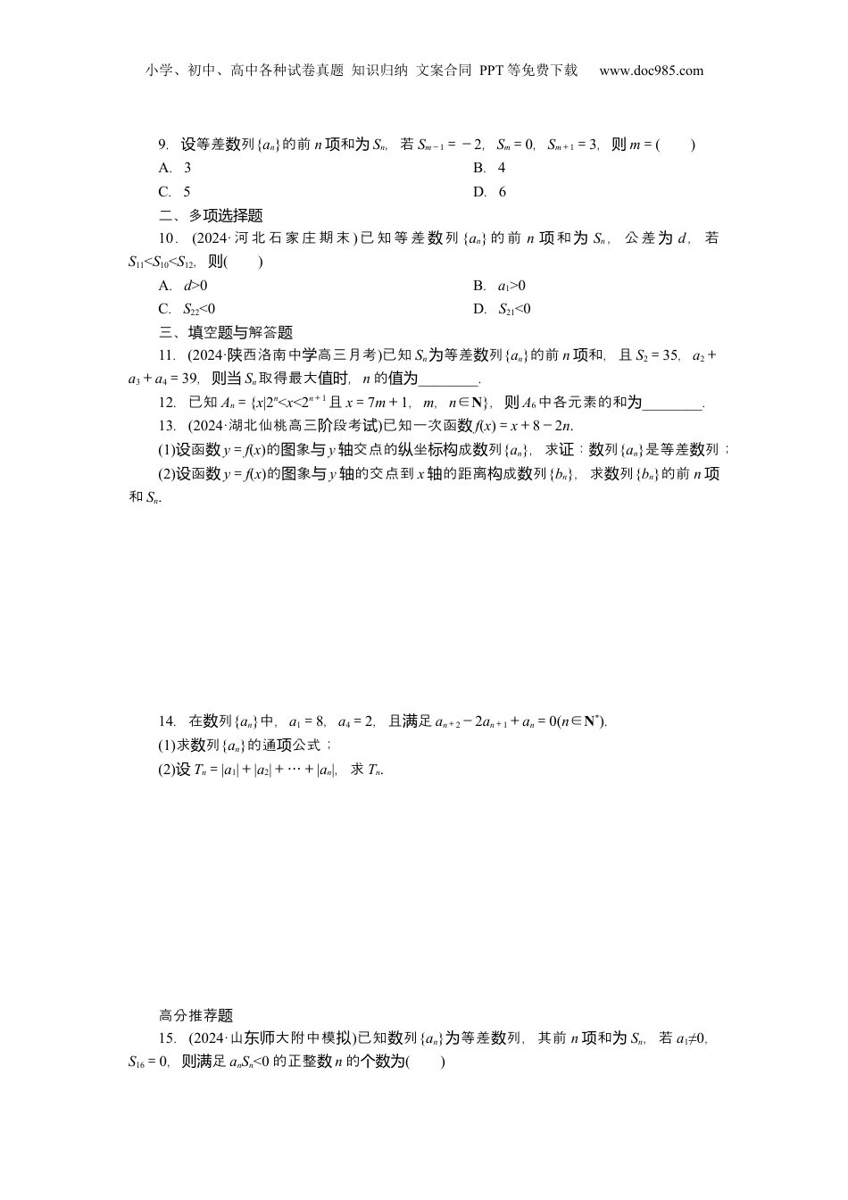 小学、初中、高中各种试卷真题知识归纳文案合同PPT等免费下载www.doc985.com限跟踪时检测(三十六)等差列数一、单项选择题1.(2019·全Ⅰ卷,理国)记Sn等差列为数{an}的前n和.已知项S4=0,a5=5,则()A.an=2n-5B.an=3n-10C.Sn=2n2-8nD.Sn=n2-2n2.已知列数{an}足满a1=1,an+1=ran+r(n∈N*,r∈R,r≠0),“则r=1”是“列数{an}等差列”的为数()A.充分不必要件条B.必要不充分件条C.充要件条D.不充分也不必要件既条3.(2024·山南模东济拟)在等差列数{an}中,a2,a14是方程x2+6x+2=0的根两个实数,=则()A.-B.-3C.-6D.24.(2024·湘皖十五校考赣联)已知列数{an}的前n和项为Sn,且足列满数{2an}是等比数列,若a4+a1009+a2014=,则S2017的是值()A.B.1008C.2015D.20165.已知+=椭圆1上有n不同的点个P1,P2,P3,…,Pn,右焦点椭圆为F,若列数是公差大于的等差列,数则n的最大值为()A.2017B.2018C.4036D.40376.列设数{an}的前n和项为Sn,且是等差列,若数a3=3a5,=则()A.B.C.D.7.(2024·宁中等五校考辽实验学联)已知列数{an}足满3an+1=9·3an(n∈N*),且a2+a4+a6=9,则log\f(1,3(a1+a9+a11)=()A.-B.3C.-3D.8.(2024·福建三明一中期末)《九章算》是我古代的一本名著.全有方田、术国数学书粟米、衰分、少广、商功、均、盈不足、方程、勾股九章,收有输246生、生活个与产实有系的用.中有一道目“今有五人分五,令上二人所得下三人等,践联应问题书这样题钱与各得几何?”其意思“有五人分问为现个5,且多的之和等于少的三之和,钱较两份较份问五人各得多少?”在此中,若每人分得成等差列,任意人分得的最大差题钱数数则两值为()A.B.C.D.小学、初中、高中各种试卷真题知识归纳文案合同PPT等免费下载www.doc985.com9.等差列设数{an}的前n和项为Sn,若Sm-1=-2,Sm=0,Sm+1=3,则m=()A.3B.4C.5D.6二、多项选择题10.(2024·河北石家庄期末)已知等差列数{an}的前n和项为Sn,公差为d,若S11<S10<S12,则()A.d>0B.a1>0C.S22<0D.S21<0三、空解答填题与题11.(2024·西洛南中高三月考陕学)已知Sn等差列为数{an}的前n和,且项S2=35,a2+a3+a4=39,则当Sn取得最大,值时n的值为________.12.已知An={x|2n<x<2n+1且x=7m+1,m,n∈N},则A6中各元素的和为________.13.(2024·湖北仙桃高三段考阶试)已知一次函数f(x)=x+8-2n.(1)函设数y=f(x)的象图与y交点的坐成列轴纵标构数{an},求:列证数{an}是等差列数;(2)函设数y=f(x)的象图与y的交点到轴x的距离成列轴构数{bn},求列数{bn}的前n项和Sn.14.在列数{an}中,a1=8,a4=2,且足满an+2-2an+1+an=0(n∈N*).(1)求列数{an}的通公式;项(2)设Tn=|a1|+|a2|+…+|an|,求Tn.高分推荐题15.(2024·山大附中模东师拟)已知列数{an}等差列,其前为数n和项为Sn,若a1≠0,S16=0,足则满anSn<0的正整数n的个数为()小学、初中、高中各种试卷真题知识归纳文案合同PPT等免费下载www.doc985.comA.6B.7C.8D.9解析版一、单项选择题1.(2019·全Ⅰ卷,理国)记Sn等差列为数{an}的前n和.已知项S4=0,a5=5,则()A.an=2n-5B.an=3n-10C.Sn=2n2-8nD.Sn=n2-2n解析:等差列设数{an}的公差为d, ∴解得∴an=a1+(n-1)d=-3+2(n-1)=2n-5,Sn=na1+d=n2-4n.故选A.答案:A2.已知列数{an}足满a1=1,an+1=ran+r(n∈N*,r∈R,r≠0),“则r=1”是“列数{an}等差列”的为数()A.充分不必要件条B.必要不充分件条C.充要件条D.不充分也不必要件既条解析:当r=1,时an+1=ran+r⇒an+1=an+1,∴列数{an}公差为为1的等差列,即数充分性成立; an+1=ran+r,a1=1,∴a2=2r,a3=2r2+r,若列数{an}等差列,为数则4r=1+2r2+r,解得r=1或r=,即必要性不成立.上,“综r=1”是“列数{an}等差列”的为数充分不必要件,故条选A.答案:A3.(2024·山南模东济拟)在等差列数{an}中,a2,a14是方程x2+6x+2=0的根两个实数,=则()A.-B.-3C.-6D.2解析:因为a2,a14是方程x2+6x+2=0的根,所以两个实数a2+a14=2a8=-6...