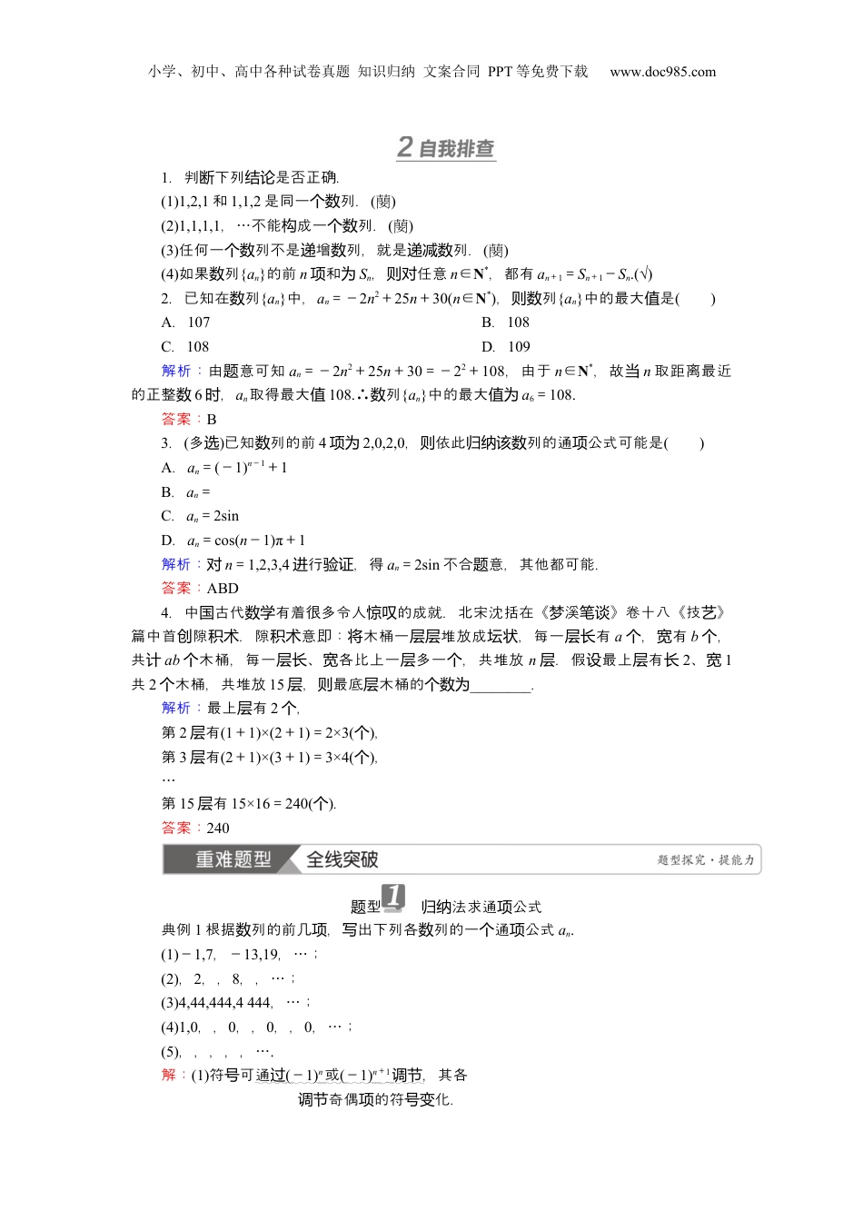 小学、初中、高中各种试卷真题知识归纳文案合同PPT等免费下载www.doc985.com第1列的念及表示讲数概简单要点通日常生活和中的例,了解列的念和表示方法复习过数学实数概(列表、象、图公式),了解列是一特殊函.数种数一列的有念数关概念概含义列数按照一定序顺排列的一列数列的数项列中的数每一个数列的通数项列数{an}的第n项an通公式项列数{an}的第n项an与n之的系能用公式间关an=f(n)表,公式达这个叫做列的通公式数项前n和项列数{an}中,Sn=a1+a2+…+an叫做列的前数n和项二列的分数类分原类则型类足件满条按分项数类有列穷数项数有限无列穷数项数无限按项与项间的大小系关分类增列递数an+1>an其中n∈N*列递减数an+1<an常列数an+1=an按其他准分标类有界列数存在正数M,使|an|≤M列摆动数第二起,有些大于的前从项项它一,有些小于的前一的项项它项列数三列的表示方法数1.表示方法列表法列表格表达n与an的系对应关象法图把点(n,an)在平面直角坐系中画标公式法通项公式把列的通用数项公式表的方法达推递公式使用初始值a1和an+1=f(an)或a1,a2和an+1=f(an,an-1)等表列达数的方法2.列的函特征:上面列的三表示方法也是函的表示方法,列可以看作是数数数种数数定域正整集义为数(或的有限子集它{1,2,…,n})的函数an=f(n),自量由小到大依次当变取所的一系列值时对应函.数值四an与Sn的系关若列数{an}的前n和项为Sn,则an=常/用/结/论在列数{an}中,若an最大,若则an最小,则列中求最的方法.数值小学、初中、高中各种试卷真题知识归纳文案合同PPT等免费下载www.doc985.com1.判下列是否正确.断结论(1)1,2,1和1,1,2是同一列.个数()(2)1,1,1,1,…不能成一列.构个数()(3)任何一列不是增列,就是列.个数递数递减数()(4)如果列数{an}的前n和项为Sn,任意则对n∈N*,都有an+1=Sn+1-Sn.(√)2.已知在列数{an}中,an=-2n2+25n+30(n∈N*),列则数{an}中的最大是值()A.107B.108C.108D.109解析:由意可知题an=-2n2+25n+30=-22+108,由于n∈N*,故当n取距离最近的正整数6,时an取得最大值108.∴列数{an}中的最大值为a6=108.答案:B3.(多选)已知列的前数4项为2,0,2,0,依此列的通公式可能是则归纳该数项()A.an=(-1)n-1+1B.an=C.an=2sinD.an=cos(n-1)π+1解析:对n=1,2,3,4行,得进验证an=2sin不合意,其他都可能.题答案:ABD4.中古代有着很多令人的成就.北宋沈括在《溪》卷十八《技》国数学惊叹梦笔谈艺篇中首隙.隙意即:木桶一堆放成,每一有创积术积术将层层坛状层长a,有个宽b,个共计ab木桶,每一、各比上一多一,共堆放个层长宽层个n.假最上有层设层长2、宽1共2木桶,共堆放个15,最底木桶的层则层个数为________.解析:最上有层2,个第2有层(1+1)×(2+1)=2×3(个),第3有层(2+1)×(3+1)=3×4(个),…第15有层15×16=240(个).答案:240型题法求通公式归纳项典例1根据列的前几,出下列各列的一通公式数项写数个项an.(1)-1,7,-13,19,…;(2),2,,8,,…;(3)4,44,444,4444,…;(4)1,0,,0,,0,,0,…;(5),,,,,….解:(1)符可号通过(-1)n或(-1)n+1调节,其各奇偶的符化.调节项号变小学、初中、高中各种试卷真题知识归纳文案合同PPT等免费下载www.doc985.com的的排列律:后面的的比前面的大项绝对值规数绝对值总数绝对值6,故通公式项为an=(-1)n(6n-5).(2)列的有的是分数项数,有的是整,可先各数将分型列常有的特点:数数结构①分子的化律;变规②分母的化律;变规③分子分母间的系.联都一成分的形式再察:,,,,,…,故所求列的一通公式项统写数观数个项为an=.(3)原列改将数写为×9,×99,×999,…,易知列数9,99,999,…的通项为10n-1,故原列数基列推广到其他形式.础数的一通公式个项为an=(10n-1).(4)把原列改成,,,,,,,,…,分母依次数写为1,2,3,…,而分子1,0,1,0,…呈周期性出,因此原列的一通公式现数个项为an=.列常的就是摆动数见设计1+(-1)n+1.(5)是一分列,其分子成偶列,而分母可分解这个数数构数数为1×3,3×5,5×7,7×9,9×11,…,即分母的...