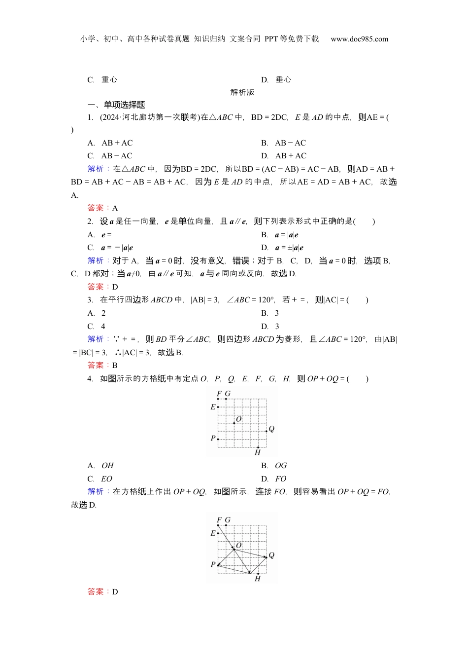 小学、初中、高中各种试卷真题知识归纳文案合同PPT等免费下载www.doc985.com限跟踪时检测(三十一)平面向量的念及性算概线运一、单项选择题1.(2024·河北廊坊第一次考联)在△ABC中,BD=2DC,E是AD的中点,则AE=()A.AB+ACB.AB-ACC.AB-ACD.AB+AC2.设a是任一向量,e是位向量,且单a∥e,下列表示形式中正确的是则()A.e=B.a=|a|eC.a=-|a|eD.a=±|a|e3.在平行四形边ABCD中,|AB|=3,∠ABC=120°,若+=,则|AC|=()A.2B.3C.4D.34.如所示的方格中有定点图纸O,P,Q,E,F,G,H,则OP+OQ=()A.OHB.OGC.EOD.FO5.已知M是△ABC的重心,D为BC的中点,下列等式成立的是则()A.|MA|=|MB|=|MC|B.MA+MB+MC=0C.BM=BA+BDD.S△MBC=S△ABC6.如所示,已知图AB是圆O的直,点径C,D是半弧的三等分点,圆两个AB=a,AC=b,则AD=()A.a-bB.a-bC.a+bD.a+b7.在四形边ABCD中,AB=a+2b,BC=-4a-b,CD=-5a-3b,四形则边ABCD的形是状()A.矩形B.平行四形边C.梯形D.以上都不对8.如所示,图设O是△ABC部一点,且内OA+OC=-2OB,则△ABC与△AOC的面之比积为()小学、初中、高中各种试卷真题知识归纳文案合同PPT等免费下载www.doc985.comA.4∶1B.2∶1C.3∶2D.4∶39.已知向量e1,e2是不共的向量,两个线a=2e1-e2与b=e1+λe2共,线则λ=()A.2B.-2C.-D.10.已知平面上不共的四点线O,A,B,C,若OA-4OB+3OC=0,=则()A.B.C.D.二、多项选择题11.点设M是△ABC所在平面一点,下列法正确的是内则说()A.若AM=AB+AC,点则M是边BC的中点B.若AM=2AB-AC,点则M在边BC的延上长线C.若AM=-BM-CM,点则M是△ABC的重心D.若AM=xAB+yAC,且x+y=,则△MBC的面是积△ABC面的积三、空解答填题与题12.一河的岸平行,河的度条两宽d=4km,一艘船岸从边A出到河的正岸,处发对已知船的速度|v1|=10km/h,水流速度|v2|=2km/h,那行航程最短,所用是么当驶时时间________h.(附:≈2.449.果精确到结0.01)13.(2024·云南江模丽拟)在△ABC中,点D在段线AC上,且足满|AD|=|AC|,点Q段为线BD上任意一点,若实数x,y足满AQ=xAB+yAC,+的最小则值为________.14.设a,b是不共的向量.线两个(1)若OA=2a-b,OB=3a+b,OC=a-3b,求:证A,B,C三点共;线(2)若8a+kb与ka+2b共,求线实数k的.值高分推荐题15.(2024·河北衡水中模学拟)已知O是平面上一定点,A,B,C是平面上不共的三线点,点动P足满OP=+λ,λ∈[0,+∞),点则P的迹轨经过△ABC的()A.外心B.心内小学、初中、高中各种试卷真题知识归纳文案合同PPT等免费下载www.doc985.comC.重心D.垂心解析版一、单项选择题1.(2024·河北廊坊第一次考联)在△ABC中,BD=2DC,E是AD的中点,则AE=()A.AB+ACB.AB-ACC.AB-ACD.AB+AC解析:在△ABC中,因为BD=2DC,所以BD=(AC-AB)=AC-AB,则AD=AB+BD=AB+AC-AB=AB+AC,因为E是AD的中点,所以AE=AD=AB+AC,故选A.答案:A2.设a是任一向量,e是位向量,且单a∥e,下列表示形式中正确的是则()A.e=B.a=|a|eC.a=-|a|eD.a=±|a|e解析:于对A,当a=0,有意,;于时没义错误对B,C,D,当a=0,时选项B,C,D都;对当a≠0,由a∥e可知,a与e同向或反向.故选D.答案:D3.在平行四形边ABCD中,|AB|=3,∠ABC=120°,若+=,则|AC|=()A.2B.3C.4D.3解析: +=,则BD平分∠ABC,四形则边ABCD菱形,且为∠ABC=120°,由|AB|=|BC|=3,∴|AC|=3,故选B.答案:B4.如所示的方格中有定点图纸O,P,Q,E,F,G,H,则OP+OQ=()A.OHB.OGC.EOD.FO解析:在方格上作出纸OP+OQ,如所示图,接连FO,容易看出则OP+OQ=FO,故选D.答案:D小学、初中、高中各种试卷真题知识归纳文案合同PPT等免费下载www.doc985.com5.已知M是△ABC的重心,D为BC的中点,下列等式成立的是则()A.|MA|=|MB|=|MC|B.MA+MB+MC=0C.BM=BA+BDD.S△MBC=S△ABC解析:如图,M为△ABC的重心,则MA+MB-MC=0,A,B错误;BM=BD+DM=BD+DA=BD+(BA-BD)=BA+BD,C错误;由DM=AD得S△MBC=S△ABC,D正确....