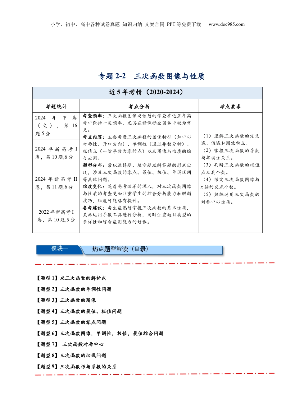 小学、初中、高中各种试卷真题知识归纳文案合同PPT等免费下载www.doc985.com专题2-2三次函数图像与性质近5年考情(2020-2024)考题统计考点分析考点要求2024年甲卷(文),第16题,5分考查频率:三次函数图像与性质的考查在近五年高考中保持一定频率,尤其在新课标全国卷中较为常见。考点内容:主要考查三次函数的图像特征(如中心对称性、开口方向)、单调性(通过导数分析)、极值点(一阶导数为零的点)以及图像与性质的综合应用。题型分布:常以选择题、填空题或解答题的形式出现,涉及三次函数的零点、最值、极值、单调区间等具体问题。难度变化:随着高考改革的深入,对三次函数图像与性质的考查更加注重学生的综合分析能力和解题技巧,难度可能略有提升。备考建议:考生应熟练掌握三次函数的基本性质,灵活运用导数工具进行分析,同时注重题目类型的多样性和综合应用能力的培养。(1)理解三次函数的定义域、值域和图像特点。(2)掌握三次函数的导数与单调性关系。(3)判断三次函数的极值点及其个数。(4)探究三次函数图像与x轴的交点个数。(5)熟练运用三次函数的对称中心性质。2024年新高考I卷,第10题,6分2024年新高考II卷,第11题,6分2022年新高考I卷,第10题,5分【题型1】求三次函数的解析式【题型2】三次函数的单调性问题【题型3】三次函数的图像【题型4】三次函数的最值、极值问题【题型5】三次函数的零点问题【题型6】三次函数图像,单调性,极值,最值综合问题【题型7】三次函数对称中心【题型8】三次函数的切线问题【题型9】三次函数根与系数的关系点型解(目)热题读录模一块小学、初中、高中各种试卷真题知识归纳文案合同PPT等免费下载www.doc985.com【题型1】求三次函数的解析式(1)一般式:(a≠0)(2)交点式:(a≠0)1.若三次函数满足,则()A.38B.171C.460D.965【题型2】三次函数的单调性问题三次函数是高中数学中的一个重要内容,其考点广泛且深入,主要涉及函数的性质、图像、最值、零点以及与其他函数的综合应用等方面。以下是对三次函数常见考点的详细分析:1.三次函数的定义与形式定义:形如f(x)=ax3+bx2+cx+d(其中a≠=0)的函数称为三次函数。形式:注意系数a,b,c,d的作用,特别是a的正负决定了函数的开口方向(a>0开口向上,a<0开口向下)。2.函数的单调性导数应用:利用导数f′(x)=3ax2+2bx+c判断函数的单调性。解不等式f′(x)>0和f′(x)<0得到函数的单调递增和递减区间。极值点:导数等于0的点(f′(x)=0)可能是极值点,需结合单调性判断是否为极大值或极小值点。2024·广东茂名市·一模核心型题·一反三举(讲与练)模二块小学、初中、高中各种试卷真题知识归纳文案合同PPT等免费下载www.doc985.com2.(多选)若32112132fxxxx是区间1,4mm上的单调函数,则实数m的值可以是()A.4B.3C.3D.4【巩固练习】三次函数在上是减函数,则的取值范围是()A.B.C.D.【题型3】三次函数的图像图像三次函数的定义域和值域均为R。对于值域,可以借助极限的思想。根据函数的解析式可知,影响其值域范围的主要是“ax3”这一项,因此可得:当a>0时,x趋近于+∞,则f(x)趋近于+∞;x趋近于-∞,则f(x)趋近于-∞。当a<0时,x趋近于+∞,则f(x)趋近于-∞;x趋近于-∞,则f(x)趋近于+∞。又因为f(x)是连续的函数,且xR∈,所以f(x)的值域为R。由于三次函数的值域为R,则它的函数图像与x轴至少有一个交点,换句话说三次方程至少有一个根。小学、初中、高中各种试卷真题知识归纳文案合同PPT等免费下载www.doc985.com3.设,若为函数的极大值点,则()A.B.C.D.4.(2024·全国一卷真题)(多选)设函数,则()A.是的极小值点B.当时,C.当时,D.当时,【巩固练习1】(多选题)(2024·湖北武汉·模拟预测)设函数,则下列结论正确的是()A.存在实数使得B.方程有唯一正实数解C.方程有唯一负实数解D.有负实数解【巩固练习2】(2024·全国甲卷(文)真题)曲线与在上有两个不同的交点,则的取值范围为.【题型4】三次函数的最值、极值问题三次函数的极值与最值极值:通过导数等于0找到可能的极值点,并判...