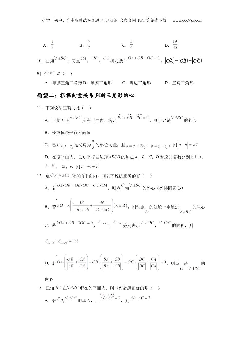 小学、初中、高中各种试卷真题知识归纳文案合同PPT等免费下载www.doc985.com专题突破卷08三角形中的“四心”问题题型一:三角形的心的向量表示1.已知点在所在平面内,且,,,则点依次是的()A.外心、重心、垂心B.重心、外心、垂心C.重心、外心、内心D.外心、重心、内心2.已知O是所在平面上的一点,若,则点O是的()A.外心B.内心C.重心D.垂心3.已知平面上四个点,其中任意三个不共线.若,则直线一定经过三角形的()A.外心B.内心C.重心D.垂心小学、初中、高中各种试卷真题知识归纳文案合同PPT等免费下载www.doc985.com4.在中,为的重心,.则()A.1B.C.D.5.已知,若点P满足,其中,则点P的轨迹一定通过的()A.外心B.内心C.垂心D.重心6.瑞士数学家欧拉是数学史上最多产的数学家,被誉为“数学之王”,欧拉在1765年发表了令人赞美的欧拉线定理:三角形的重心、垂心和外心共线,这条直线被称为欧拉线.已知,为所在平面上的点,满足,,则欧拉线一定过()A.B.C.D.7.在△ABC中,O为BC的中点,若,则动点M的轨迹必通过△ABC的()A.内心B.外心C.重心D.垂心8.已知O,P,N在所在平面内,满足,且,则点P,O,N依次是的()A.外心,垂心,重心B.重心,外心,内心C.垂心,外心,重心D.外心,重心,内心9.已知G是的重心,若,则()小学、初中、高中各种试卷真题知识归纳文案合同PPT等免费下载www.doc985.comA.B.C.D.10.已知,向量,,满足条件,|⃗OA)=|⃗OB)=|⃗OC).则是()A.等腰直角三角形B.等腰三角形C.等边三角形D.直角三角形题型二:根据向量关系判断三角形的心11.下列说法正确的是()A.已知P在所在平面内,满足,则点P是的外心B.长方体是平行六面体C.已知,是夹角为的单位向量,且,,则D.在复平面内,已知平行四边形ABCD的顶点A,B,C,D对应的复数分别是,,,z,则12.点在所在的平面内,则以下说法正确的有()A.若,则点为的外心(外接圆圆心)B.若,则动点的轨迹一定通过的重心C.若,,分别表示,的面积,则D.若,则点是的内心13.已知点在所在的平面内,则下列命题正确的是()A.若为的垂心,且,则小学、初中、高中各种试卷真题知识归纳文案合同PPT等免费下载www.doc985.comB.若,则的面积与的面积之比为C.若,则动点的轨迹经过的外心D.若E,F,G分别为,,的中点,且,,则的最大值为14.设点O是所在平面内任意一点,的内角A,B,C的对边分别为a,b,c,已知点O不在的边上,则下列结论正确的是()A.若点O是的重心,则B.若点O是的垂心,则C.若,则点O是的外心D.若O为的外心,H为的垂心,则15.“奔驰定理”因其几何表示酷似奔驰的标志得来,是平面向量中一个非常优美的结论.奔驰定理与三角形四心(重心、内心、外心、垂心)有着神秘的关联.它的具体内容是:已知M是内一点,,,的面积分别为,,,且.以下命题正确的是()A.若,则M为的重心小学、初中、高中各种试卷真题知识归纳文案合同PPT等免费下载www.doc985.comB.若M为的内心,则C.若,,M为的外心,则D.若M为的垂心,,则16.在中,有如下四个命题,其中正确的是()A.若,则为锐角三角形B.内一点满足,则是的重心C.若,则的形状为等腰三角形D.若,则必为的垂心17.下列结论正确的是()A.已知是非零向量,,若,则B.向量,满足,,与的夹角为60°,则在上的投影向量为C.点P在△ABC所在平面内,满足,则点P是△ABC的外心D.以为顶点的四边形是一个矩形18.在中,是边中点,下列说法正确的是()A.若,则是在上的投影向量B.若点Q是线段AD上的动点,且满足,则的最大值为C.若O为的外心,点P满足,则P为的内心D.若单位向量满足,且,则小学、初中、高中各种试卷真题知识归纳文案合同PPT等免费下载www.doc985.com19.下列说法中,正确的是()A.若,则或B.在平行四边形中,C.在中,若,则是钝角三角形.D.内有一点,满足,则点是三角形的重心20.如图,已知直线,点是,之间的一个定点,点到,的距离分别为1和2,点是直线上的点,点是直线上的点,且,平面内一点满足:,则()A.为直角三角形B.C.面积的最小值是D....
