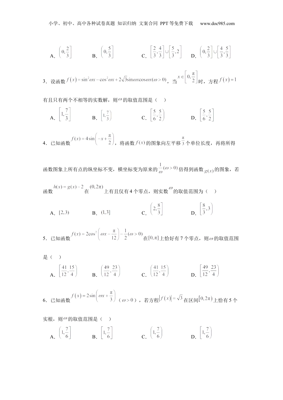 小学、初中、高中各种试卷真题知识归纳文案合同PPT等免费下载www.doc985.com专题突破卷07ω的值和取值范围问题题型一:根据函数零点个数求参数取值范围1.将函数的图象向右平移个单位长度后得到函数的图象,若在区间上单调递增,且在区间上有且仅有1个零点,则的取值范围为()A.B.C.D.2.已知函数在上无零点,则的取值范围为()小学、初中、高中各种试卷真题知识归纳文案合同PPT等免费下载www.doc985.comA.B.C.D.3.设函数,当时,方程有且只有两个不相等的实数解,则的取值范围是()A.B.C.D.4.已知函数,将函数的图象向左平移个单位长度,再将所得函数图象上所有点的纵坐标不变,横坐标变为原来的倍得到函数的图象,若函数在上有且仅有4个零点,则实数的取值范围为()A.B.C.D.5.已知函数在上恰好有7个零点,则的取值范围是()A.B.C.D.6.已知函数(),若方程在区间上恰有5个实根,则的取值范围是()A.B.C.D.小学、初中、高中各种试卷真题知识归纳文案合同PPT等免费下载www.doc985.com7.已知函数在有且仅有2个极值点,且在上单调递增,则的取值范围为()A.B.C.D.8.已知函数,若在区间有三个零点,则的取值范围是()A.B.C.D.9.若当时,函数与的图象有且仅有4个交点,则的取值范围是()A.B.C.D.10.已知函数在上有且仅有两个零点,则的取值范围是()A.B.C.D.题型二:根据正弦函数的对称性求参数范围11.已知函数在区间恰有6个零点,若,则的取值范围为()A.B.C.D.小学、初中、高中各种试卷真题知识归纳文案合同PPT等免费下载www.doc985.com12.设函数若恰有5个不同零点,则正实数的范围为()A.B.C.D.13.设函数有个不同零点,则正实数的范围为()A.B.C.D.14.已知函数在上有且只有5个零点,则实数的范围是()A.B.C.D.15.,函数在上单调递增,则的范围是()A.B.C.D.¿16.已知函数在区间上是增函数,且在区间上恰好取得一次最大值,则的范围是()小学、初中、高中各种试卷真题知识归纳文案合同PPT等免费下载www.doc985.comA.B.C.D.17.已知函数在是增函数,则的范围是()A.B.C.D.18.给出下列四个命题:①映射不一定是函数,但函数一定是其定义域到值域的映射;②函数的反函数是,则;③函数在上递减,则的范围为;④若a是第一象限的角,则也是第一象限的角.其中所有正确命题的序号是A.①③B.②③C.①④D.②④19.已知函数,则下述结论中错误的是()A.若在有且仅有个零点,则在有且仅有个极小值点B.若在有且仅有个零点,则在上单调递增C.若在有且仅有个零点,则的范围是D.若图像关于对称,且在单调,则的最大值为20.函数在内恰有两个最小值点,则ω的范围是()小学、初中、高中各种试卷真题知识归纳文案合同PPT等免费下载www.doc985.comA.B.C.D.题型三:根据余弦函数的对称性求参数范围21.若函数的图象在区间上只有一个对称中心,则的取范围为()A.B.C.D.22.函数在内存在最小值但无最大值,则的范围是()A.B.C.D.23.将函数的图象向右平移个单位长度,再将各点的横坐标变为原来的,得到函数的图象,若在上的值域为,则范围为()A.B.C.D.24.已知函数,则下列命题正确的有()A.当时,是的一条对称轴B.若,且,则小学、初中、高中各种试卷真题知识归纳文案合同PPT等免费下载www.doc985.comC.存在,使得的图象向左平移个单位得到的函数为偶函数D.若在上恰有5个零点,则的范围为25.已知函数,则()A.当时,的图象关于对称B.当时,在上的最大值为C.当为的一个零点时,的最小值为1D.当在上单调递减时,的最大值为126.已知函数,若对任意的实数m,在的值域均为,且在上单调递减,则ω的范围为.27.函数的图像是由函数(大于零)的图像向左平移个单位所得,若函数在范围内单调,则的范围是.28.已知“”表示小于的最大整数,例如.若恰好有四个解,那么的范围是.29.对于函数(其中):①若函数的一个对称中小学、初中、高中各种试卷真题知识归纳文案合同PPT等免费下载www.doc985.com心到与它最近一条对称轴的距离为,则;②若函数在上单调递增,则...