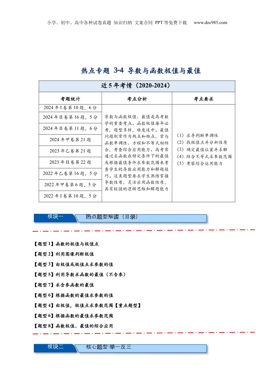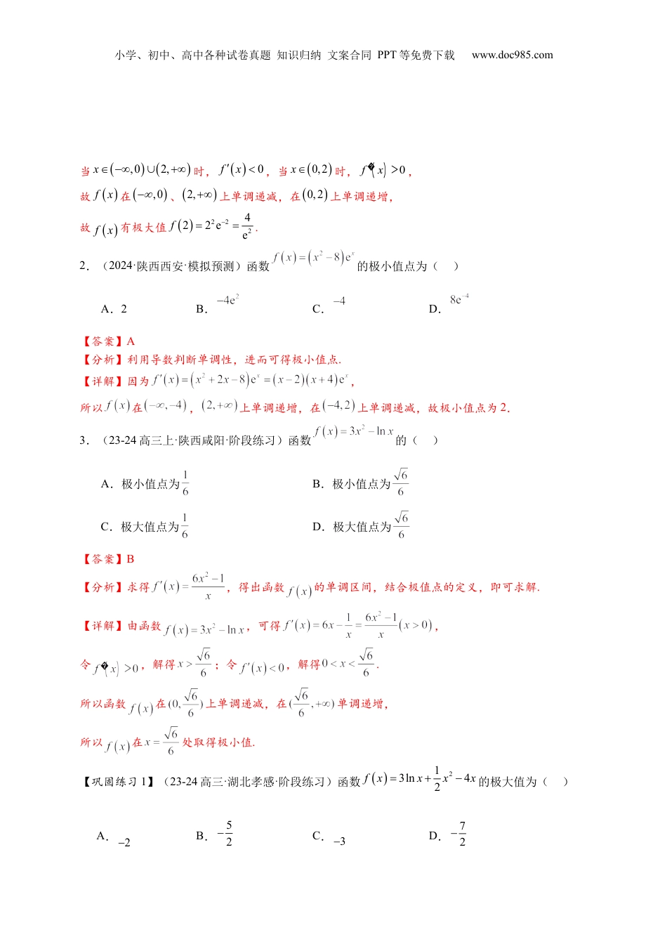 小学、初中、高中各种试卷真题知识归纳文案合同PPT等免费下载www.doc985.com热点专题3-4导数与函数极值与最值近5年考情(2020-2024)考题统计考点分析考点要求2024年I卷第10题,6分导数与函数极值、最值是高考数学的重要考点。函数极值每年必考,题型多样,难度适中。最值问题则常作为热点和难点,常与函数单调性、方程和不等式相结合,考查综合应用能力。高考常通过求函数在特定条件下的最值或根据最值条件求参数范围来考查学生的导数应用能力和解题技巧。这类题型要求学生熟练掌握导数性质,灵活应用函数性质,具有较强的逻辑思维和解题能力(1)求导判断单调性(2)找极值点并分析性质(3)确定最值位置并求解(4)结合不等式求参数范围(5)考察综合运用能力2024年II卷第16题,5分2024年II卷第11题,6分2024年甲卷第21题2023年乙卷第21题2023年II卷第22题2022年乙卷第16题,5分2022年甲卷第6题,5分2022年I卷第10题,5分【题型1】函数的极值与极值点【题型2】利用图像判断极值【题型3】由极值或极值点求参数的值【题型5】利用导数求函数的最值(不含参)【题型7】求含参函数的最值【题型6】根据函数的最值求参数的值【题型4】由极值,极值点求参数范围【重点题型】【题型6】根据函数的最值求参数范围【题型8】函数极值、最值的综合应用点型解(目)热题读录模一块核心型题·一反三举模二块小学、初中、高中各种试卷真题知识归纳文案合同PPT等免费下载www.doc985.com【题型1】函数的极值与极值点1.极值点与极值的概念极值与单调性一样,都是函数的局部性质(1)极小值点与极小值如图,函数y=f(x)在点x=a的函数值f(a)比它在点x=a附近其他点的函数值都小,f′(a)=0;而且在点x=a附近的左侧f′(x)<0,右侧f′(x)>0,则把a叫做函数y=f(x)的极小值点,f(a)叫做函数y=f(x)的极小值.(2)极大值点与极大值如图,函数y=f(x)在点x=b的函数值f(b)比它在点x=b附近其他点的函数值都大,f′(b)=0;而且在点x=b的左侧f′(x)>0,右侧f′(x)<0,则把b叫做函数y=f(x)的极大值点,f(b)叫做函数y=f(x)的极大值.极大值点、极小值点统称为极值点,极大值和极小值统称为极值.2.求函数y=f(x)的极值的方法解方程f′(x)=0,当f′(x0)=0时:(1)如果在x0附近的左侧f′(x)>0,右侧f′(x)<0,那么f(x0)是极大值;(2)如果在x0附近的左侧f′(x)<0,右侧f′(x)>0,那么f(x0)是极小值.1.(2024·辽宁鞍山·二模)2exfxx的极大值为.【答案】24e【解析】222ee2e2exxxxfxxxxxxx,小学、初中、高中各种试卷真题知识归纳文案合同PPT等免费下载www.doc985.com当,02,x时,0fx,当0,2x时,()0fx�>,故fx在,0、2,上单调递减,在0,2上单调递增,故fx有极大值222e22e4f.2.(2024·陕西西安·模拟预测)函数的极小值点为()A.2B.C.D.【答案】A【分析】利用导数判断单调性,进而可得极小值点.【详解】因为,所以在,上单调递增,在上单调递减,故极小值点为2.3.(23-24高三上·陕西咸阳·阶段练习)函数的()A.极小值点为B.极小值点为C.极大值点为D.极大值点为【答案】B【分析】求得,得出函数的单调区间,结合极值点的定义,即可求解.【详解】由函数,可得,令,解得;令,解得.所以函数在上单调递减,在单调递增,所以在处取得极小值.【巩固练习1】(23-24高三·湖北孝感·阶段练习)函数213ln42fxxxx的极大值为()A.2B.52C.3D.72小学、初中、高中各种试卷真题知识归纳文案合同PPT等免费下载www.doc985.com【答案】D【分析】求出函数的单调性,即可求出函数的极大值.【详解】函数213ln42fxxxx的定义域为0,,又23143xxxxfxxx,令0fx,则1x或3x,所以当01x或3x时()0fx�>,当13x时0fx,所以fx在0,1,3,上单调递增,在1,3上单调递减,所以fx的极大值为1710422f.【巩固练习2】(2024高三下·全国·专题练习)已知...