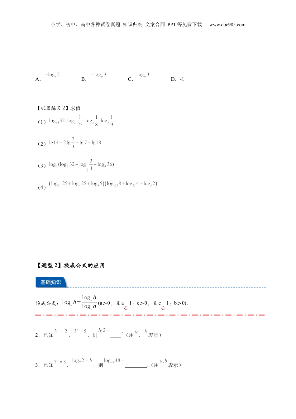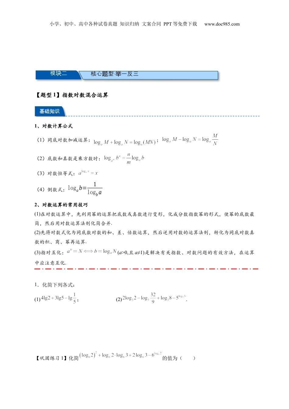 小学、初中、高中各种试卷真题知识归纳文案合同PPT等免费下载www.doc985.com热点专题2-5对数与对数函数近5年考情(2020-2024)考题统计考点分析考点要求2024年II卷第8题,5分从近四年的高考情况来看,对数运算与对数函数是高考的一个重点也是一个难点,常与二次函数、幂函数、指数函数、三角函数综合,考查数值大小的比较和函数方程问题.在利用对数函数的图像与性质应用上,体现了逻辑推理与数学运算素养.(1)对数的概念及运算性质(2)对数函数的图象(3)对数函数的性质2024年北京卷第7题,4分2024年天津卷第5题,5分2023年北京卷第11题,5分2023年I卷第10题,5分2022年I卷I卷第7题,5分2022年浙江卷第7题,5分【题型1】指数对数混合运算【题型2】换底公式的应用【题型3】对数函数的图象及应用【题型4】对数函数过定点问题【题型5】指对幂比较大小【题型6】解对数方程或不等式【题型7】对数函数模型的实际应用【题型8】对数型复合函数的单调问题【题型9】对数型复合函数的最值与值域问题【题型10】对数型复合函数的奇偶性问题【题型11】反函数问题【题型12】对数函数的综合问题点型解(目)热题读录模一块小学、初中、高中各种试卷真题知识归纳文案合同PPT等免费下载www.doc985.com【题型1】指数对数混合运算1、对数计算公式(1)同底对数加减运算:;(2)底数和真数是乘方数时:(3)对数恒等式:(4)倒数式:logab=1logba2、对数运算的常用技巧(1)在对数运算中,先利用幂的运算把底数或真数进行变形,化成分数指数幂的形式,使幂的底数最简,然后用对数运算法则化简合并.(2)先将对数式化为同底数对数的和、差、倍数运算,然后逆用对数的运算法则,转化为同底对数真数的积、商、幂再运算.(3)指对互化:(a>0,且a≠1)是解决有关指数、对数问题的有效方法,在运算中应注意互化.1.化简下列各式:(1);(2).【巩固练习1】化简的值为()核心型题·一反三举模二块小学、初中、高中各种试卷真题知识归纳文案合同PPT等免费下载www.doc985.comA.B.C.D.-1【巩固练习2】求值(1)(2)(3)(4)【题型2】换底公式的应用换底公式:logab=logcblogca(a>0,且a¿1;c>0,且c¿1;b>0).2.已知,,则(用,表示)3.已知,,则.(用表示)小学、初中、高中各种试卷真题知识归纳文案合同PPT等免费下载www.doc985.com4.已知,则.【巩固练习1】设,,(1)用含,的式子表示,形式为___________.(2)用含,的式子表示,形式为___________.【巩固练习2】设,求的值.【题型3】对数函数的图象及应用对数函数的图象(底大图低)a>10<a<1图象性质定义域(0,+∞)值域R过定点过定点(1,0),即x=1时,y=0函数值的变化当0<x<1时,y<0;当x>1时,y>0当0<x<1时,y>0;当x>1时,y<0单调性是(0,+∞)上的增函数是(0,+∞)上的减函数方法技巧:对于有关对数型函数的图象问题,一般是从最基本的对数函数的图象入手,通过伸缩、小学、初中、高中各种试卷真题知识归纳文案合同PPT等免费下载www.doc985.com平移、对称等变换得到,当时,对数函数的图像呈上升趋势;当时,对数函数的图像呈下降趋势.5.已知函数①y=logax;②y=logbx;③y=logcx;④y=logdx的大致图象如图所示,则下列不等关系正确的是()A.a+c<b+aB.a+d<b+cC.b+c<a+dD.b+d<a+c6.函数的图象是()A.B.C.D.7.已知函数f(x)=ln(x+a)的图象不经过第四象限,则a的取值范围是()A.(0,1)B.(0,)C.(0,1]D.[1,+∞)【巩固练习1】(多选题)(2024·河南信阳·模拟预测)函数的大致图象不可能为()A.B.小学、初中、高中各种试卷真题知识归纳文案合同PPT等免费下载www.doc985.comC.D.【巩固练习2】已知函数(且,,为常数)的图象如图,则下列结论正确的是()A.,B.,C.,D.,【巩固练习3】已知函数,若且,则的取值范围为.【题型4】对数函数过定点问题对数函数过定点(1,0),即x=1时,y=0;函数过定点8.函数(且)的图象必经过一个定点,则这个定点的坐标是()A.B.C.D.9.(2024·安徽安庆·模拟预测)已知函数恒过定点,则小学、初中、高中各种试卷真题知识归纳文案合同PPT...