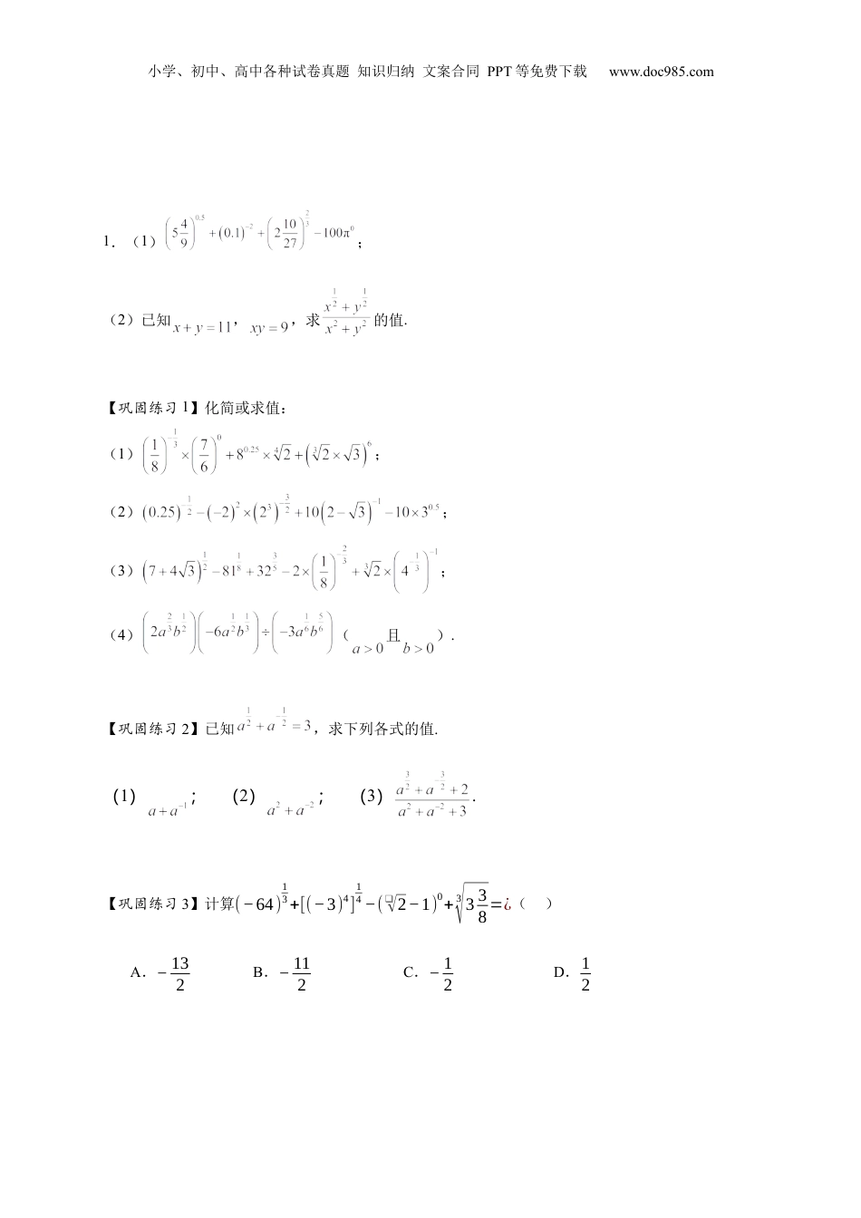 小学、初中、高中各种试卷真题知识归纳文案合同PPT等免费下载www.doc985.com热点专题2-4指数与指数函数近3年考情考题示例考点分析关联考点2024年新高考I卷,第6题,5分从近五年的高考情况来看,指数运算与指数函数是高考的一个重点也是一个基本点,常与幂函数、二次函数、对数函数、三角函数综合,考查数值大小的比较和函数方程问题.在利用指数函数的图像与性质应用上,体现了逻辑推理与数学运算素养.(1)指数幂的运算性质(2)指数函数的图像与性质2024年北京卷,第7题,5分2023年新高考I卷第4题,5分2023年乙卷第4题,5分2022年甲卷第12题,5分2020年新高考II卷第11题,5分【题型1】指数幂的运算【方法技巧】(1)灵活运用指数的运算性质进行指数运算,根式形式需要化为分数指数幂形式去求解.(2)运算的最终结果不能同时含有根号和分数指数,也不能既有负指数又有分母.指数与根式的概念1、n次方根的定义(1)定义:一般地,如果,那么x叫做a的n次方根,其中,且(2)偶次方根的被开方数要为非负数2、根式(1)定义:式子叫做根式,这里n叫做根指数,a叫做被开方数.(2)性质:(,且)点型解(目)热题读录模一块小学、初中、高中各种试卷真题知识归纳文案合同PPT等免费下载www.doc985.coma;3、分数指数幂的意义(1)分数指数幂的意义正分数指数幂:规定:负分数指数幂:规定:(3)性质:0的正分数指数幂等于0,0的负分数指数幂没有意义4、分数指数幂的注意事项:(1)分数指数幂是指数概念的又一推广,分数指数幂不可理解为个相乘,它是根式的一种新的写法.在这样的规定下,根式与分数指数幂是表示相同意义的量,只是形式不同而已.(2)把根式化成分数指数幂的形式时,不要轻易对进行约分.(3)在保证相应的根式有意义的前提下,负数也存在分数指数幂,如有意义,但就没有意义.5、无理数指数幂一般地,无理数指数幂(,为无理数)是一个确定的实数.有理数指数幂的运算性质同样适用于无理数指数幂.【注意】(1)对于无理数指数幂,我们只需要了解两点:①它是一个确定的实数;②它是有理数指数幂无限逼近的结果.(2)定义了无理数指数幂之后,幂的指数就由原来的有理数范围扩充到了实数范围.6、实数指数幂的运算性质①.②.③.小学、初中、高中各种试卷真题知识归纳文案合同PPT等免费下载www.doc985.com1.(1);(2)已知,,求的值.【巩固练习1】化简或求值:(1);(2);(3);(4)(且).【巩固练习2】已知,求下列各式的值.(1);(2);(3).【巩固练习3】计算(−64)13+[(−3)4]14−(❑√2−1)0+3√338=¿()A.−132B.−112C.−12D.12小学、初中、高中各种试卷真题知识归纳文案合同PPT等免费下载www.doc985.com【题型2】指数函数过定点问题指数函数图象都经过点,恒过定点.2.已知函数(且)的图象恒过定点,则点的坐标为.【巩固练习1】函数(且)的图象恒过定点,则等于.【巩固练习2】(2024·山东济宁·一模)已知函数且的图象过定点A,且点A在直线上,则的最小值是.【题型3】求指数函数的解析式图象a1xy(1,a)1Oa1xy(1,a)1O①定义域,值域小学、初中、高中各种试卷真题知识归纳文案合同PPT等免费下载www.doc985.com性质②,即时,,图象都经过点③,即时,等于底数④在定义域上是单调减函数在定义域上是单调增函数⑤时,;时,时,;时,⑥既不是奇函数,也不是偶函数3.已知是指数函数,若,则___________.【巩固练习1】已知函数,若为偶函数,且在是增函数,求的解析式【巩固练习2】已知函数是奇函数,且当时,,那么当时,的解析式是()A.B.C.D.【题型4】指数函数的图象及应用对于有关指数型函数的图象问题,一般是从最基本的指数函数的图象入手,通过伸缩、平移、对称等变换得到,当时,指数函数的图像呈上升趋势;当时,指数函数的图像呈下降趋势.4.(2024·黑龙江·二模)已知函数的图象经过原点,且无限接近直线,但又不与该直线相交,则()A.B.C.D.小学、初中、高中各种试卷真题知识归纳文案合同PPT等免费下载www.doc985.com5.函数①;②;③;④的图象如图所示,a,b,c,d分别是下列四个数:,,,中的一个,则a,b,c...