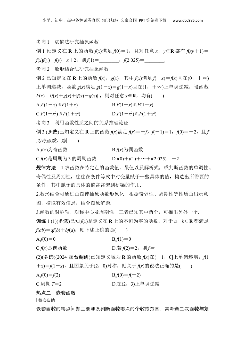 小学、初中、高中各种试卷真题知识归纳文案合同PPT等免费下载www.doc985.com微专题3抽象函数与嵌套函数高考定位1.以选择题、填空题的形式考查抽象函数性质的应用,难度中档偏上;2.以选择题、填空题的形式考查嵌套函数零点的个数或由零点的个数求参数等,难度中档或偏上.【真题体验】1.(2020·新高考Ⅰ卷)若定义在R的奇函数f(x)在(-∞,0)单调递减,且f(2)=0,则满足xf(x-1)≥0的x的取值范围是()A.[-1,1]∪[3,+∞)B.[-3,-1]∪[0,1]C.[-1,0]∪[1,+∞)D.[-1,0]∪[1,3]2.(多选)(2022·新高考Ⅰ卷)已知函数f(x)及其导函数f′(x)的定义域均为R,记g(x)=f′(x).若f,g(2+x)均为偶函数,则()A.f(0)=0B.g=0C.f(-1)=f(4)D.g(-1)=g(2)3.(多选)(2023·新高考Ⅰ卷)已知函数f(x)的定义域为R,f(xy)=y2f(x)+x2f(y),则()A.f(0)=0B.f(1)=0C.f(x)是偶函数D.x=0为f(x)的极小值点4.(2022·全乙卷国)已知函数f(x),g(x)的定义域均为R,且f(x)+g(2-x)=5,g(x)-f(x-4)=7.若y=g(x)的图象关于直线x=2对称,g(2)=4,则∑f(k)=()A.-21B.-22C.-23D.-24【热点突破】热点一抽象函数究抽象函性的方法研数质(1)用法究抽象函赋值研数.(2)利用形合法究抽象函数结研数.(3)利用函性之的系推理究抽象函数质间关论证研数.小学、初中、高中各种试卷真题知识归纳文案合同PPT等免费下载www.doc985.com考向1赋值法研究抽象函数例1设定义在R上的函数f(x)满足f(0)=1,且对任意x,y∈R都有f(xy+1)=f(x)f(y)-f(y)-x+2,则f(1)=________;f(2025)=________.考向2数形结合法研究抽象函数例2已知定义在R上的函数f(x),g(x),其中f(x)满足f(-x)=f(x)且在(0,+∞)上单调递减,函数g(x)满足g(1-x)=g(1+x)且在(1,+∞)上单调递减,设函数F(x)=[f(x)+g(x)+|f(x)-g(x)|],则对任意x∈R,均有()A.F(1-x)≥F(1+x)B.F(1-x)≤F(1+x)C.F(1-x2)≥F(1+x2)D.F(1-x2)≤F(1+x2)考向3利用函数性质之间的关系推理论证例3(多选)已知定义在R上的函数f(x)满足f(x)=-f,f(-1)=1,f(0)=-2,且f为奇函数,则()A.f(x)为奇函数B.f(x)为偶函数C.f(x)是周期为3的周期函数D.f(0)+f(1)+…+f(2025)=-2规律方法1.求函数在特定点的函数值、最值以及解析式,或判断函数的单调性、奇偶性及周期性,往往在条件等式中对变量赋予一些具体的值,构造出所需要的条件,其中赋予的具体的值常常起到桥梁的作用.2.数形结合可通过画图使抽象函数形象化,根据奇偶性、周期性等性质画出示意图,摘取有效信息,结合图象解题.3.函数的对称轴、对称中心及周期性,三者已知其中两个,可推出另外一个.训练1(1)(多选)已知f(x)是定义在R上的不恒为零的函数,对于a,b∈R都满足f(ab)=af(b)+bf(a),则下述正确的是()A.f(0)=0B.f(1)=0C.f(x)是偶函数D.若f(2)=2,则f=(2)(多选)(2024·烟台调研)已知定义域为R的函数f(x)在(-1,0]上单调递增,f(1+x)=f(1-x),且图象关于(2,0)对称,则关于f(x)的说法正确的是()A.f(0)=f(2)B.f(0)=f(-2)C.周期T=2D.在(2,3)上单调递减热点二嵌套函数嵌套函的零点主要涉及判函零点的或范,常考二次函数问题断数个数围查数与复小学、初中、高中各种试卷真题知识归纳文案合同PPT等免费下载www.doc985.com合函相零点,函的象性交数关与数图质汇.于嵌套函的零点,通常先对数“元换解套”,合函拆解相的函,借助函的象、性求解将复数为两个对简单数数图质.例4已知函数f(x)=则函数g(x)=2[f(x)]2-3f(x)-2的零点个数为()A.2B.3C.4D.5规律方法1.破解此类问题的主要步骤第一步:换元解套,将嵌套函数的零点问题通过换元转化为函数t=g(x)与y=f(t)的零点问题.第二步:依次求解:令f(t)=0求t,代入t=g(x)求出x的值或判断图象交点个数.2.含参数的嵌套函数方程还应注意让参数的取值“动起来”,结合性质、图象抓临界位置,确定参数取值范围.训练2(2024·州荆调研)设函数f(x)=若关于x的方程[f(x)]2-(a+2)f(x)+3=0恰好有六个不同的实数解,则实数a的取值范围为()A.(-2-2,2-2)B.C.D.(2-2,+∞)【精准强化练】一、单选题1.(2024·重庆调研)已知定义在R上的函数...