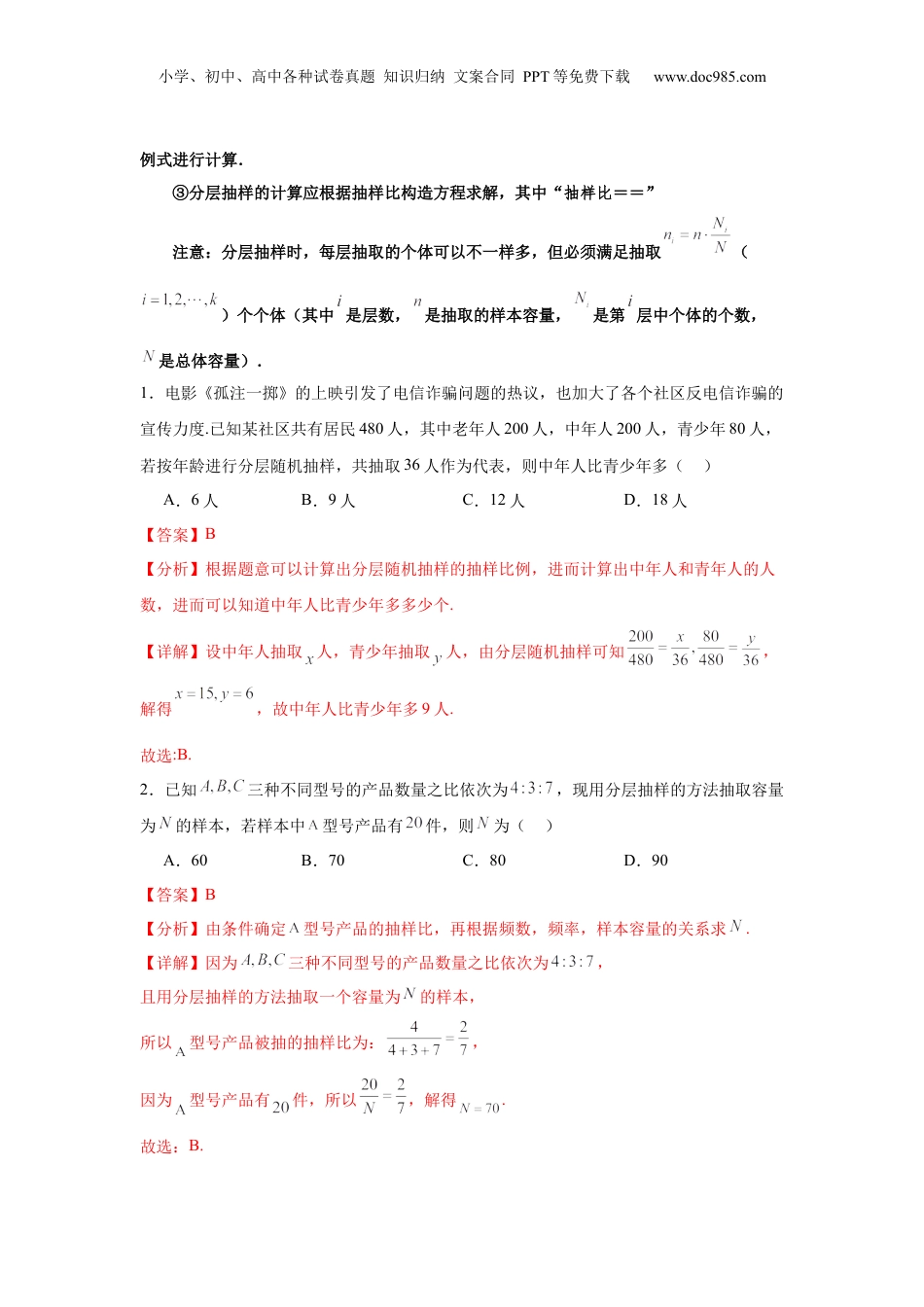 小学、初中、高中各种试卷真题知识归纳文案合同PPT等免费下载www.doc985.com考点巩固卷21统计与统计案例(七大考点)考点1简单随机抽样1、抽样调查(1)总体:统计中所考察对象的某一数值指标的全体构成的集合称为总体.(2)个体:构成总体的每一个元素叫做个体.(3)样本:从总体中抽取若干个个体进行考察,这若干个个体所构成的集合叫做总体的一个样本,样本中个体的数目叫做样本容量.2、简单随机抽样(1)定义一般地,设一个总体含有个个体,从中逐个不放回地抽取个个体作为样本(小学、初中、高中各种试卷真题知识归纳文案合同PPT等免费下载www.doc985.com),如果每次抽取时总体内的各个个体被抽到的机会都相等,就把这种抽样方法叫做简单随机抽样.这样抽取的样本,叫做简单随机样本.(2)两种常用的简单随机抽样方法①抽签法:一般地,抽签法就是把总体中的个个体编号,把号码写在号签上,将号签放在一个容器中,搅拌均匀后,每次从中抽取一个号签,连续抽取次,就得到一个容量为的样本.②随机数法:即利用随机数表、随机数骰子或计算机产生的随机数进行抽样.这里仅介绍随机数表法.随机数表由数字,,,…,组成,并且每个数字在表中各个位置出现的机会都是一样的.注意:为了保证所选数字的随机性,需在查看随机数表前就指出开始数字的横、纵位置.(3)抽签法与随机数法的适用情况抽签法适用于总体中个体数较少的情况,随机数法适用于总体中个体数较多的情况,但是当总体容量很大时,需要的样本容量也很大时,利用随机数法抽取样本仍不方便.(4)简单随机抽样的特征①有限性:简单随机抽样要求被抽取的样本的总体个数是有限的,便于通过样本对总体进行分析.②逐一性:简单随机抽样是从总体中逐个地进行抽取,便于实践中操作.③不放回性:简单随机抽样是一种不放回抽样,便于进行有关的分析和计算.④等可能性:简单单随机抽样中各个个体被抽到的机会都相等,从而保证了抽样方法的公平.只有四个特点都满足的抽样才是简单随机抽样.3、分层抽样(1)定义一般地,在抽样时,将总体分成互不交叉的层,然后按照一定的比例,从各层独立地抽取一定数量的个体,将各层取出的个体合在一起作为样本,这种抽样方法叫做分层抽样.分层抽样适用于已知总体是由差异明显的几部分组成的.(2)分层抽样问题类型及解题思路①求某层应抽个体数量:按该层所占总体的比例计算.②已知某层个体数量,求总体容量或反之求解:根据分层抽样就是按比例抽样,列比小学、初中、高中各种试卷真题知识归纳文案合同PPT等免费下载www.doc985.com例式进行计算.③分层抽样的计算应根据抽样比构造方程求解,其中“抽样比==”注意:分层抽样时,每层抽取的个体可以不一样多,但必须满足抽取()个个体(其中是层数,是抽取的样本容量,是第层中个体的个数,是总体容量).1.电影《孤注一掷》的上映引发了电信诈骗问题的热议,也加大了各个社区反电信诈骗的宣传力度.已知某社区共有居民480人,其中老年人200人,中年人200人,青少年80人,若按年龄进行分层随机抽样,共抽取36人作为代表,则中年人比青少年多()A.6人B.9人C.12人D.18人【答案】B【分析】根据题意可以计算出分层随机抽样的抽样比例,进而计算出中年人和青年人的人数,进而可以知道中年人比青少年多多少个.【详解】设中年人抽取人,青少年抽取人,由分层随机抽样可知,解得,故中年人比青少年多9人.故选:B.2.已知三种不同型号的产品数量之比依次为,现用分层抽样的方法抽取容量为的样本,若样本中型号产品有件,则为()A.60B.70C.80D.90【答案】B【分析】由条件确定型号产品的抽样比,再根据频数,频率,样本容量的关系求.【详解】因为三种不同型号的产品数量之比依次为,且用分层抽样的方法抽取一个容量为的样本,所以型号产品被抽的抽样比为:,因为型号产品有件,所以,解得.故选:B.小学、初中、高中各种试卷真题知识归纳文案合同PPT等免费下载www.doc985.com3.国内某优秀新能源电池制造企业在锂电池单位能量密度技术上取得了重大突破,该制造企业内的某车间有两条生产线,分别生产高能量密度锂电池和低能量密度锂...