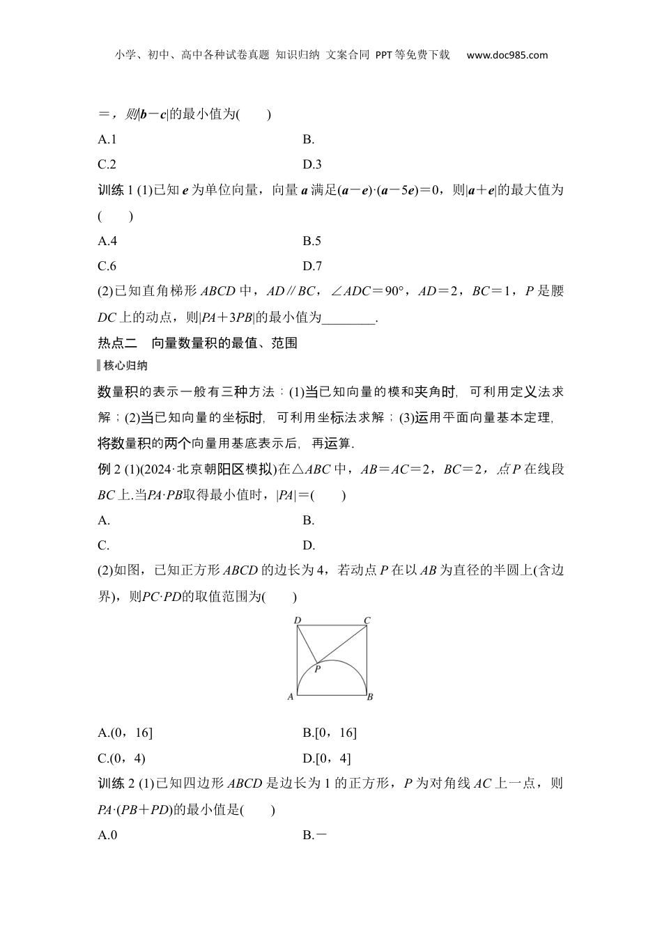 小学、初中、高中各种试卷真题知识归纳文案合同PPT等免费下载www.doc985.com微专题17与平面向量有关的最值、范围问题高考定位1.与平面向量有关的最值问题在高考中经常出现,多以小题形式考查,难度中档;2.主要考查向量模、夹角、数量积、系数的最值或范围.【真题体验】1.(2017·全国Ⅲ卷)在矩形ABCD中,AB=1,AD=2,动点P在以点C为圆心且与BD相切的圆上.若AP=λAB+μAD,则λ+μ的最大值为()A.3B.2C.D.22.(2023·全乙卷国)已知⊙O的半径为1,直线PA与⊙O相切于点A,直线PB与⊙O交于B,C两点,D为BC的中点,若|PO|=,则PA·PD的最大值为()A.B.C.1+D.2+3.(2024·天津卷)在边长为1的正方形ABCD中,E为线段CD的三等分点,CE=DE,BE=λBA+μBC,则λ+μ=________;F为线段BE上的动点,G为AF的中点,则AF·DG的最小值为________.4.(2022·浙江卷)设点P在单位圆的内接正八边形A1A2…A8的边A1A2上,则PA+PA+…+PA的取值范围是________.【热点突破】热点一向量模的最值、范围向量的模指的是有向段的度,可以利用坐表示,也可以借助线长标“形”,合结平面几何知求解识.如果直接求模不易,可以向量用基底向量表示再求将.例1(1)已知单位向量a,b满足|a-b|+2a·b=0,则|ta+b|(t∈R)的最小值为()A.B.C.D.(2)(2024·沙长质检)已知a,b,c都是平面向量,且|a|=|4a-b|=1,若〈a,c〉小学、初中、高中各种试卷真题知识归纳文案合同PPT等免费下载www.doc985.com=,则|b-c|的最小值为()A.1B.C.2D.3训练1(1)已知e为单位向量,向量a满足(a-e)·(a-5e)=0,则|a+e|的最大值为()A.4B.5C.6D.7(2)已知直角梯形ABCD中,AD∥BC,∠ADC=90°,AD=2,BC=1,P是腰DC上的动点,则|PA+3PB|的最小值为________.热点二向量数量积的最值、范围量的表示一般有三方法:数积种(1)已知向量的模和角,可利用定法求当夹时义解;(2)已知向量的坐,可利用坐法求解;当标时标(3)用平面向量基本定理,运量的向量用基底表示后,再算将数积两个运.例2(1)(2024·北京朝模阳区拟)在△ABC中,AB=AC=2,BC=2,点P在线段BC上.当PA·PB取得最小值时,|PA|=()A.B.C.D.(2)如图,已知正方形ABCD的边长为4,若动点P在以AB为直径的半圆上(含边界),则PC·PD的取值范围为()A.(0,16]B.[0,16]C.(0,4)D.[0,4]训练2(1)已知四边形ABCD是边长为1的正方形,P为对角线AC上一点,则PA·(PB+PD)的最小值是()A.0B.-小学、初中、高中各种试卷真题知识归纳文案合同PPT等免费下载www.doc985.comC.-D.-2(2)(2024·福州调研)在△ABC中,A=90°,AB=AC=4,点M为边AB的中点,点P在边BC上,则MP·CP的最小值为________.热点三向量夹角的最值、范围求向量角的取范、最,往往要角其某三角函用某量表夹值围值将夹与个数值个变示,化求函的最,要注意量之的系转为数值问题变间关.例3(2024·安模庆拟)已知点P(1,0),C(0,),O是坐标原点,点B满足|BC|=1,则OP与PB夹角的最大值为()A.B.C.D.训练3(2024·石家庄质检)在平行四边形ABCD中,+=,λ∈[,2],则cos∠BAD的取值范围是________.热点四向量系数的最值、范围此一般要利用共向量定理或平面向量基本定理找系之的系,然类问题线寻数间关后利用函的性或基本不等式求解数质.例4(1)如图,边长为2的等边三角形ABC的外接圆为圆O,P为圆O上任一点,若AP=xAB+yAC,则2x+2y的最大值为()A.B.2C.D.1(2)(2024·州兰调研)设点P在以A为圆心,1为半径的圆弧BC上运动(包含B,C两个端点),∠BAC=,且AP=xAB+yAC,则x+y的取值范围为________.小学、初中、高中各种试卷真题知识归纳文案合同PPT等免费下载www.doc985.com训练4(2024·模青岛拟)已知点P是△ABC所在平面内的一点,且AP=AB+tAC(t∈R),若点P在△ABC的内部(不包含边界),则实数t的取值范围是________.【精准强化练】一、单选题1.已知向量a=(,1),b=(1,),则|λa-b|(λ∈R)的最小值为()A.2B.C.1D.2.设向量OA=(1,-2),OB=(a,-1),OC=(-b,0),其中O为坐标原点,a>0,b>0,若A,B,C三点共线,则+的最小值为()A.4B.6C.8D.93.已知p:向量a=(-1,1)与b=(m,2)的夹角为锐角.若p是假命题,则实数m的取...