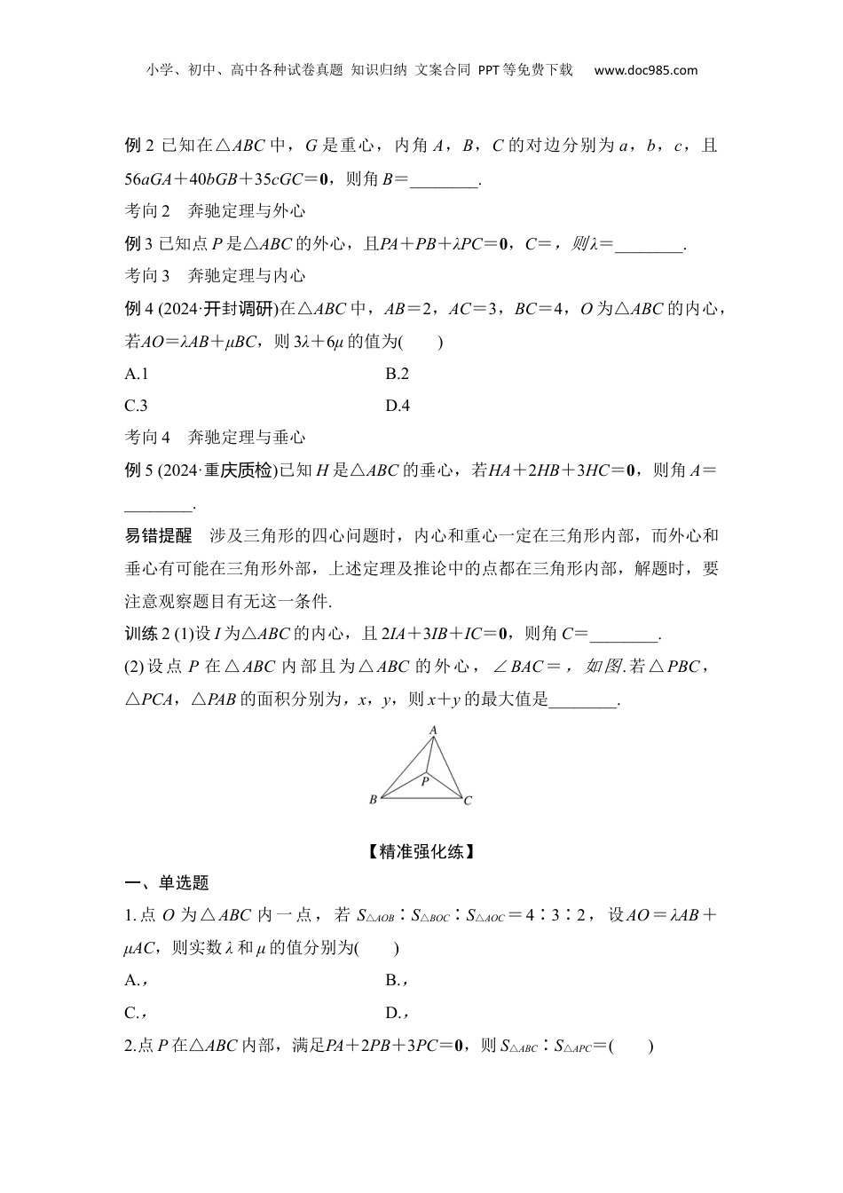 小学、初中、高中各种试卷真题知识归纳文案合同PPT等免费下载www.doc985.com奔驰定理与三角形四心【知识拓展】1.奔驰定理如图,已知P为△ABC内一点,则有S1·PA+S2·PB+S3·PC=0(其中S1,S2,S3分别为△PBC,△PAC,△PAB的面积).2.三角形四心的向量表示及结论(利用奔驰定理自行完成证明)【类型突破】类型一利用奔驰定理解决与三角形面积比有关的问题例1(1)已知O是△ABC内部一点,满足OA+2OB+mOC=0,且=,则实数m=()A.2B.3C.4D.5(2)已知点A,B,C,P在同一平面内,PQ=PA,QR=QB,RP=RC,则S△ABC∶S△PBC=()A.14∶3B.19∶4C.24∶5D.29∶6训练1设O在△ABC的内部,D为AB的中点,且OA+OB+2OC=0,则△ABC的面积与△AOC的面积的比值为________.类型二奔驰定理和三角形的四心(四心在三角形内部)考向1奔驰定理与重心小学、初中、高中各种试卷真题知识归纳文案合同PPT等免费下载www.doc985.com例2已知在△ABC中,G是重心,内角A,B,C的对边分别为a,b,c,且56aGA+40bGB+35cGC=0,则角B=________.考向2奔驰定理与外心例3已知点P是△ABC的外心,且PA+PB+λPC=0,C=,则λ=________.考向3奔驰定理与内心例4(2024·封开调研)在△ABC中,AB=2,AC=3,BC=4,O为△ABC的内心,若AO=λAB+μBC,则3λ+6μ的值为()A.1B.2C.3D.4考向4奔驰定理与垂心例5(2024·重庆质检)已知H是△ABC的垂心,若HA+2HB+3HC=0,则角A=________.易错提醒涉及三角形的四心问题时,内心和重心一定在三角形内部,而外心和垂心有可能在三角形外部,上述定理及推论中的点都在三角形内部,解题时,要注意观察题目有无这一条件.训练2(1)设I为△ABC的内心,且2IA+3IB+IC=0,则角C=________.(2)设点P在△ABC内部且为△ABC的外心,∠BAC=,如图.若△PBC,△PCA,△PAB的面积分别为,x,y,则x+y的最大值是________.【精准强化练】一、单选题1.点O为△ABC内一点,若S△AOB∶S△BOC∶S△AOC=4∶3∶2,设AO=λAB+μAC,则实数λ和μ的值分别为()A.,B.,C.,D.,2.点P在△ABC内部,满足PA+2PB+3PC=0,则S△ABC∶S△APC=()小学、初中、高中各种试卷真题知识归纳文案合同PPT等免费下载www.doc985.comA.2∶1B.3∶2C.3∶1D.5∶33.已知O是△ABC内一点,OA+OB+OC=0,AB·AC=2且∠BAC=60°,则△OBC的面积为()A.B.C.D.4.△ABC内一点O满足关系式S△OBC·OA+S△OAC·OB+S△OAB·OC=0,即称为经典的“奔驰定理”,若△ABC的三边为a,b,c,现有a·OA+b·OB+c·OC=0,则O为△ABC的()A.外心B.内心C.重心D.垂心5.如图,已知O是△ABC的垂心,且OA+2OB+3OC=0,则tan∠BAC∶tan∠ABC∶tan∠ACB等于()A.1∶2∶3B.1∶2∶4C.2∶3∶4D.2∶3∶6二、多选题6.如图,设P,Q为△ABC内的两点,且AP=AB+AC,AQ=AB+AC,则()A.=B.=C.=D.=7.已知O是△ABC内一点,△BOC,△AOC,△AOB的面积分别为S△BOC,S△AOC,S△AOB,则S△BOC·OA+S△AOC·OB+S△AOB·OC=0,∠BAC,∠ABC,∠ACB分别是△ABC的三个内角,以下命题正确的有()小学、初中、高中各种试卷真题知识归纳文案合同PPT等免费下载www.doc985.comA.若2OA+3OB+4OC=0,则S△BOC∶S△AOC∶SAOB=4∶3∶2B.若|OA|=|OB|=2,∠AOB=,且2OA+3OB+4OC=0,则S△ABC=C.若OA·OB=OB·OC=OC·OA,则O为△ABC的垂心D.若O为△ABC的内心,且5OA+12OB+13OC=0,则∠ACB=三、填空题8.△ABC的内切圆圆心为O,半径为2,且S△ABC=14,2OA+2OB+3OC=0,则△ABC的外接圆面积为________.9.(2024·水丽调研)若△ABC内接于以O为圆心,以1为半径的圆,且3OA+4OB+5OC=0.则△ABC的面积为________.10.已知点P,Q在△ABC内,若PA+2PB+3PC=2QA+3QB+5QC=0,则=________.【解析版】1.奔驰定理如图,已知P为△ABC内一点,则有S1·PA+S2·PB+S3·PC=0(其中S1,S2,S3分别为△PBC,△PAC,△PAB的面积).证明:设∠APB=α,∠APC=β,|PA|=x,|PB|=y,|PC|=z.小学、初中、高中各种试卷真题知识归纳文案合同PPT等免费下载www.doc985.com根据三角形正弦定理面积公式得S1PA+S2PB+S3PC=yzsin[2π-(α+β)]·PA+xzsinβPB+xysinαPC...