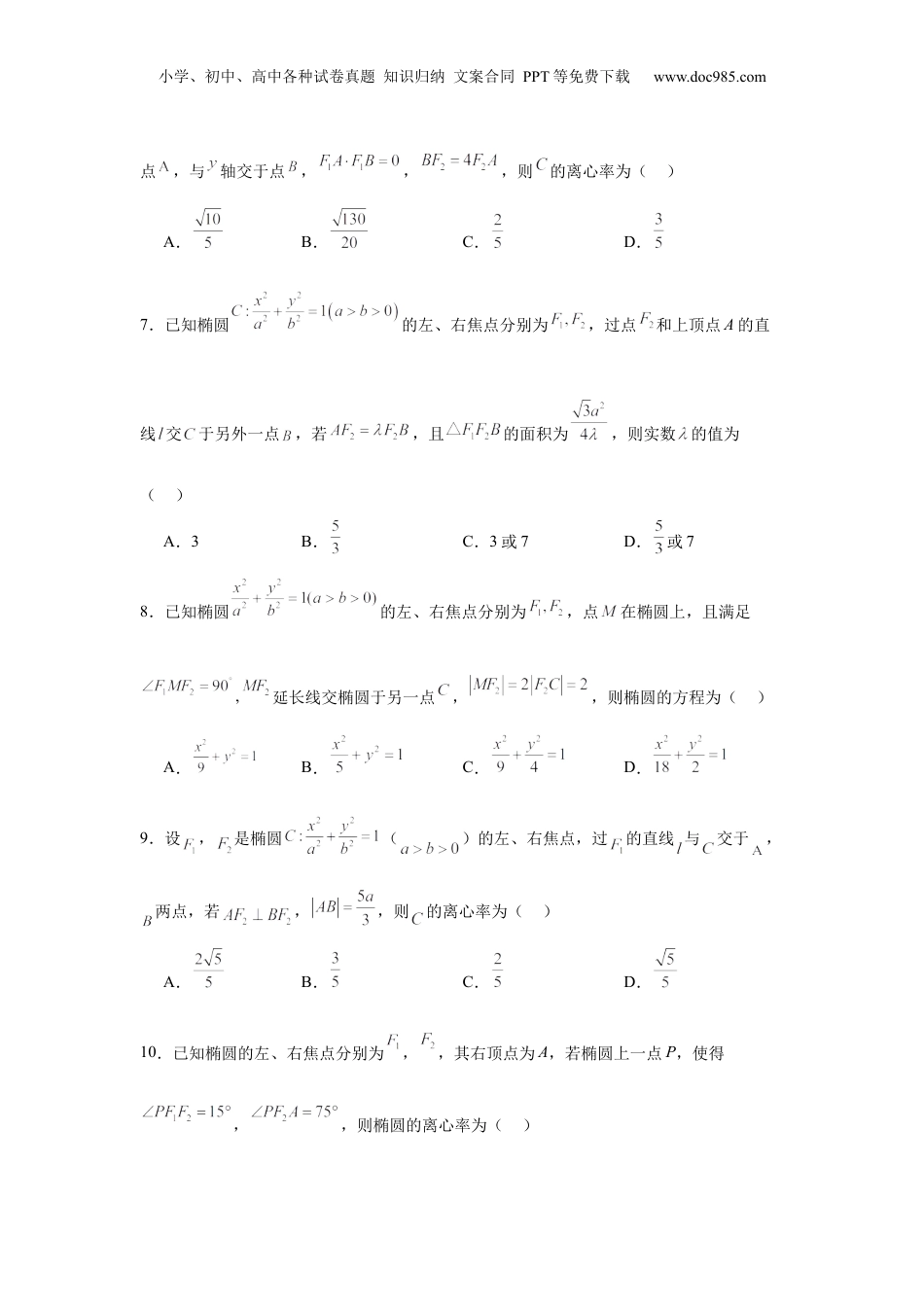 小学、初中、高中各种试卷真题知识归纳文案合同PPT等免费下载www.doc985.com考点巩固卷18椭圆方程及其性质(六大考点)考点01:椭圆的定义(妙用)结论1:椭圆第一定义结论2:标准方程由定义即可得到椭圆标准方程结论3:椭圆第二定义1.已知复数满足,则复数在复平面内所对应的点的轨迹为()A.线段B.圆C.椭圆D.双曲线小学、初中、高中各种试卷真题知识归纳文案合同PPT等免费下载www.doc985.com2.设O为坐标原点,,为椭圆C:的左,右两个焦点,点R在C上,点是线段上靠近点的三等分点,若,则()A.B.C.D.3.已知椭圆的左、右焦点分别为,,为椭圆上不与左右顶点重合的任意一点,,分别为ΔMF1F2的内心和重心,则⃗IG⋅⃗F1F2=¿()A.0B.1C.D.34.已知椭圆的左、右焦点分别为,若经过的弦满足,则椭圆的离心率是()A.B.C.D.5.已知椭圆的左、右焦点分别为,过点的射线分别与椭圆和圆相交于点,过点作,垂足为为坐标原点,则()A.B.C.2D.6.已知,分别是椭圆:的左、右焦点,过的直线与交于小学、初中、高中各种试卷真题知识归纳文案合同PPT等免费下载www.doc985.com点,与轴交于点,,,则的离心率为()A.B.C.D.7.已知椭圆的左、右焦点分别为,过点和上顶点A的直线交于另外一点,若,且的面积为,则实数的值为()A.3B.C.3或7D.或78.已知椭圆的左、右焦点分别为,点在椭圆上,且满足,延长线交椭圆于另一点,,则椭圆的方程为()A.B.C.D.9.设,是椭圆()的左、右焦点,过的直线与交于,两点,若,,则的离心率为()A.B.C.D.10.已知椭圆的左、右焦点分别为,,其右顶点为A,若椭圆上一点P,使得,,则椭圆的离心率为()小学、初中、高中各种试卷真题知识归纳文案合同PPT等免费下载www.doc985.comA.B.C.D.考点02:椭圆的焦点三角形问题椭圆焦点为,,P为椭圆上的点,,则;证明:设推论及应用:(注意:r为内切圆半径)①三角形(直角)等面积法:如上图,当时,有;,.②任意角度的三角形等面积法:.③最大面积、最大顶角考点:当点P位于椭圆的短轴顶点时,取最大值,根据等面积法,此时.小学、初中、高中各种试卷真题知识归纳文案合同PPT等免费下载www.doc985.com④直角顶点的处理技巧:当时,取得最大值,若,则,;同理可得,若,则,;若,则,.⑤直角顶点个数考点,当时,有四个点P存在;当时,有两个点P存在;当时,无点P存在。注意:与的区别,不一定为顶点.11.已知,分别是椭圆C:的左、右焦点,O为坐标原点,M,N为C上两个动点,且,面积的最大值为,过O作直线MN的垂线,垂足为H,则()A.B.C.1D.12.已知点分别是椭圆的左、右焦点,是上一点,的内切圆的圆心为,则椭圆的标准方程是()A.B.C.D.13.单位向量,向量满足,若存在两个均满足此条件的向量,使得,设,在起点为原点时,终点分别为.则的最大值()小学、初中、高中各种试卷真题知识归纳文案合同PPT等免费下载www.doc985.comA.B.C.4D.214.已知是椭圆的左、右焦点,点P在C上,且线段的中点在以为直径的圆上,则三角形的面积为()A.1B.C.D.815.已知椭圆()的两焦点分别为、.若椭圆上有一点P,使,则的面积为()A.B.C.D.16.已知椭圆的左、右焦点分别为,,点在椭圆上.若,则的面积为()A.2B.4C.8D.917.已知椭圆的两个焦点为,,点,为上关于坐标原点对称的两点,,的面积记为,且,则的离心率的取值范围为()A.B.C.D.小学、初中、高中各种试卷真题知识归纳文案合同PPT等免费下载www.doc985.com18.已知椭圆的左右焦点分别为、,过的直线与交于两点,若,则下列结论错误的是()A.B.的面积等于C.的离心率等于D.直线的斜率为19.已知椭圆的左,右焦点分别为,,点在椭圆上,为的内心,记,的面积分别为,且满足,则椭圆的离心率是()A.B.C.D.20.已知分别是椭圆的左、右焦点,在上,在轴上,,以为直径的圆过,且的面积为,则椭圆的标准方程为()A.B.C.D.考点03:椭圆的简单几何性质椭圆的简单几何性质离心率:椭圆焦距与长轴长之比:e=ca⇒e=√1−(ba)2.(0<e<1)小学、初中、高中各种试卷真题知识归纳...