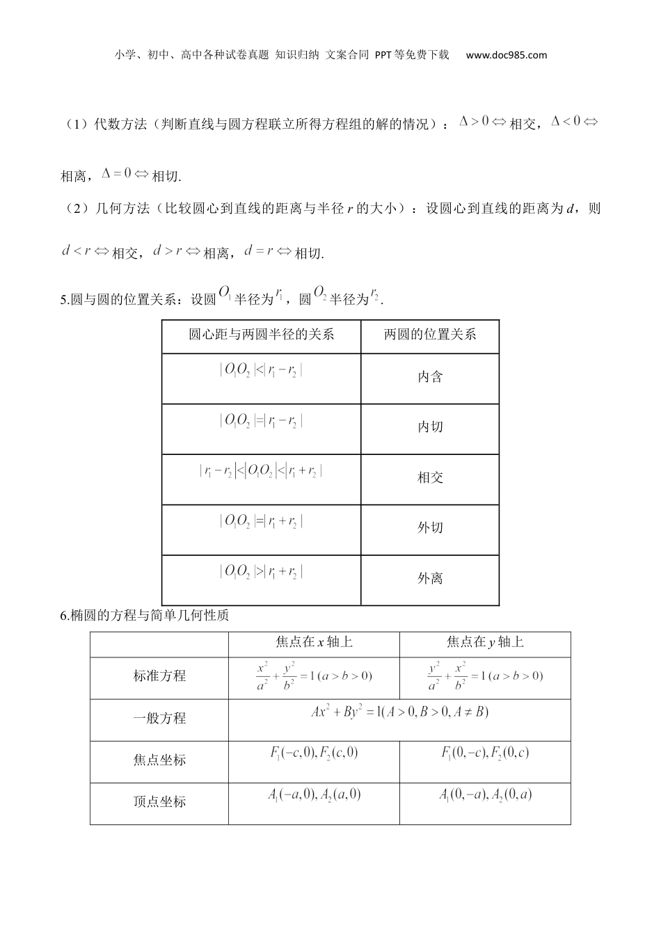 小学、初中、高中各种试卷真题知识归纳文案合同PPT等免费下载www.doc985.com(8)平面解析几何——2025届高考数学二轮复习易错重难提升【新高考版】易混重难知识1.两条直线平行与垂直的判定:设两条直线的斜率分别为.(1);(2).2.直线的方程:(1)点斜式:.(2)斜截式:.(3)两点式:.(4)截距式:.(5)一般式:(A,B不同时为0).3.直线的交点坐标与距离公式①一般地,将两条直线的方程联立,得方程组,若方程组有唯一解,则两条直线相交,此解就是交点的坐标;若方程组无解,则两条直线无公共点,此时两条直线平行.②两点间的距离公式.③点到直线的距离:点到直线的距离.④两条平行直线间的距离:若直线的方程分别为,,则两平行线的距离.4.判断直线与圆的位置关系的方法:小学、初中、高中各种试卷真题知识归纳文案合同PPT等免费下载www.doc985.com(1)代数方法(判断直线与圆方程联立所得方程组的解的情况):相交,相离,相切.(2)几何方法(比较圆心到直线的距离与半径r的大小):设圆心到直线的距离为d,则相交,相离,相切.5.圆与圆的位置关系:设圆半径为,圆半径为.圆心距与两圆半径的关系两圆的位置关系内含内切相交外切外离6.椭圆的方程与简单几何性质焦点在x轴上焦点在y轴上标准方程一般方程焦点坐标顶点坐标小学、初中、高中各种试卷真题知识归纳文案合同PPT等免费下载www.doc985.com范围长轴长短轴长焦距离心率,越接近于1,椭圆越扁;越接近于0,椭圆越圆7.双曲线的几何性质焦点在x轴上焦点在y轴上标准方程焦点坐标顶点坐标范围对称性关于x轴、y轴对称,关于原点对称实、虚轴长实轴长为,虚轴长为离心率双曲线的焦距与实轴长的比渐近线方程8.抛物线的几何性质标准方程范围小学、初中、高中各种试卷真题知识归纳文案合同PPT等免费下载www.doc985.com准线焦点对称性关于x轴对称关于y轴对称顶点离心率焦半径长焦点弦长易错试题提升1.过点且与直线垂直的直线方程为()A.B.C.D.2.在平面直角坐标系xOy中,已知A是圆上的一点,B,C是圆上的两点,则的最大值为()A.B.C.D.3.已知双曲线的离心率为2,左、右焦点分别为,,到渐近线的距离为3,过的直线轴,与双曲线C的右支交于A,B两点,则的面积为()小学、初中、高中各种试卷真题知识归纳文案合同PPT等免费下载www.doc985.comA.9B.24C.36D.724.已知F为椭圆的右焦点,P为C上一点,Q为圆上一点,则的最小值为()A.B.C.D.5.已知抛物线的焦点为,,点是抛物线C上一动点,则的最小值是()A.3B.5C.7D.86.已知椭圆的左右焦点为,,P为椭圆C上一点,,则的面积为()A.B.1C.3D.7.已知抛物线的焦点为F,过点F作两条互相垂直的直线,,且直线,分别与抛物线C交于A,B和D,E,则四边形ADBE面积的最小值是()A.32B.64C.128D.2568.F是双曲线的左焦点,O是坐标原点,直线与双曲线C的左、右两支分别交于P,Q两点,且,则双曲线的离心率为()A.B.C.D.9.(多选)已知椭圆的左、右焦点分别为,上顶点为,小学、初中、高中各种试卷真题知识归纳文案合同PPT等免费下载www.doc985.com离心率为,若M,N为C上关于原点对称的两点,则()A.C的标准方程为B.C.D.四边形的周长随MN的变化而变化10.(多选)已知O为坐标原点,点F为抛物线的焦点,点,直线交抛物线C于A,B两点(不与P点重合),则以下说法正确的是()A.B.存在实数m,使得C.若2AFFB�,则24mD.若直线PA与PB的倾斜角互补,则2m11.已知圆关于直线对称,圆C交y于A,B两点,则________12.已知抛物线的焦点为F,,过点M作直线的垂小学、初中、高中各种试卷真题知识归纳文案合同PPT等免费下载www.doc985.com线,垂足为Q,点P是抛物线C上的动点,则的最小值为______________.13.已知椭圆,C的上顶点为A,两个焦点为,,离心率为.过且垂直于的直线与C交于D,E两点,的周长是13,则____________.14.已知双曲线2222:1(0,0)xyCabab的离心率为2,右焦点为2,0F.(1)求双曲线C的标准方程.(2)过点F的直线l与双曲线C的右支交于A,B两点,在x轴上是否存在点P,使得为定值?若存在.求出该定值;若不存在,请说明理由.15.已知椭圆的离心率为,A、C分别是E的上、下顶点,B,D分别是E的左、右...